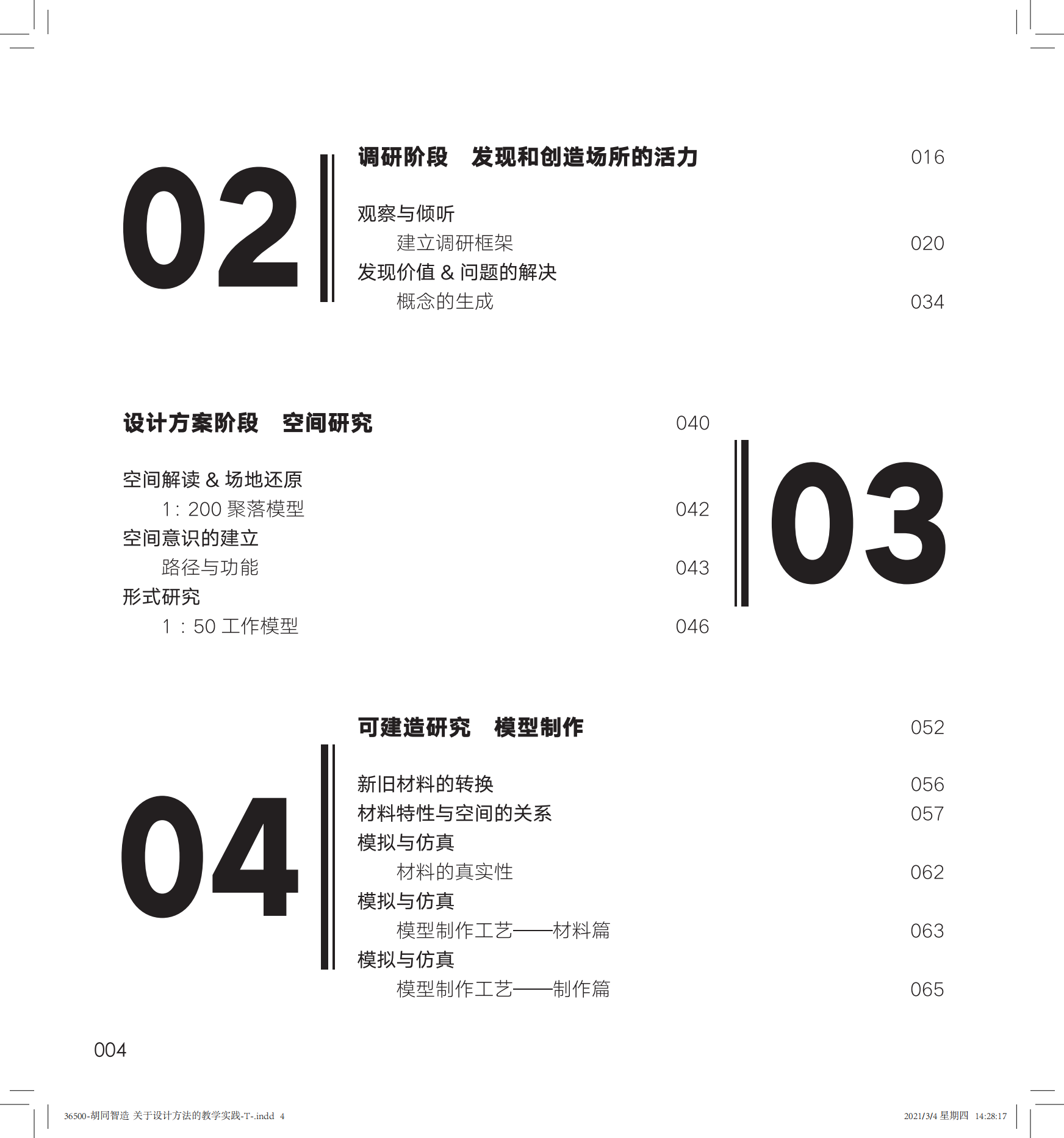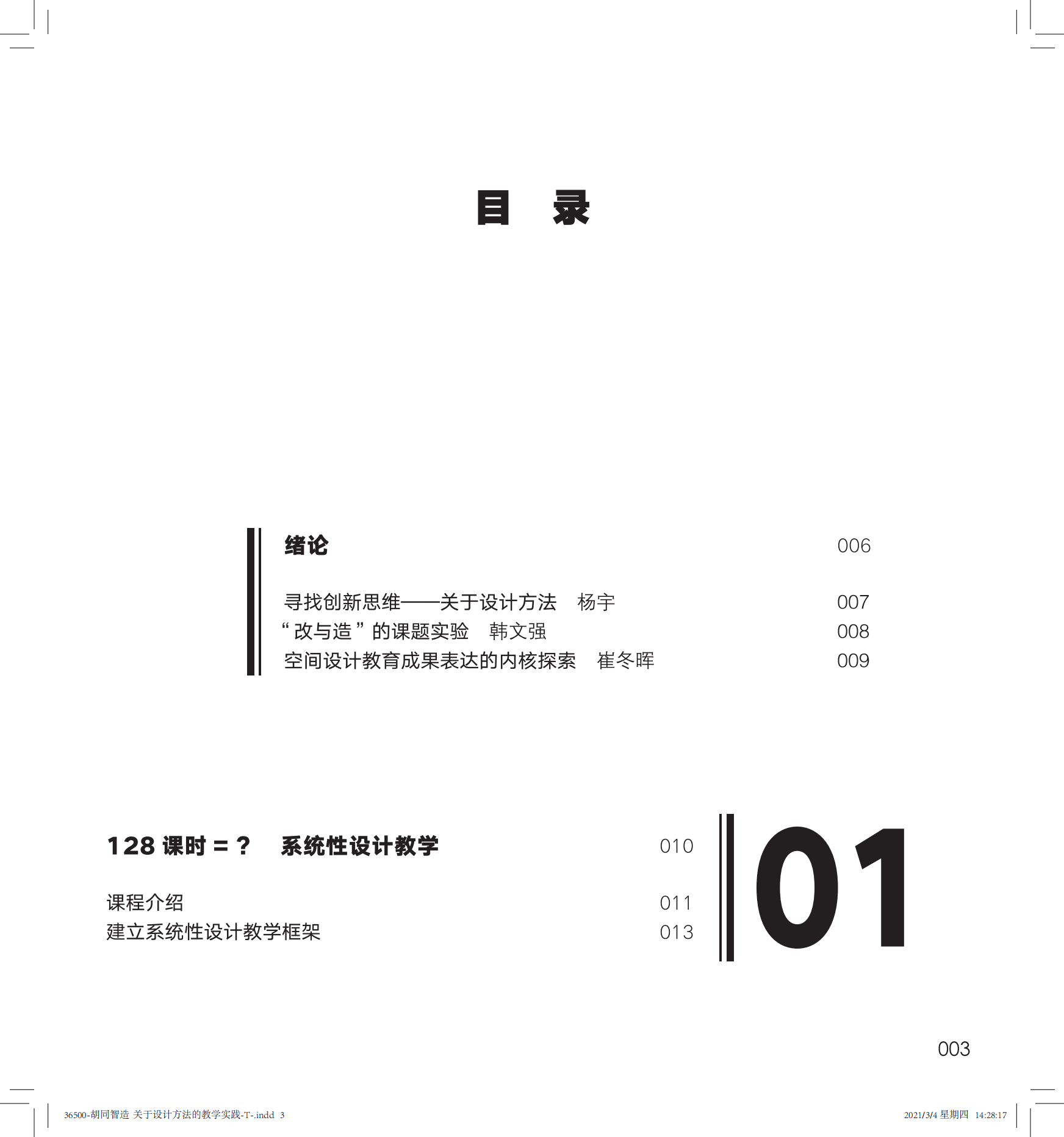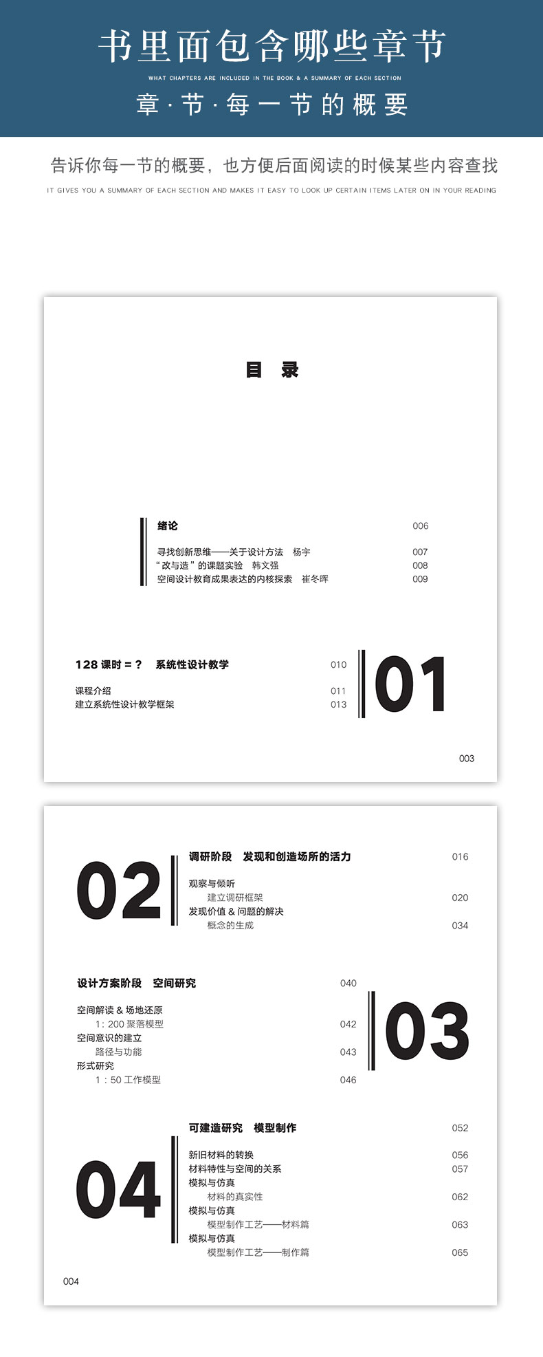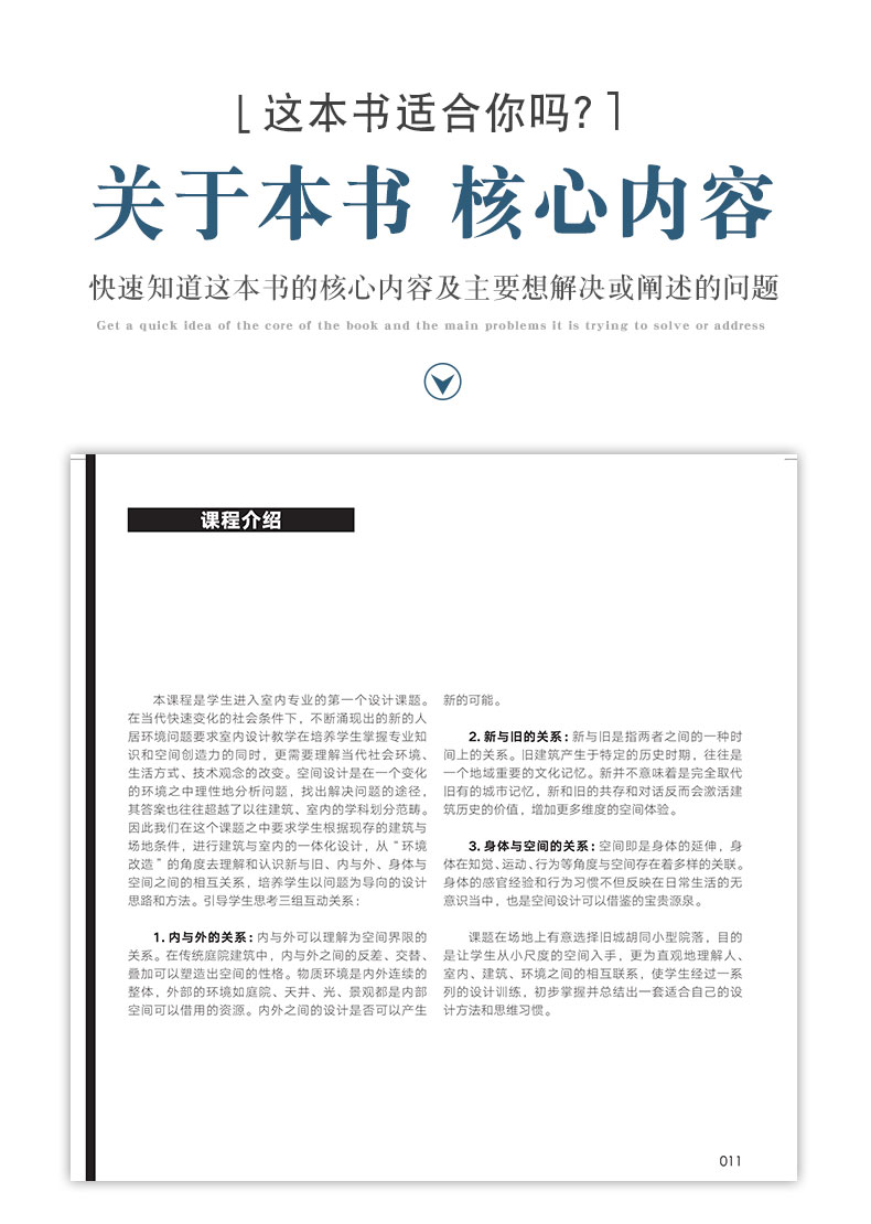 本书涵盖中央美术学院建筑学院室内专业设计的课程教学实践成果。在当代快速变化的社会条件下,不断涌现出的新的人居环境问题要求室内设计教学在培养学生掌握专业知识和空间创造力的同时,更需要理解当代社会环境、生活方式、技术观念的改变。因此课题在实践之中要求学生根据现存的建筑与场地条件,进行建筑与室内的一体化设计,提出了“系统性设计”的概念。从“环境改造”的角度去理解和认识新与旧、内与外、身体与空间之间的相互关系,培养学生以问题为导向的设计思路和方法。具体包括调研阶段-发现和创造场所的活力、设计方案阶段-空间研究、可建造研究-模型制作、检验与表达-空间的二次认知、文本的综合建立与评价-展览与评图等五部分内容。它是一种培养学生解决问题、思维创新和沟通技巧的综合能力的教学方式。系统性设计教学模式是在课程中强调设计环节间的整合。