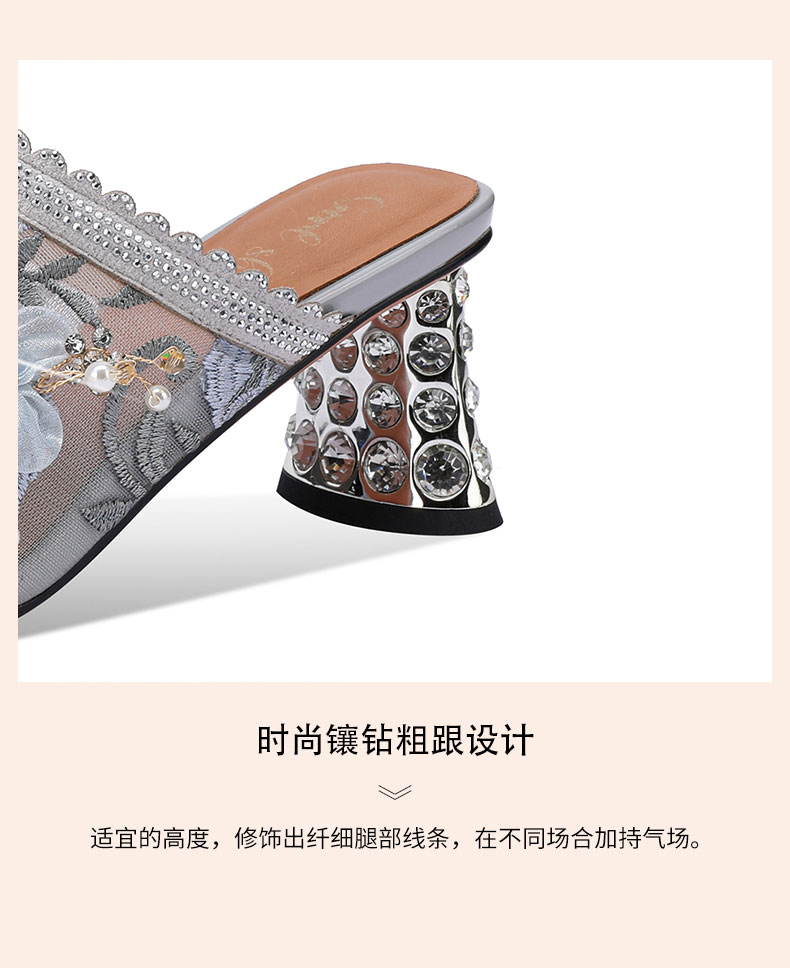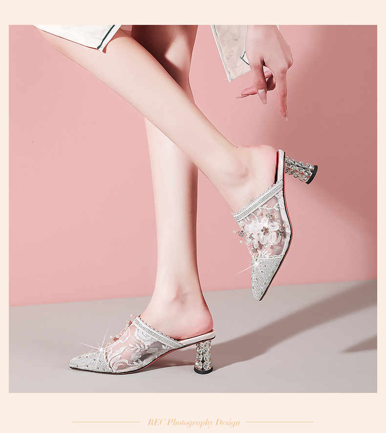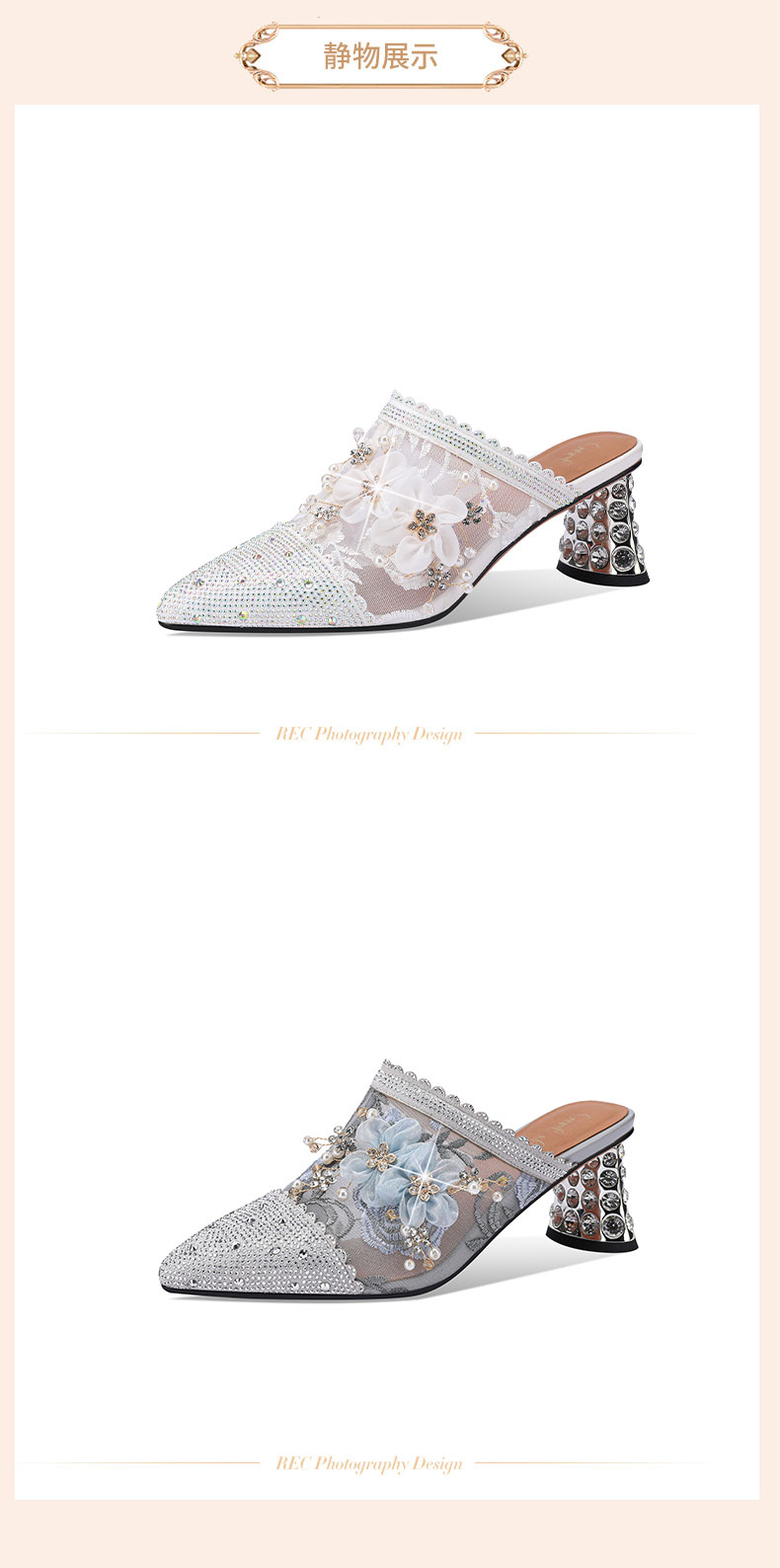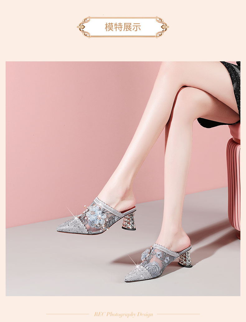 夏季新款,花朵网纱拼接尖头粗跟凉拖YSML-A079-128