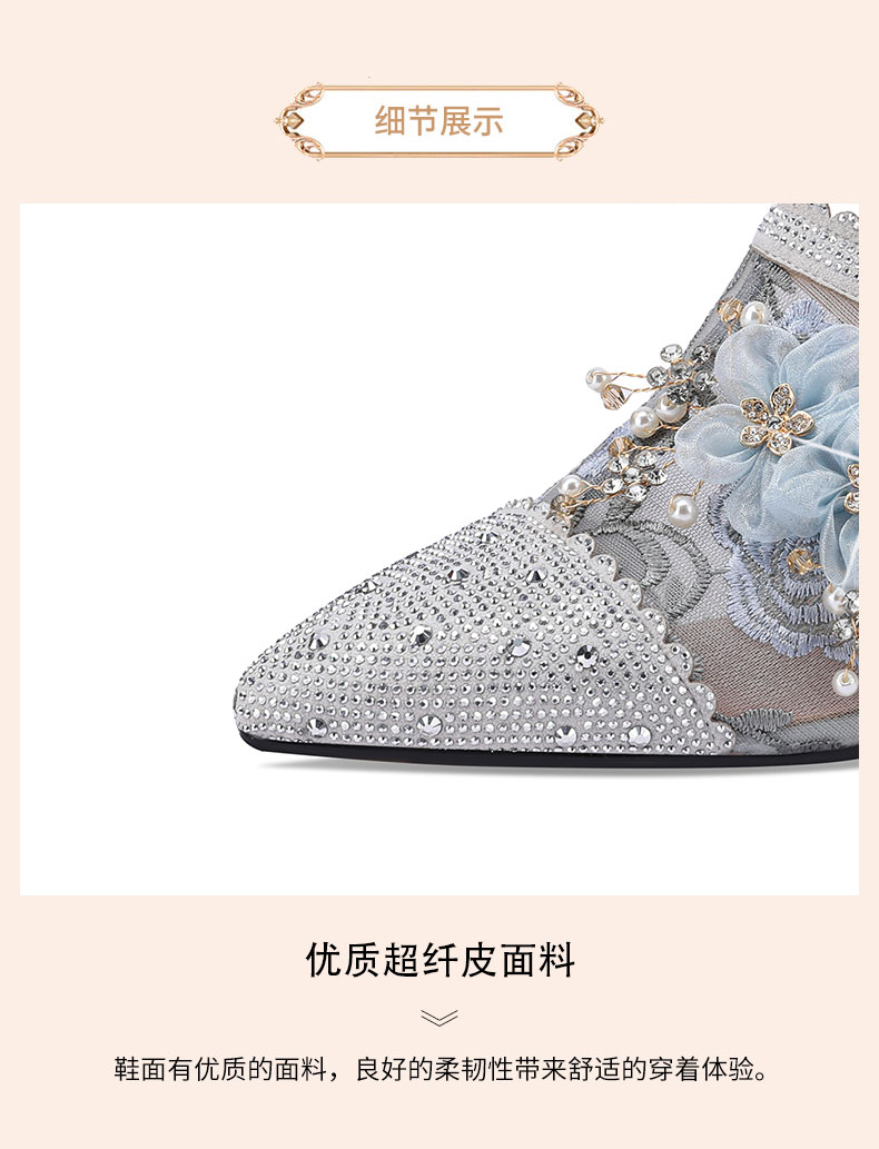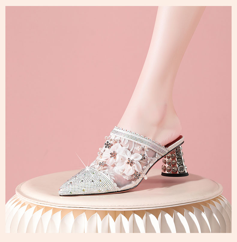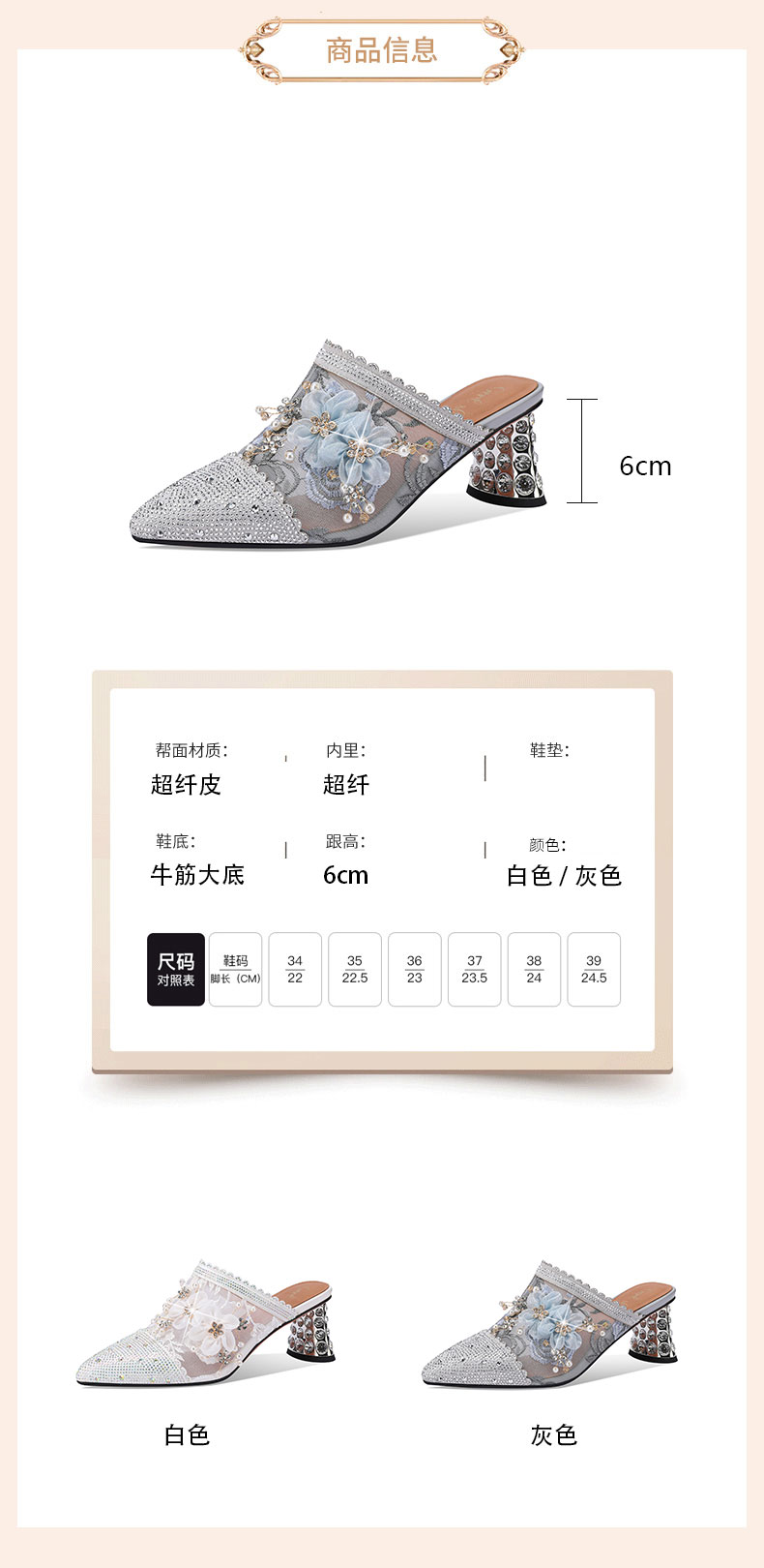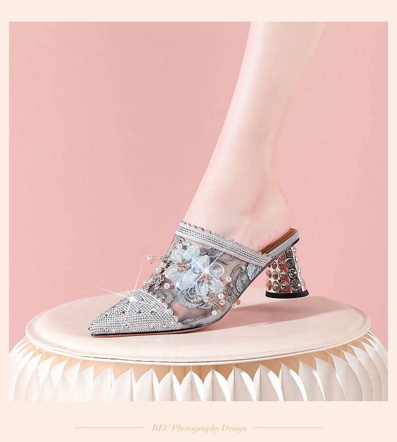 夏季新款,花朵网纱拼接尖头粗跟凉拖YSML-A079-128
