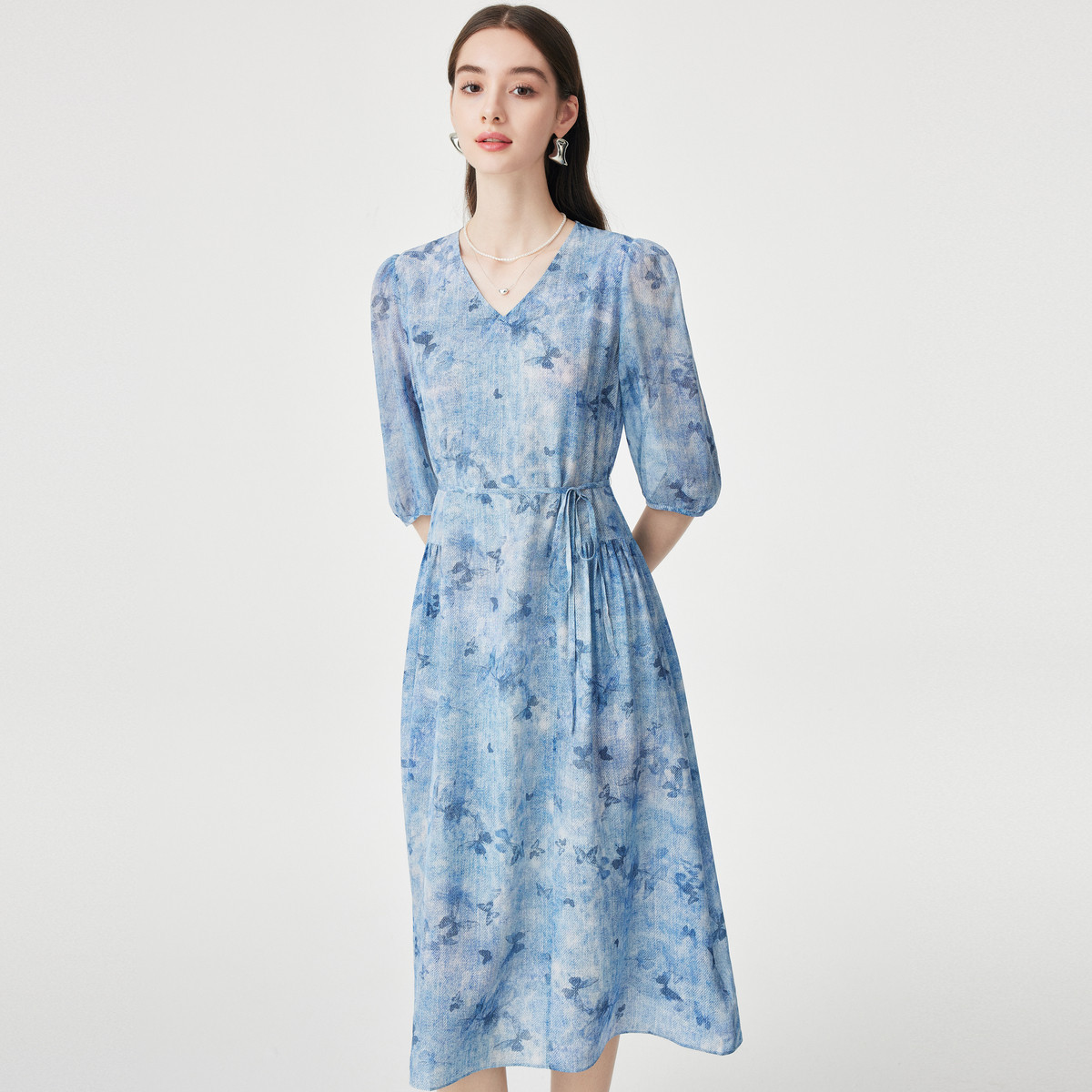 PALUOPO/PL桑蚕丝V领减龄印花优雅气质时尚真丝连衣裙ES250830Z