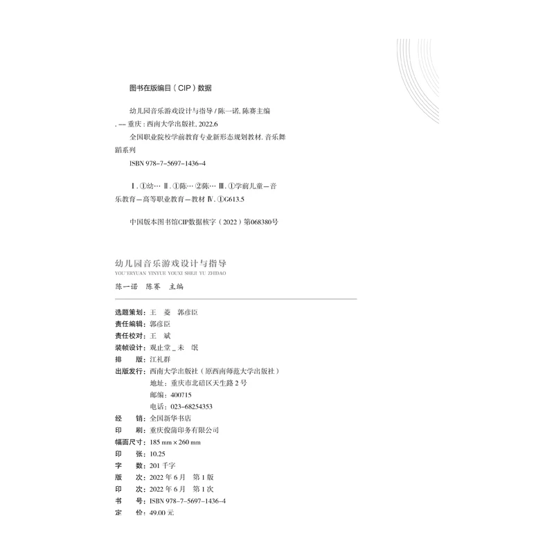 *书名:幼儿园音乐游戏设计与指导 | *ISBN:978-7-5697-1436-4 |