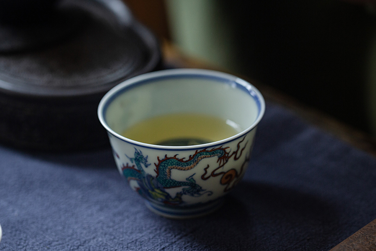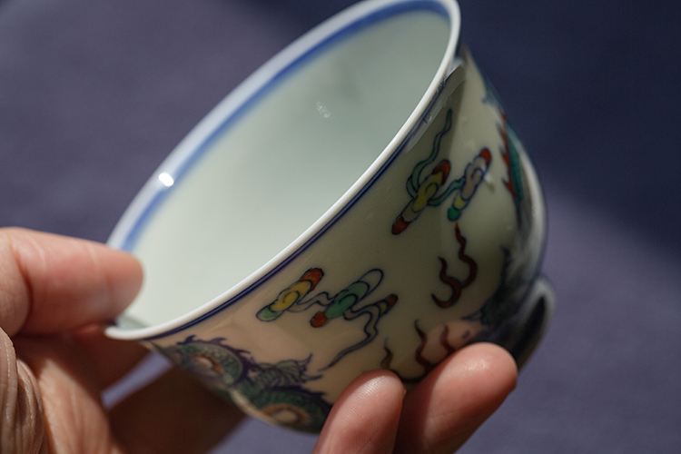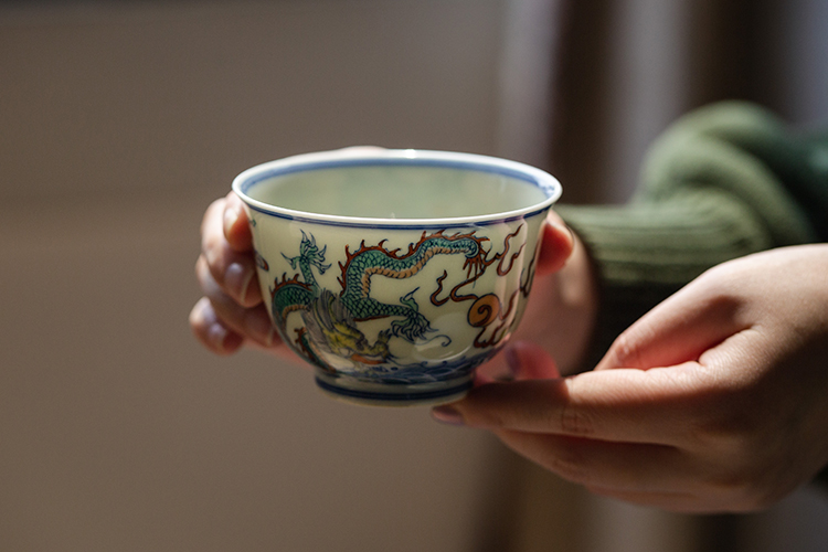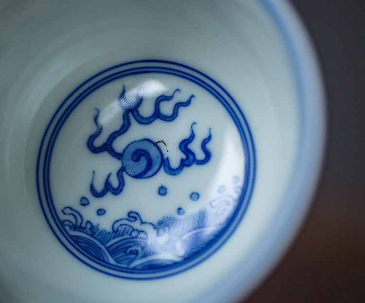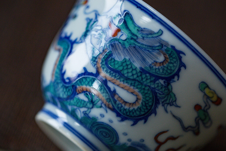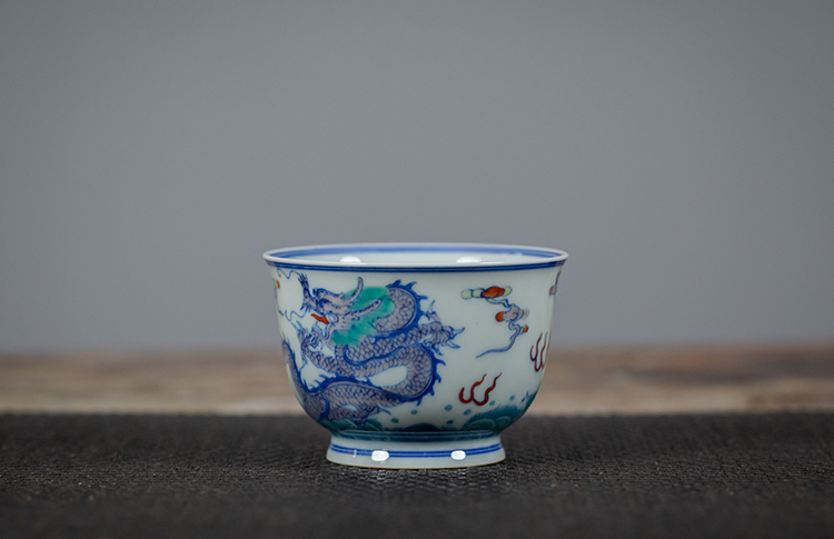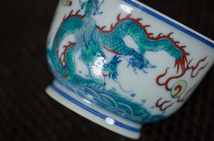 杯壁上,以工笔绘有海上双龙戏珠图。