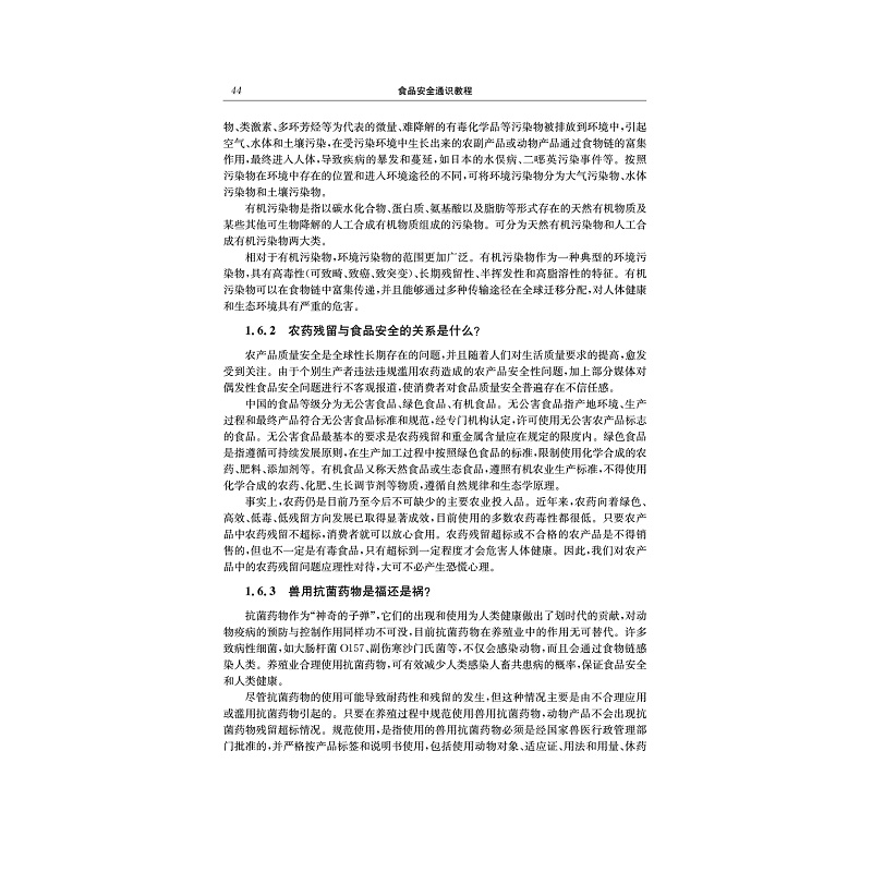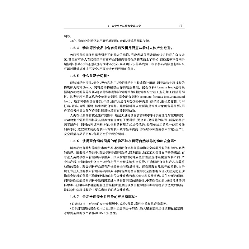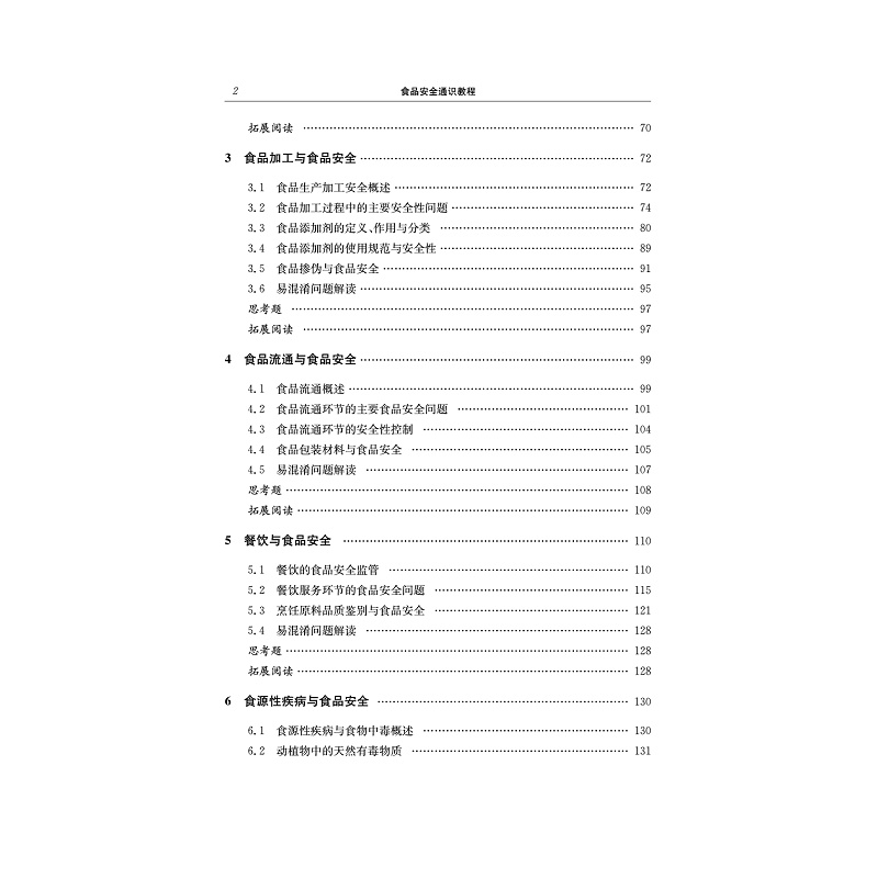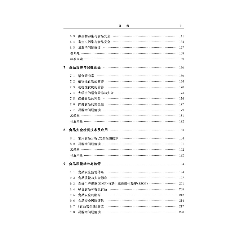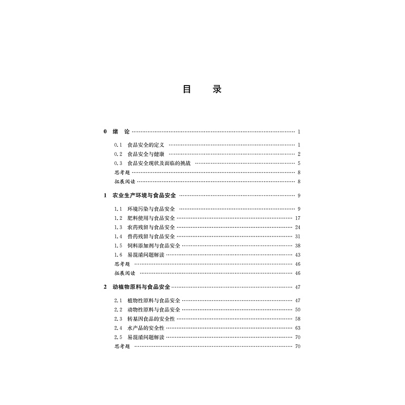 内容涉及农业生产环境与食品安全、动植物原料与食品安全、食品加工与食品安全、食品流通与食品安全、餐饮与食品安全、食源性疾病与食品安全、食品营养与保健食品安全检测技术及应用、食品质量标准与监管、怎样选购安全食品等相关知识。每章主要包括理论阐述、易混淆问题解读、思考题及拓展阅读等。