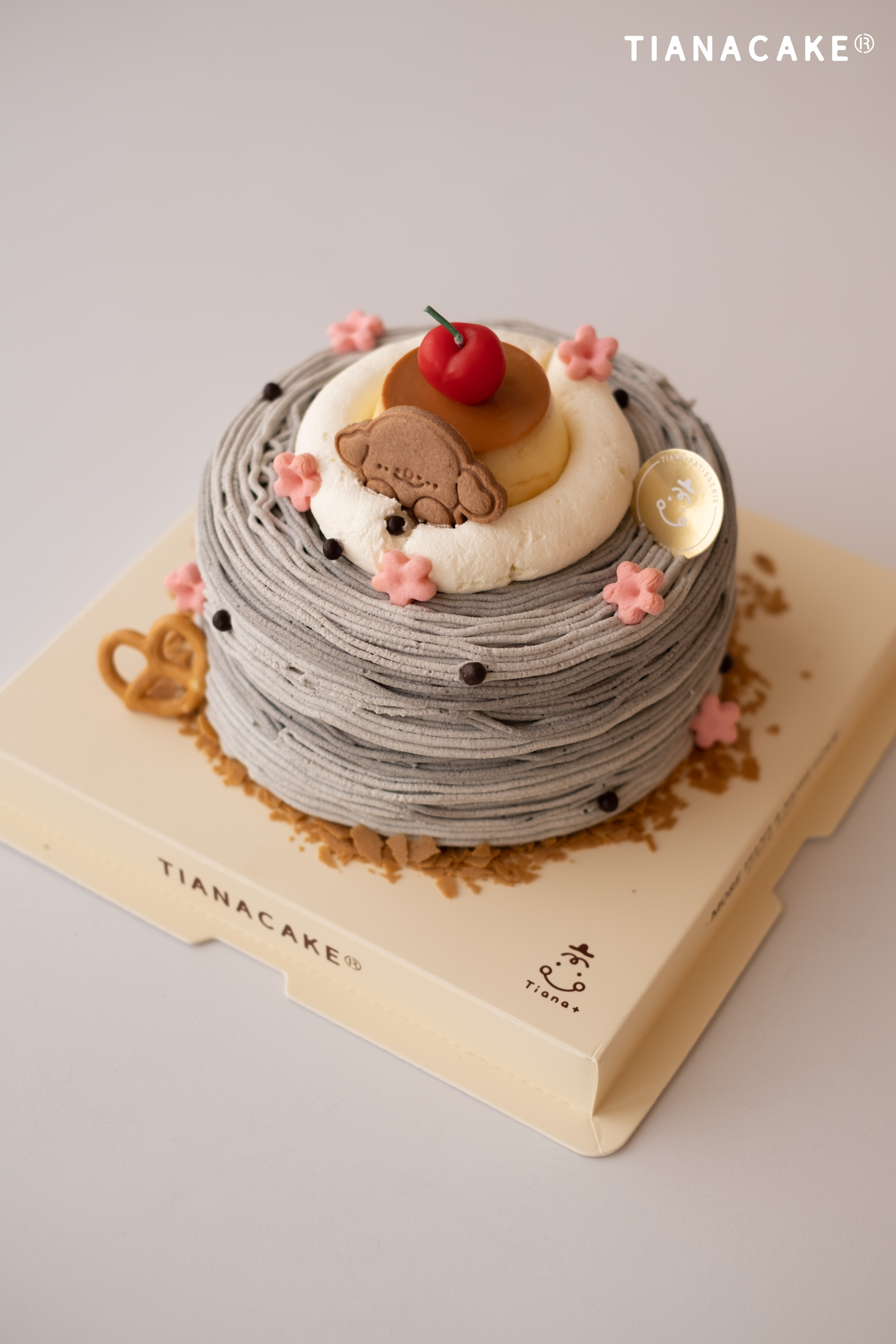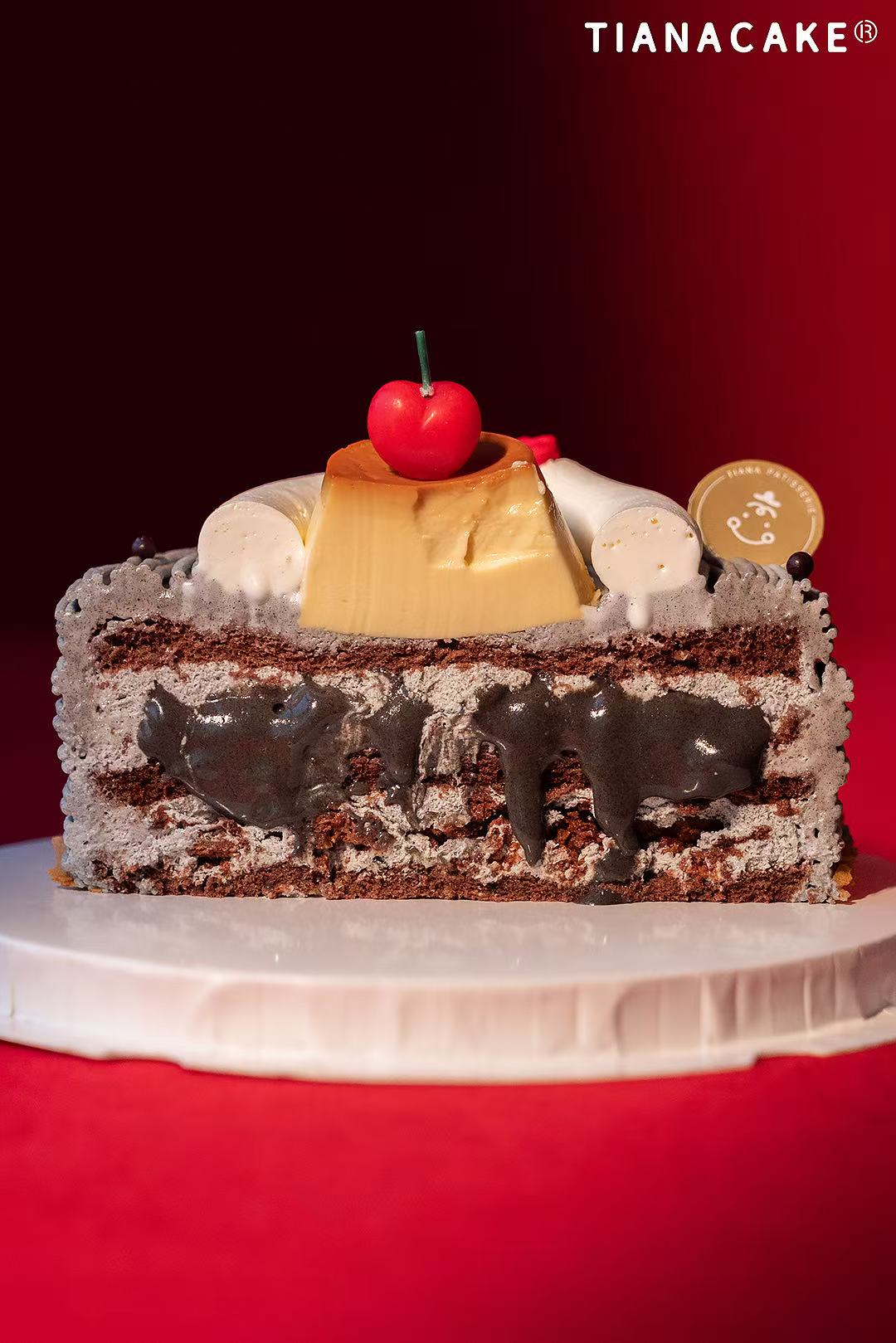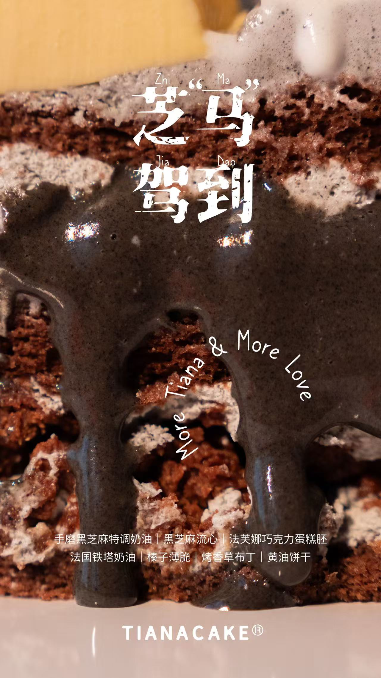 手磨黑芝麻特调奶油 | 黑芝麻流心 | 法芙娜巧克力蛋糕胚 | 法国铁塔奶油 | 榛子薄脆 | 烤香草布丁 | 黄油饼干