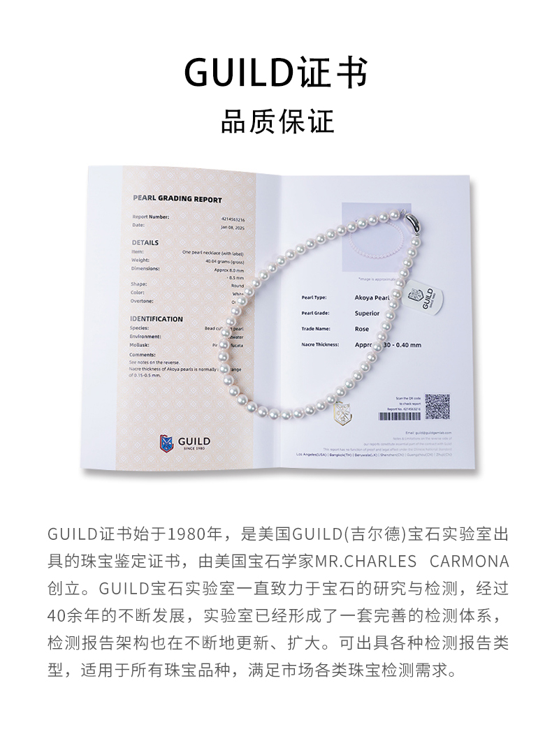 阮仕珍珠 白玫瑰系列S925银日本akoya珍珠项链8-9mm 正圆 微瑕 极强光(吉尔德证书ROSE等级)