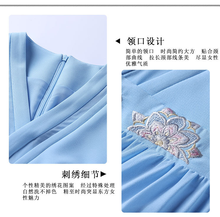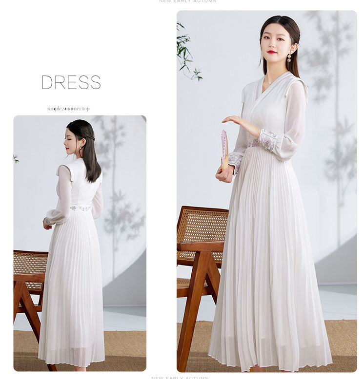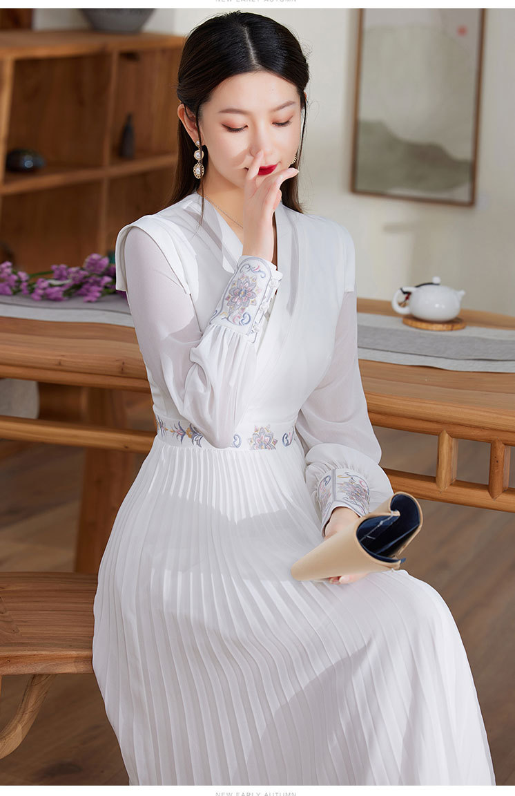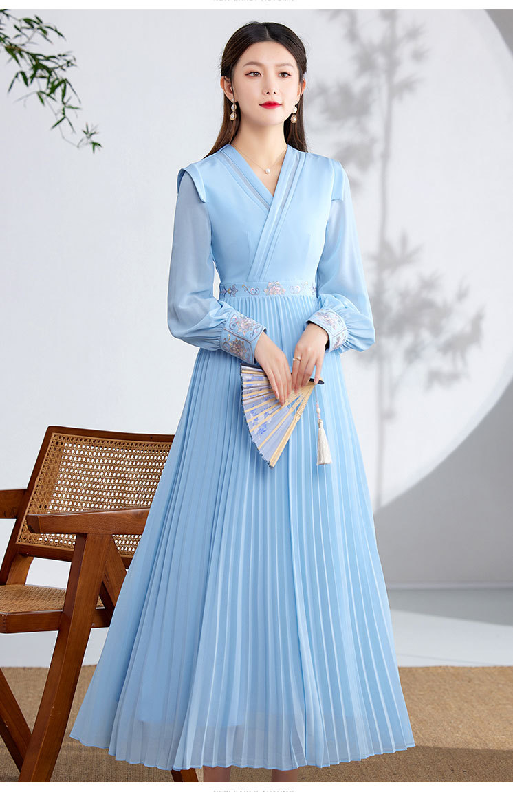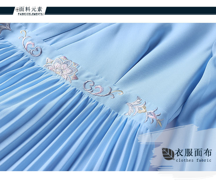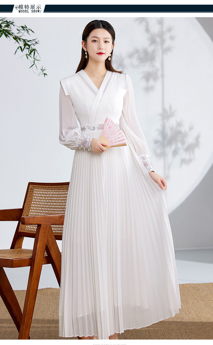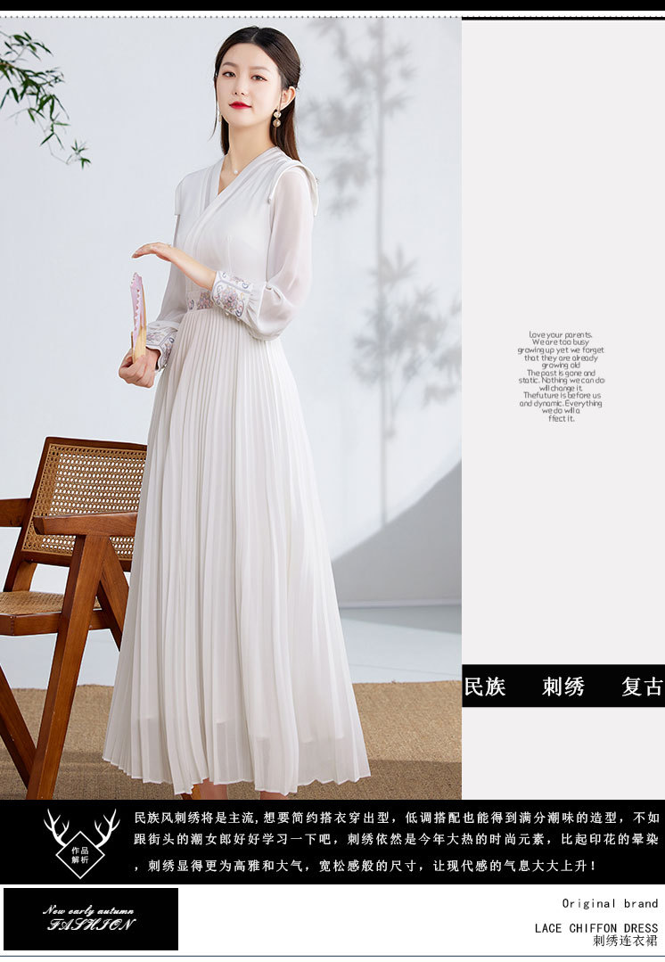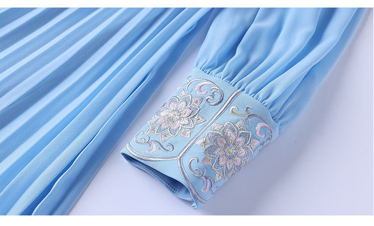 复古民族风,V领刺绣连衣裙百褶裙大摆飘逸裙OG-99896