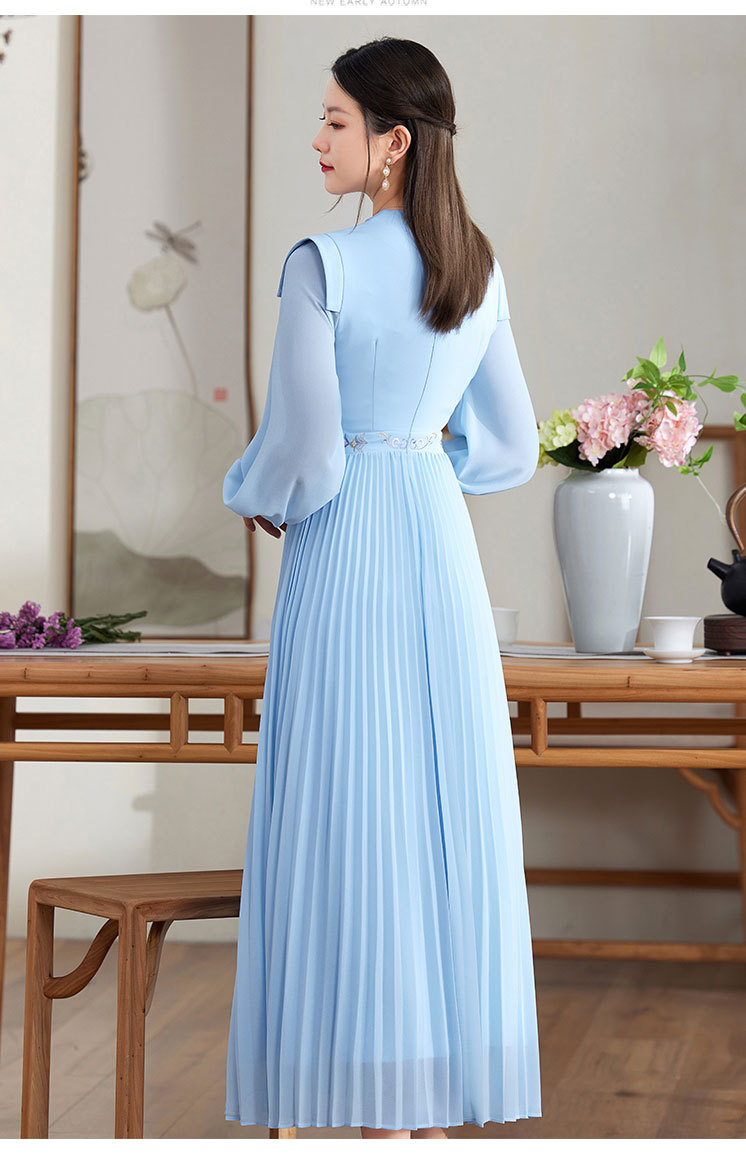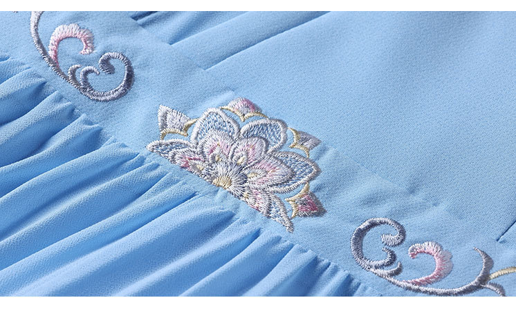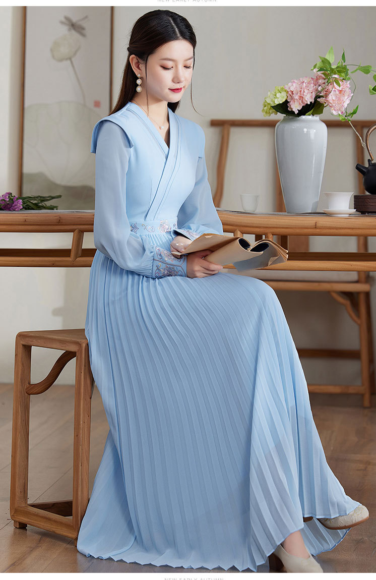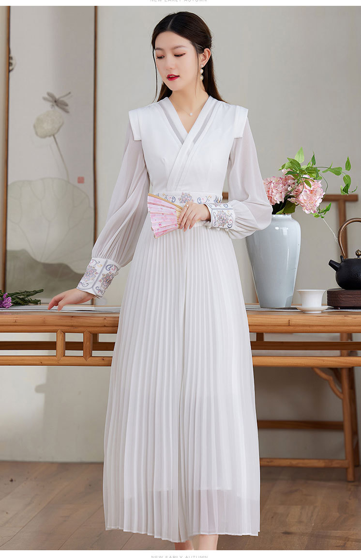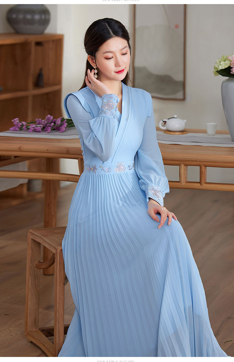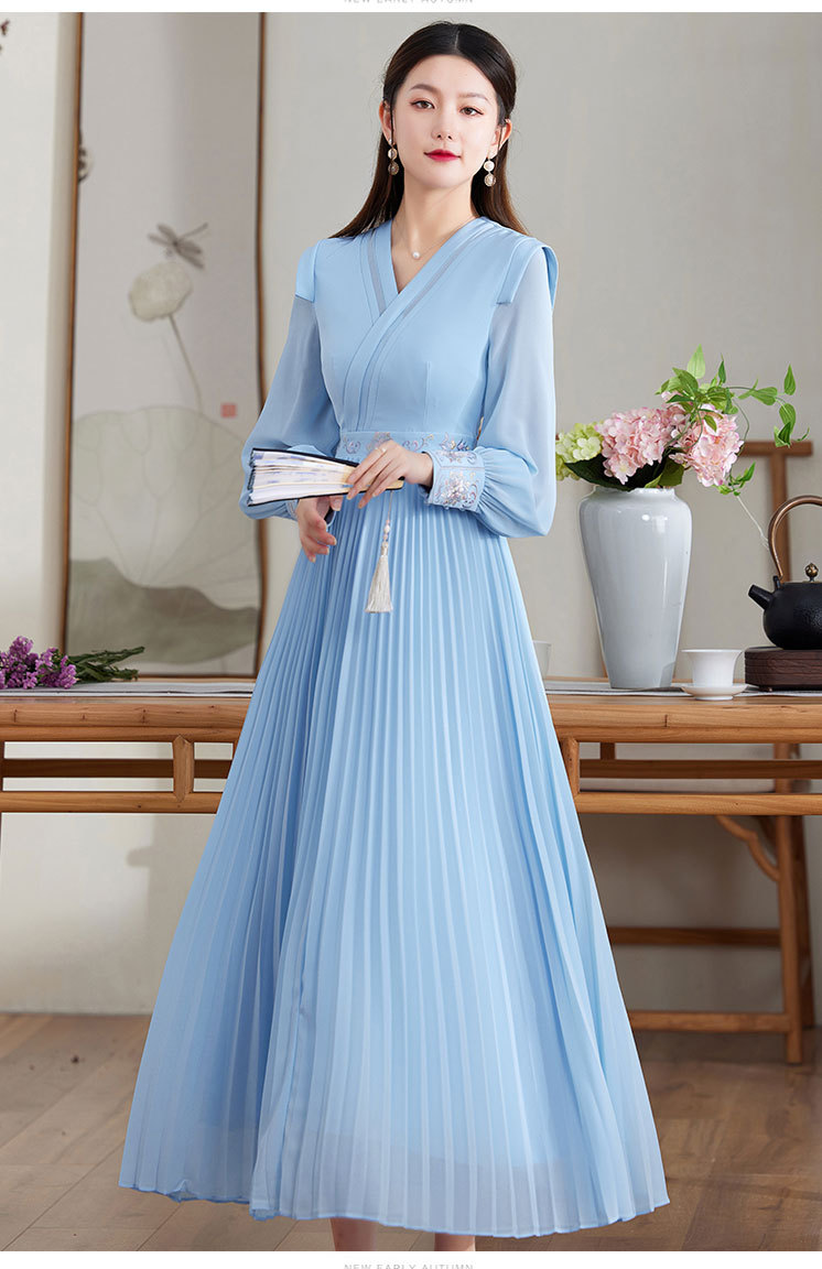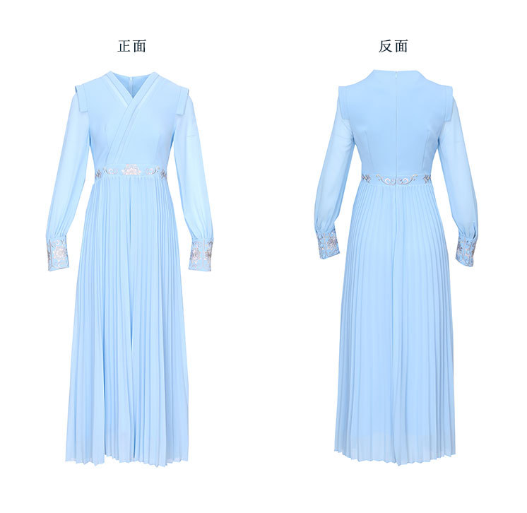复古民族风,V领刺绣连衣裙百褶裙大摆飘逸裙OG-99896