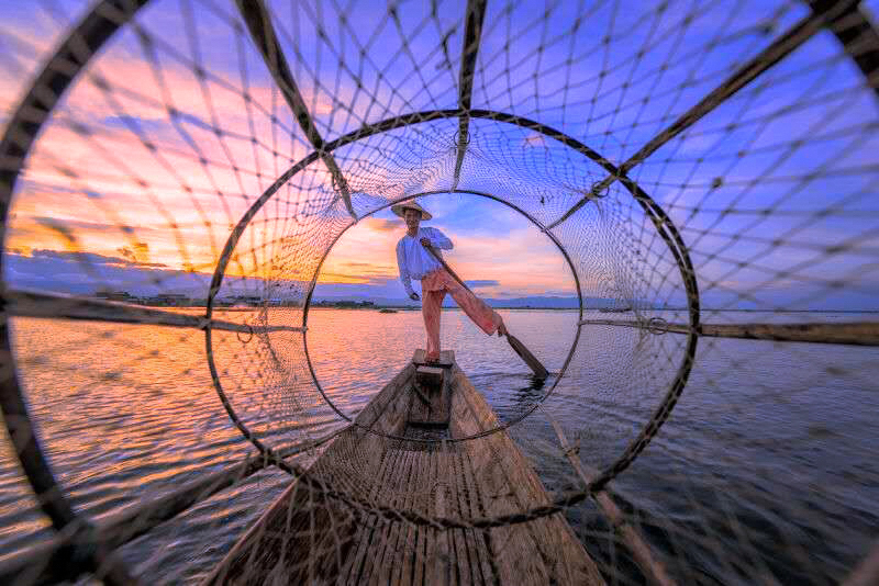 单脚划船的渔夫收起渔网,船桨划过水面,留下一道道涟漪,仿佛在湖面上写下晚安的祝福。