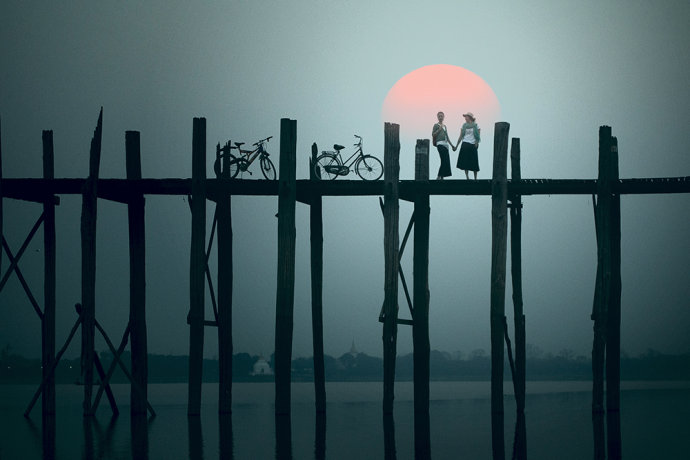 世界上最长的柚木桥,乌本桥的日落剪影 。