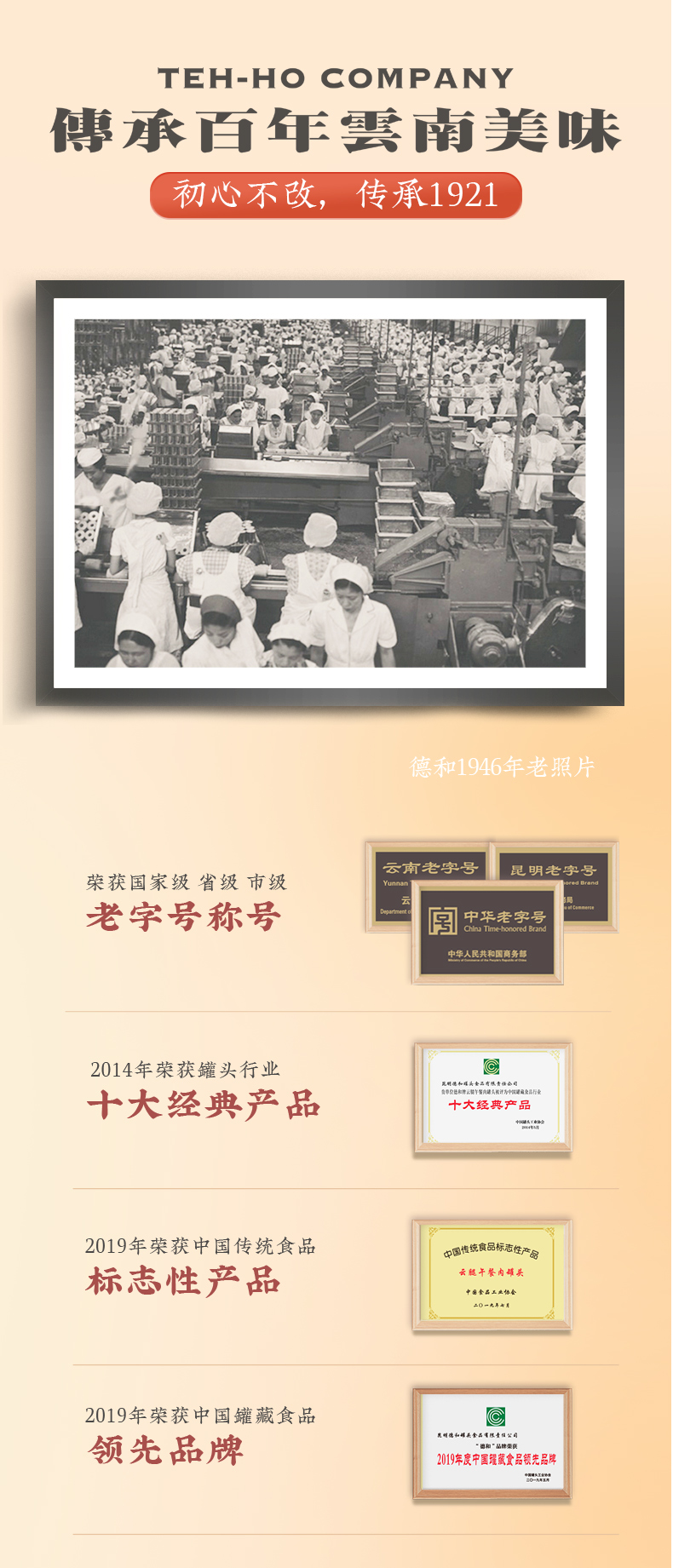 昆明德和罐头厂是中国最早开始生产制造罐头的企业之一,至今已有九十八年的悠久历史,现已形成以罐头食品为主,腌腊制品、糕点月饼等为辅的云南省规模最大和最具影响力综合食品制造企业,奠定了云南罐头行业的基石。