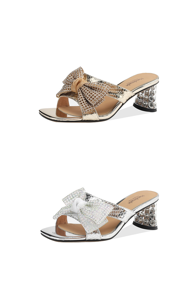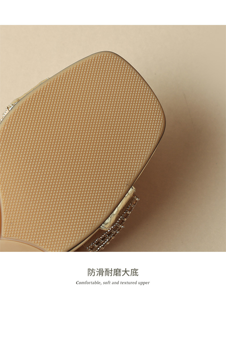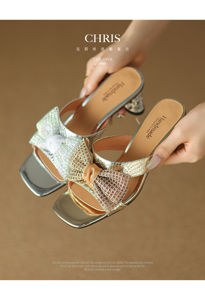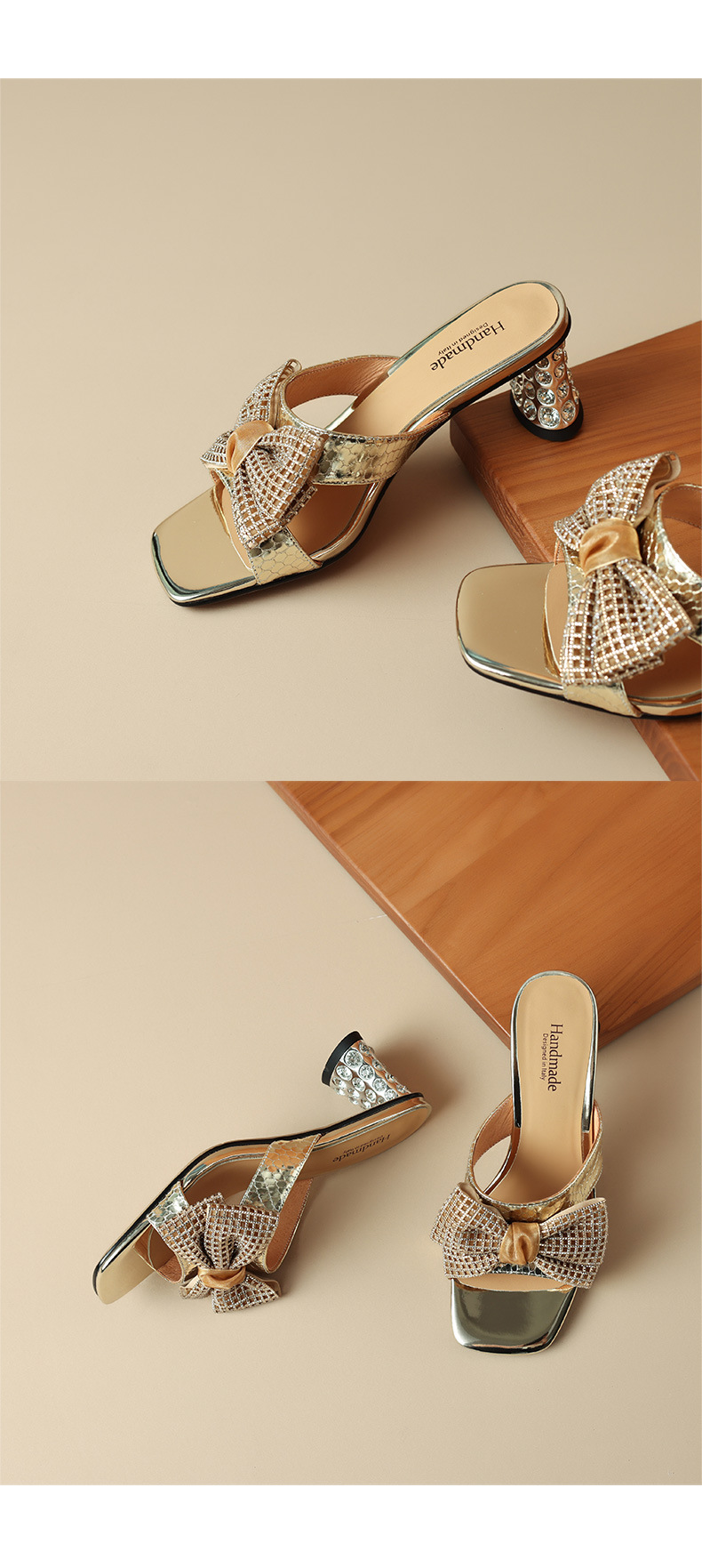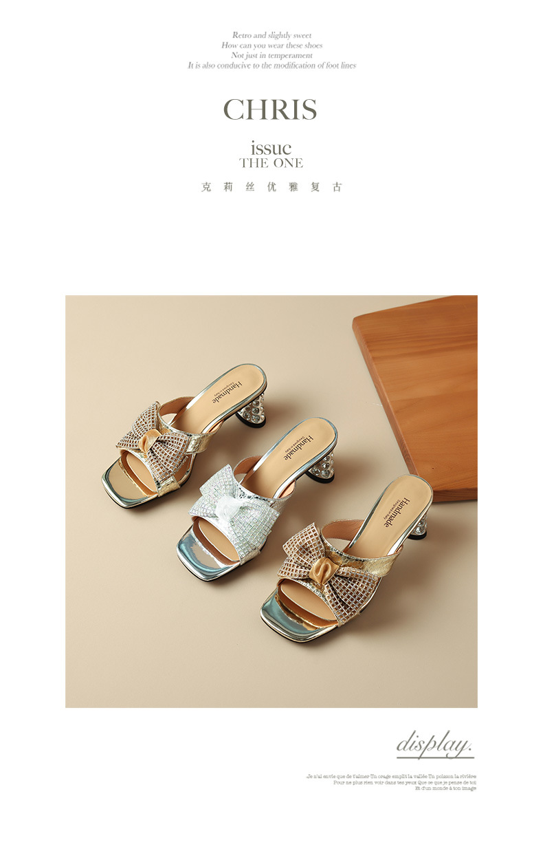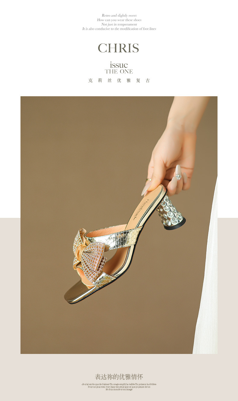 春夏新款,外穿法式蝴蝶结露趾粗跟5cm仙女风一字凉拖鞋LD-6335