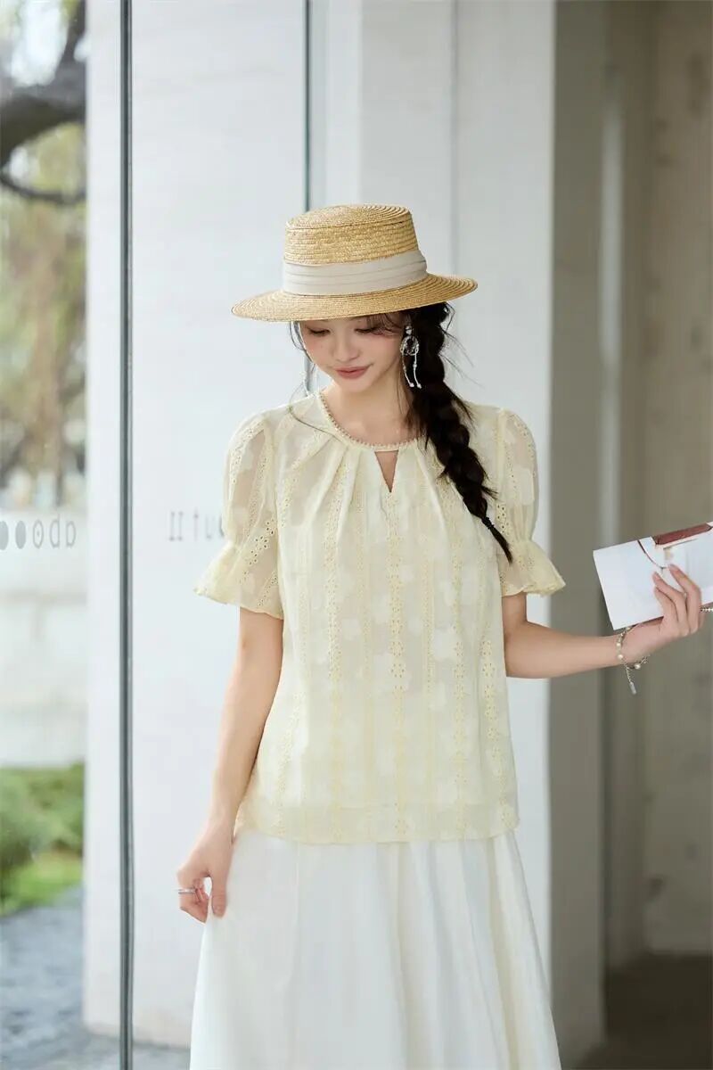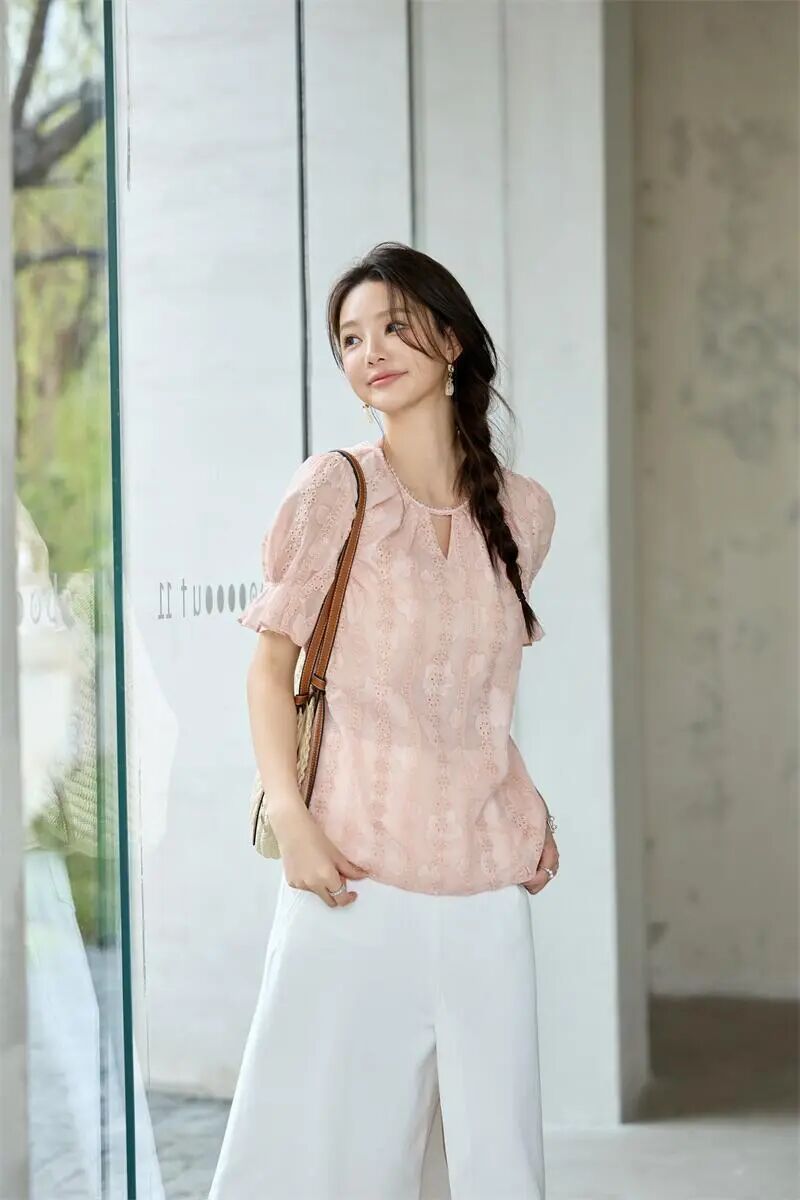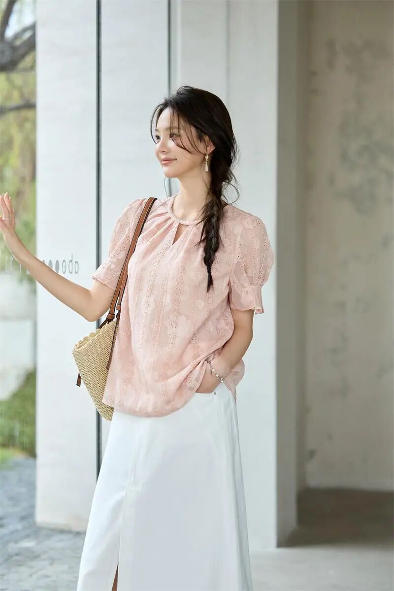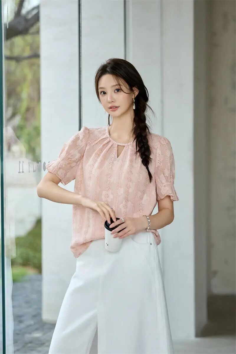 全新升级【铂金会员146/天猫199/差价53】(15550) 洛诗琳2025夏季新款法式薄款温柔短袖上衣粉色T恤上衣