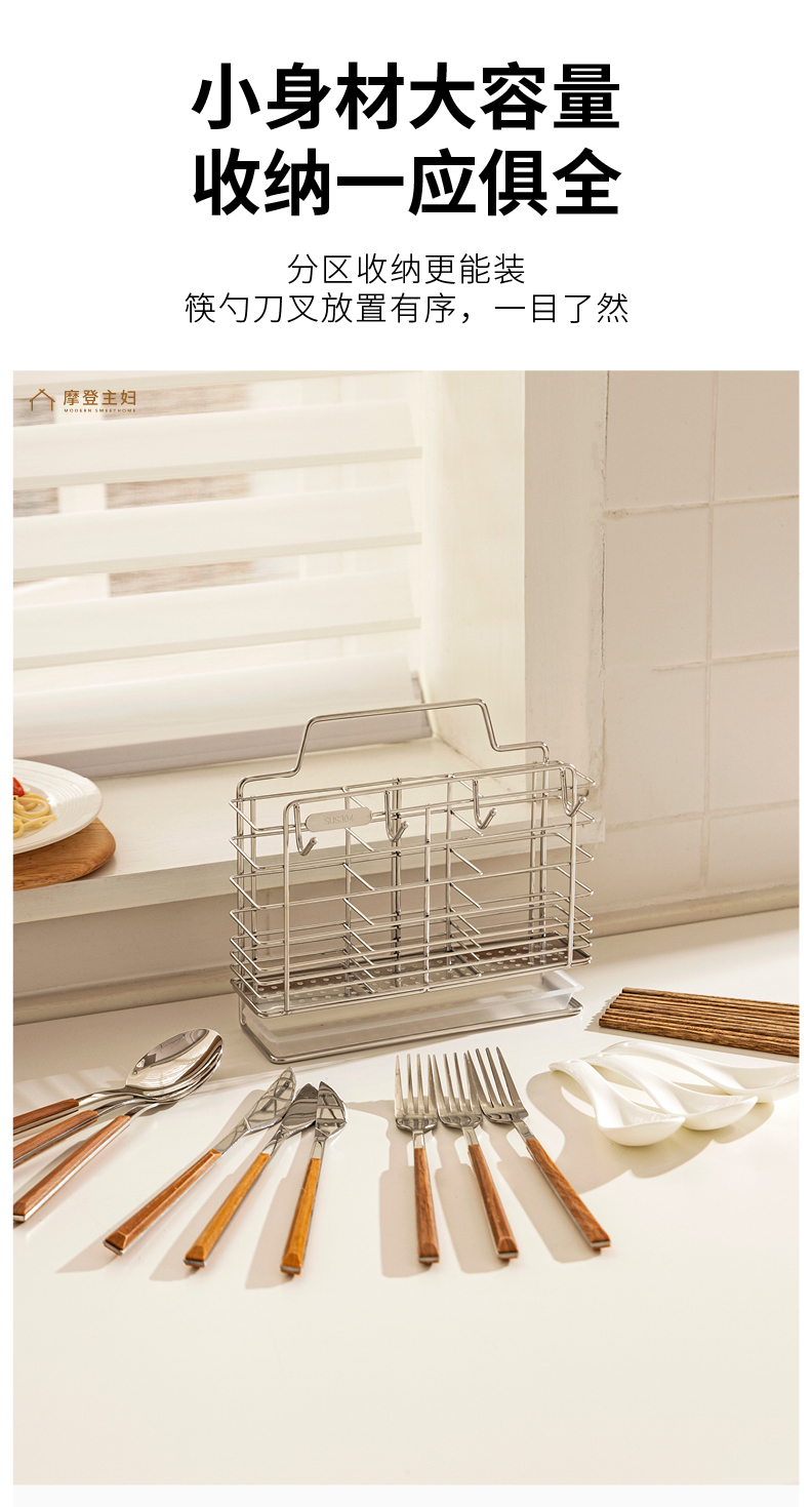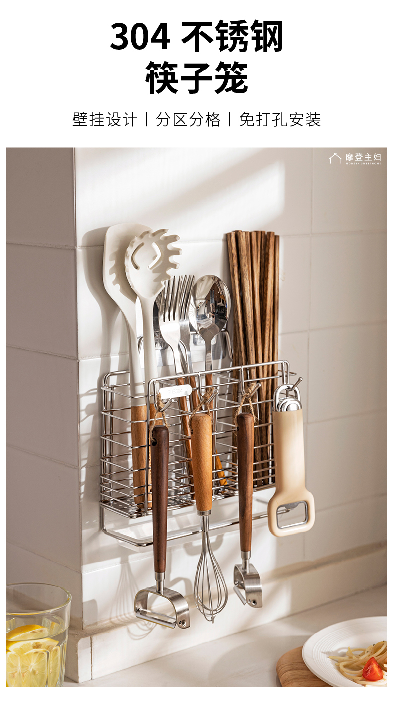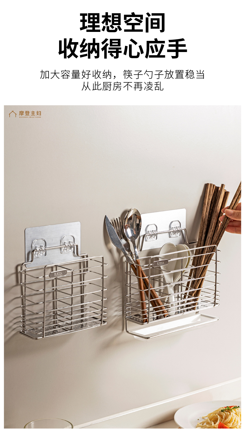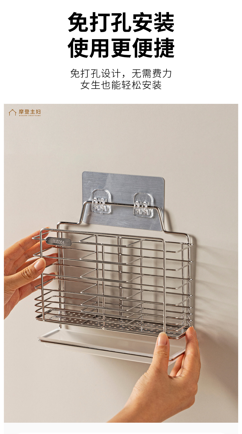摩登主妇筷子收纳盒壁挂免打孔台上家用通风不锈钢沥水筷子笼