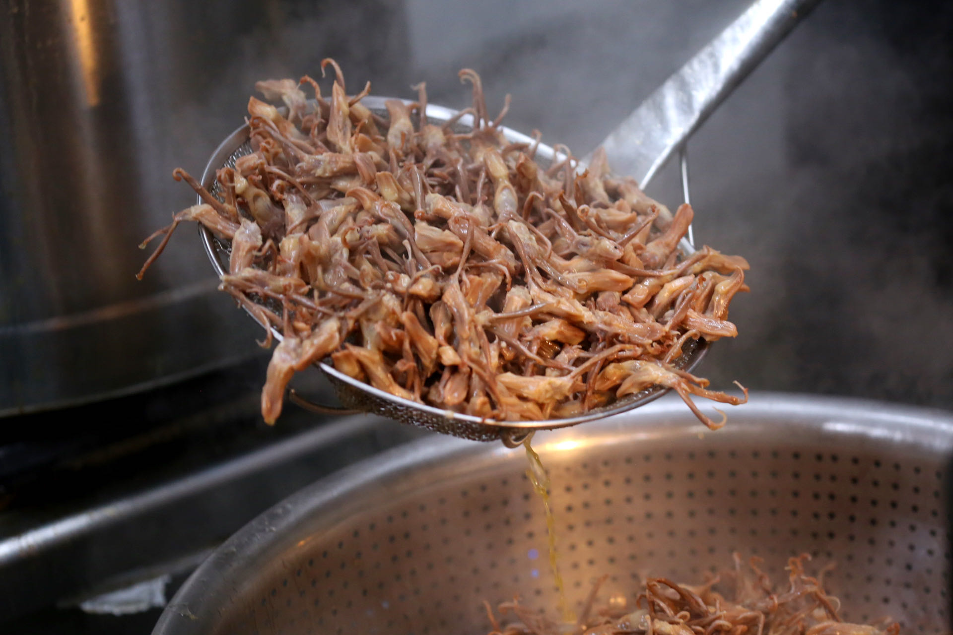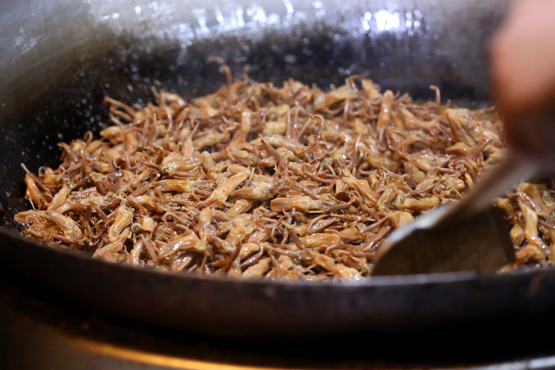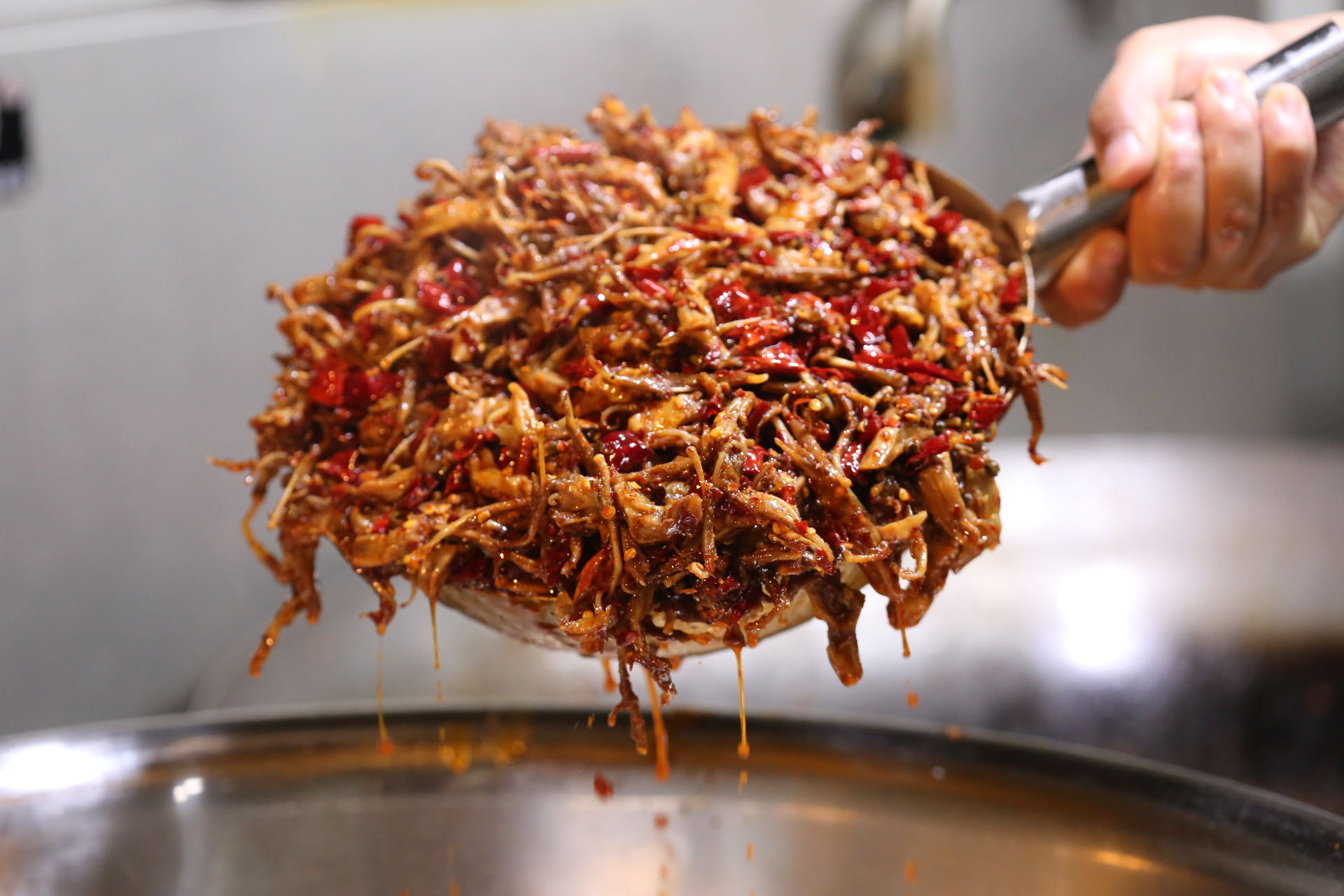 再加以配比好的干辣椒段,选用川贵两地的两种辣椒混合而成。香和辣缺一不可。
