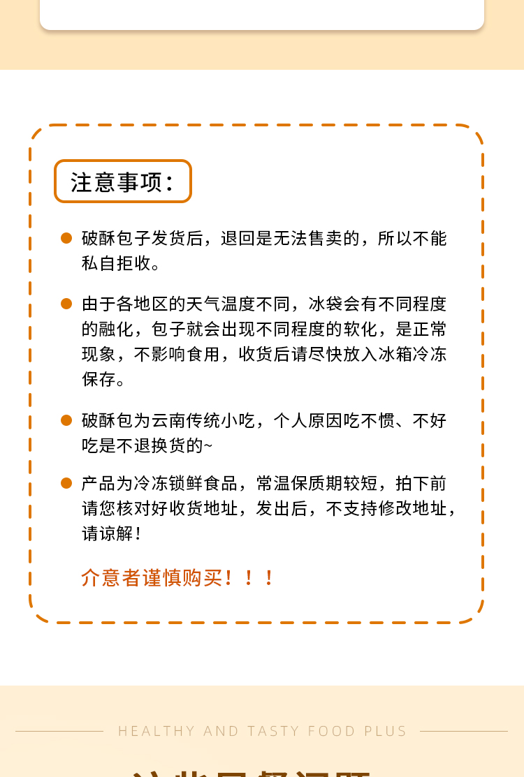 2、破酥包为云南传统小吃,个人原因吃不惯、不好吃是不退换货的~