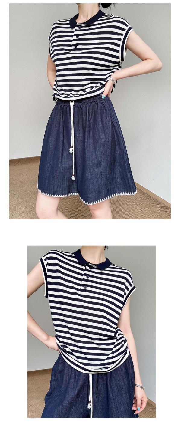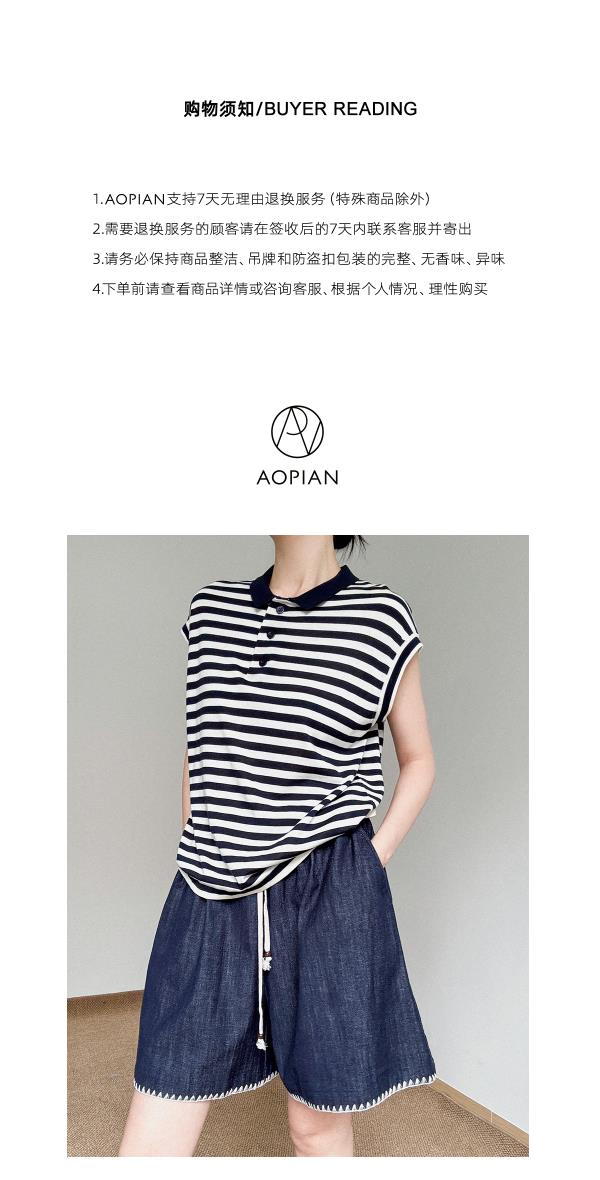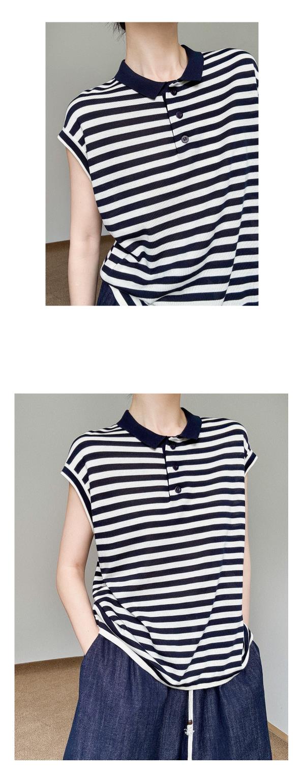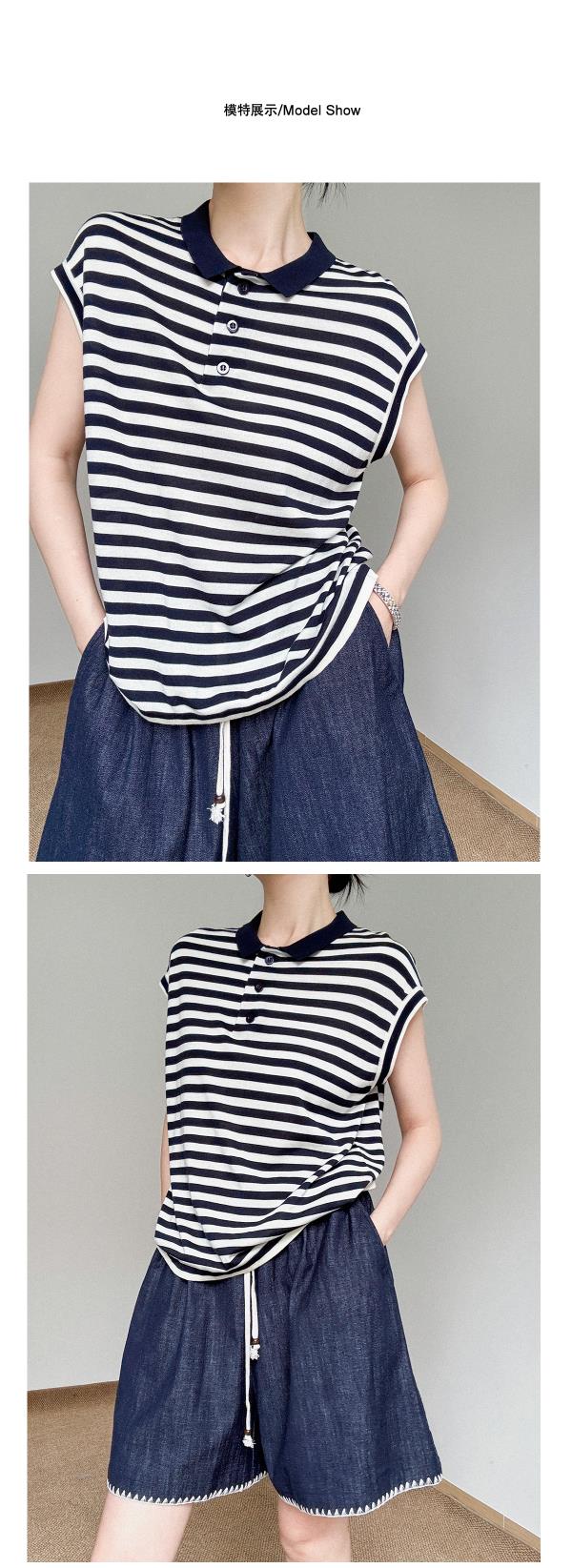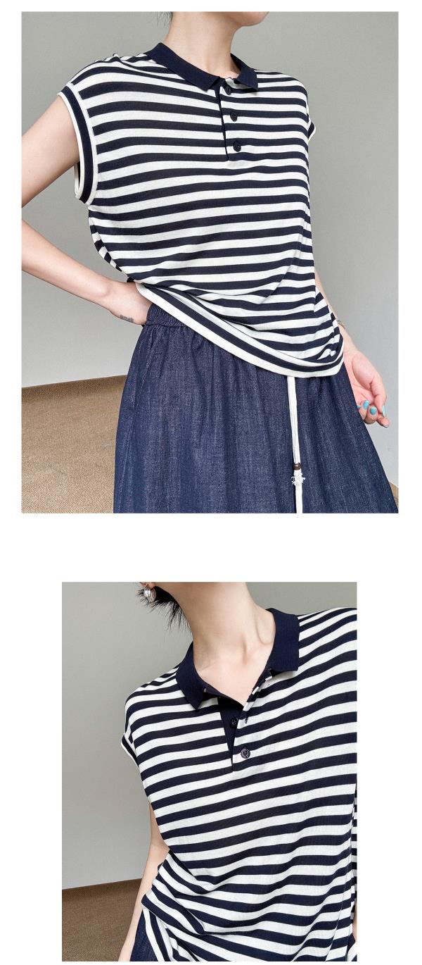 奥篇大王条纹短袖T 天丝真丝混纺纱 小翻领包肩短袖T