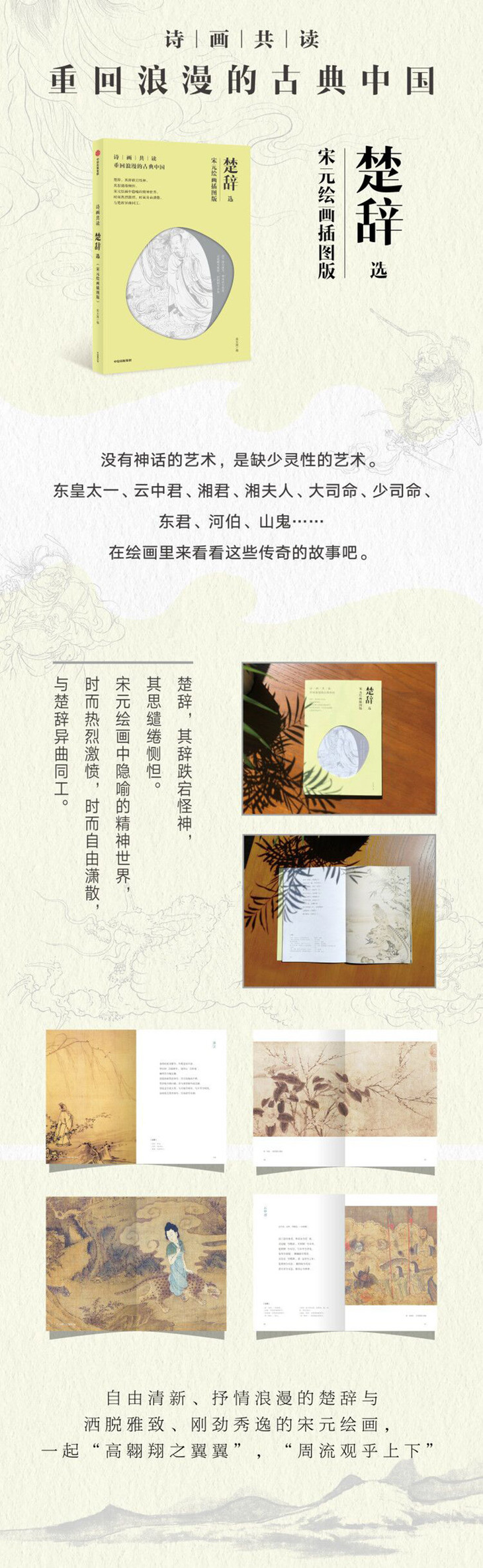 本书精选楚辞与宋元国画,所选词与配图内容可对应。楚辞,也作“楚词”,是先秦屈原在楚地民歌的基础上创作的,具有浓郁楚地特色的一种诗歌题材。宋元绘画中国绘画的高峰时期,不仅是绘画题材、内容、技法达到了历史的高水平,而且是物境、情境、意境,三境的统一阶段。两者从气质上相投,从精神上相合,读者既可通过释文解读诗歌,亦可通过配图进一步深入理解作品。