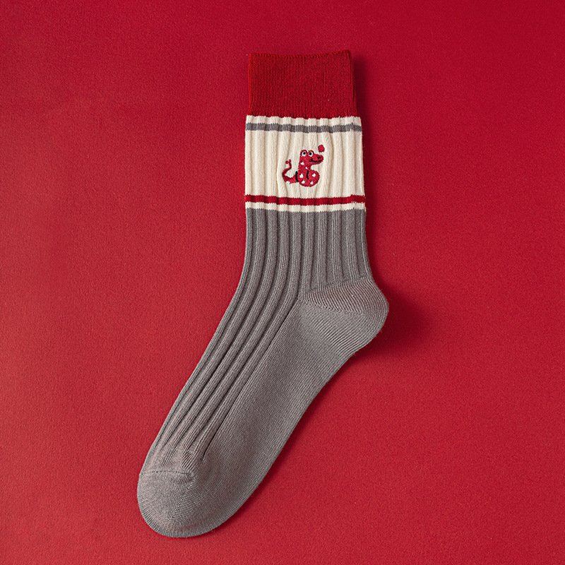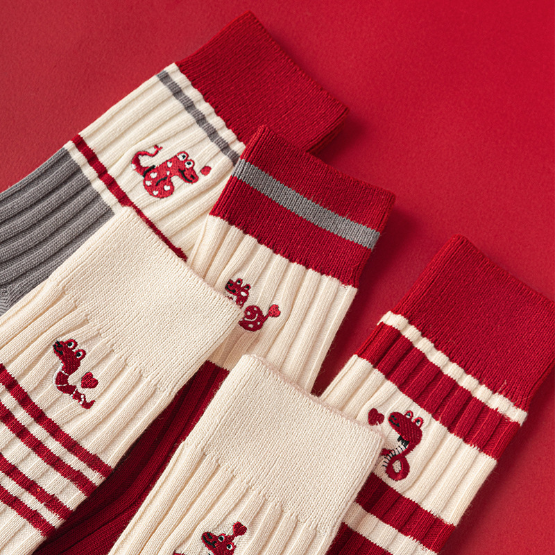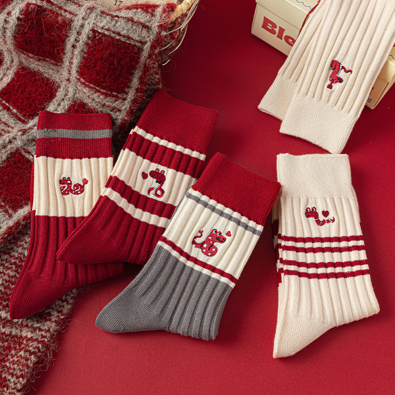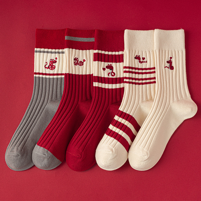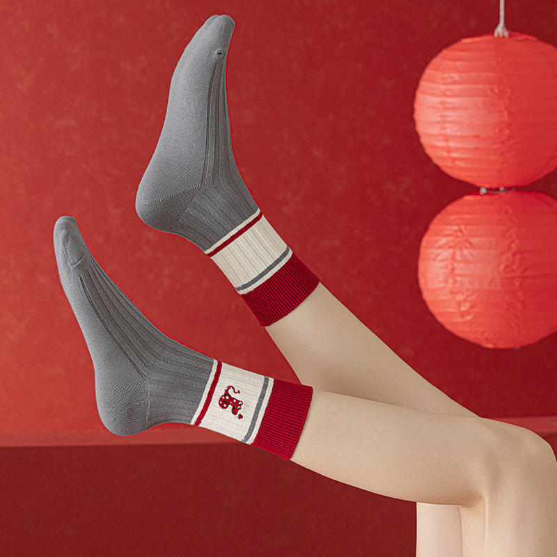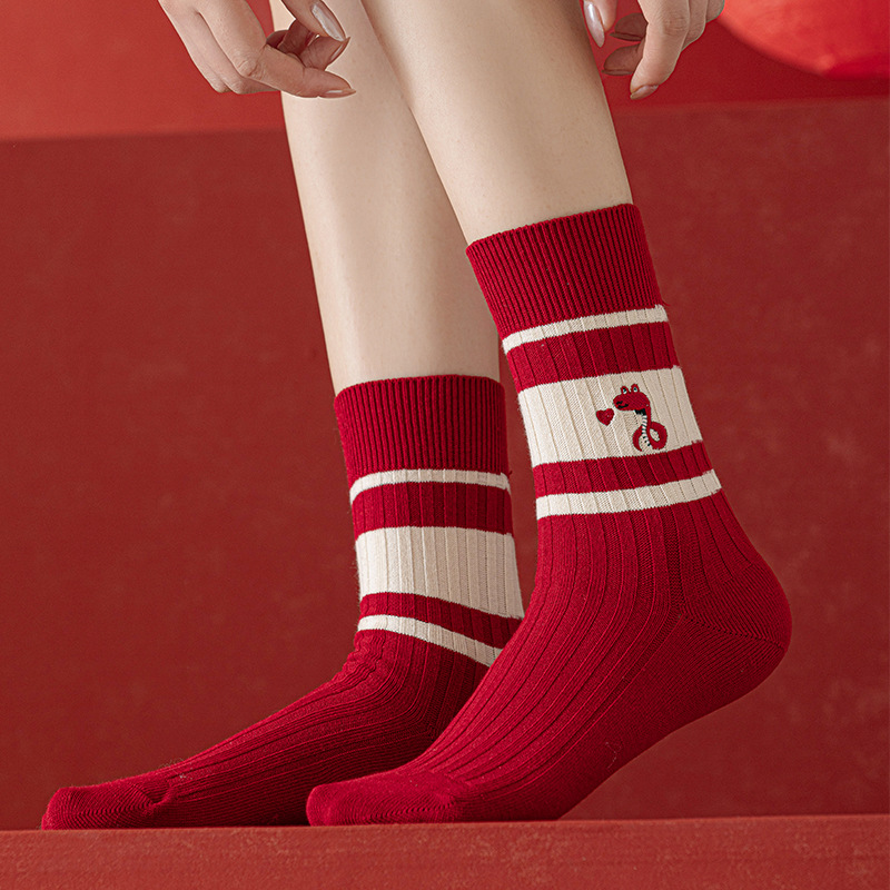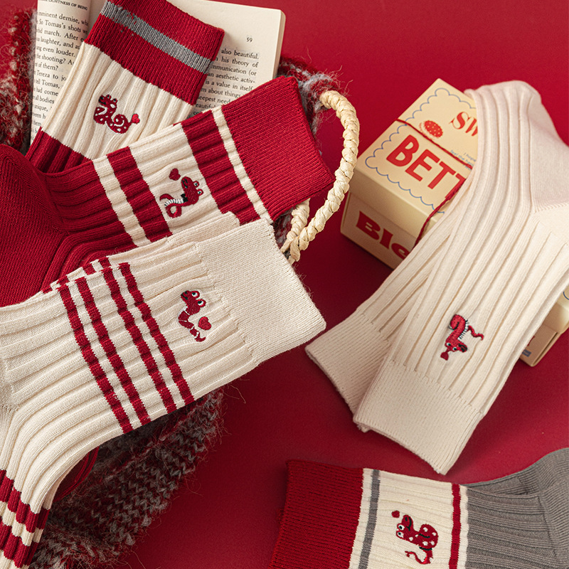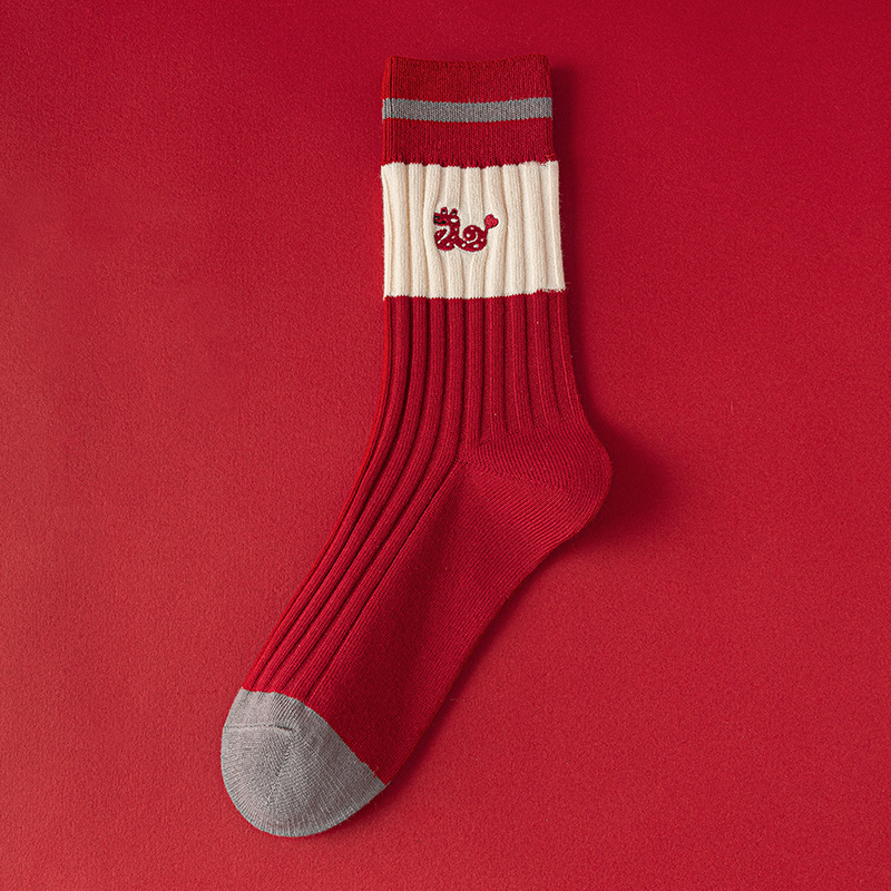 【温暖红色,时尚中筒款】蛇年红袜子 女生秋冬新款 本命年中筒女袜 红色韩版刺绣双针堆堆袜-QQ