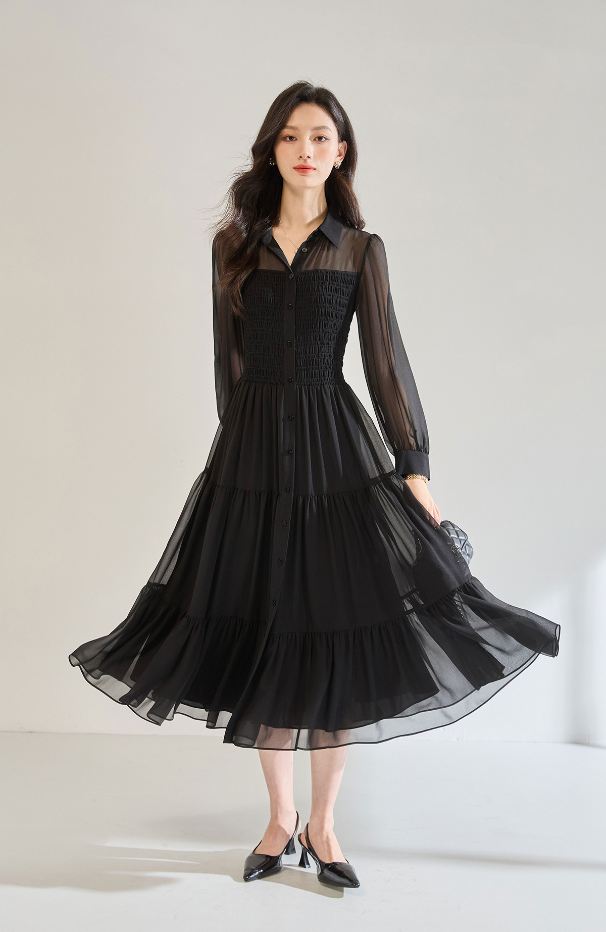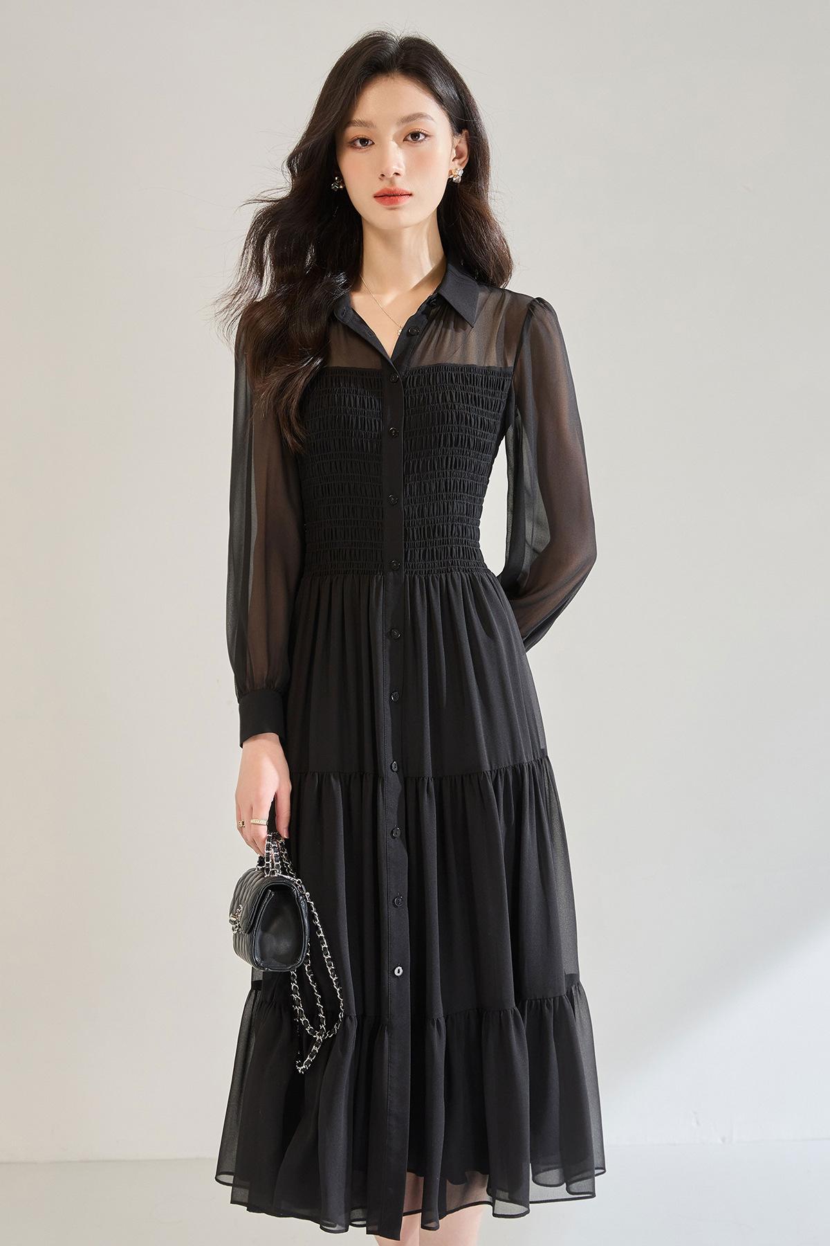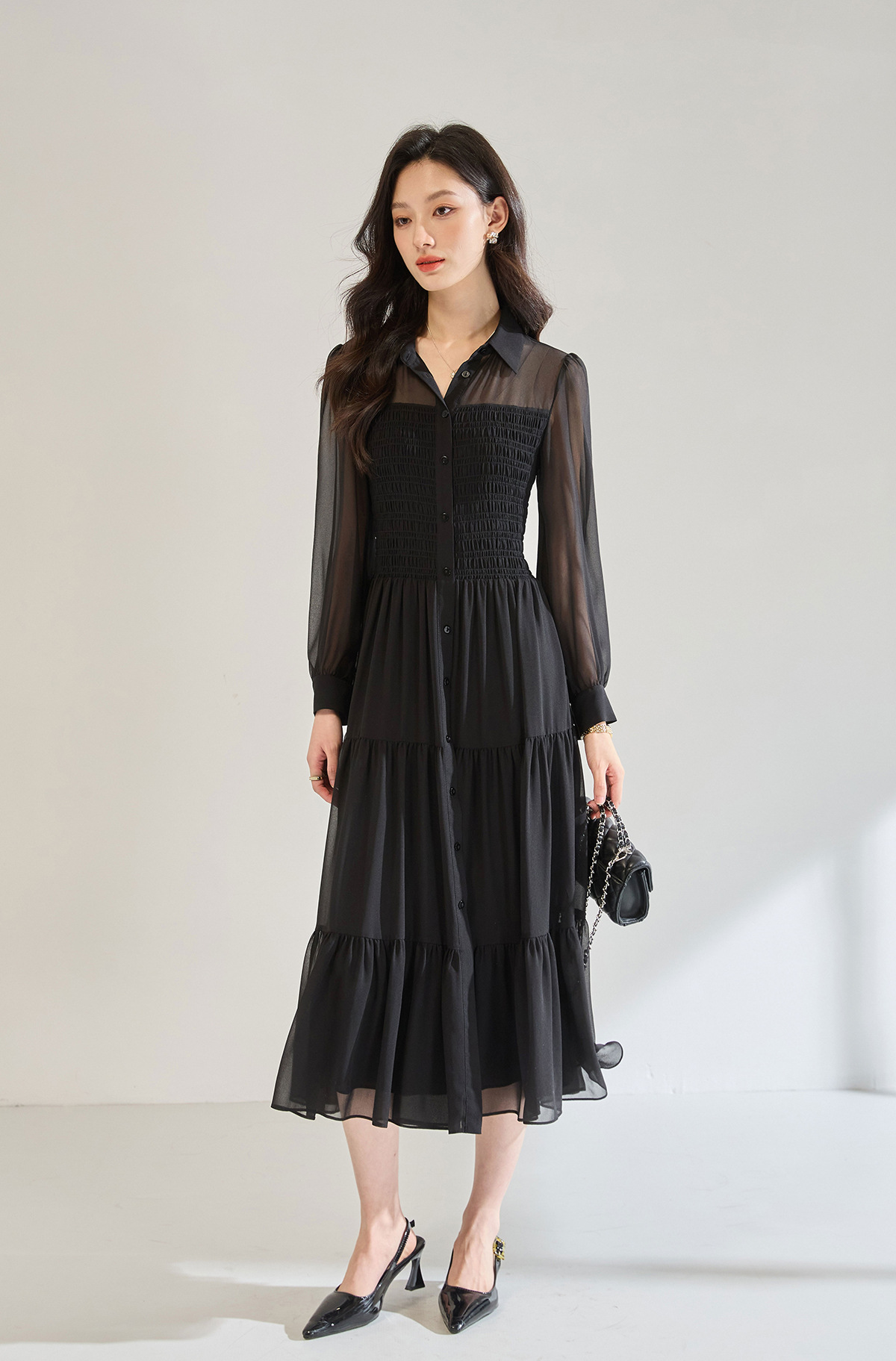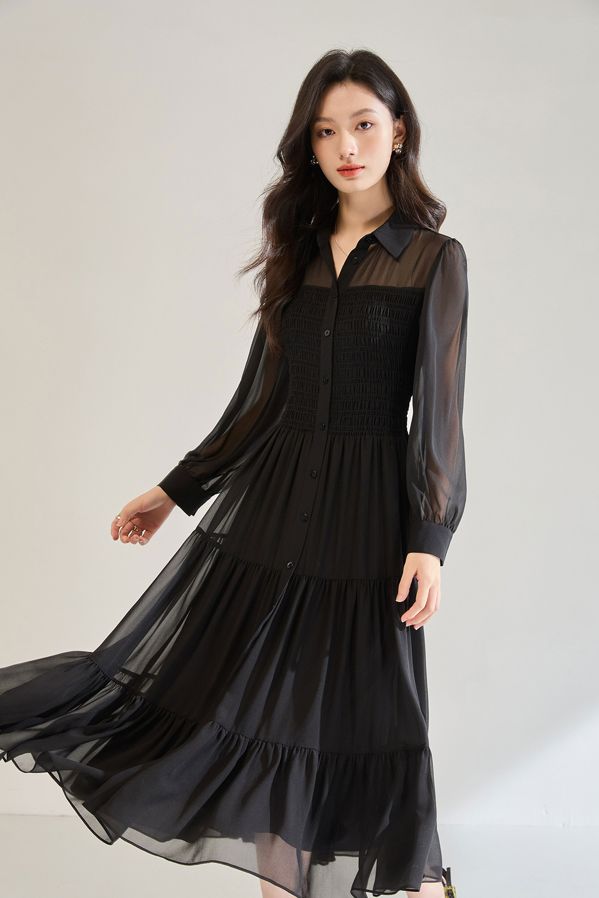 「高货sh」全新升级【铂金会员284/天猫379/差价95】(13914)洛诗琳秋季优雅气质收腰抽褶灯笼袖黑色雪纺长款连衣裙女sh13914