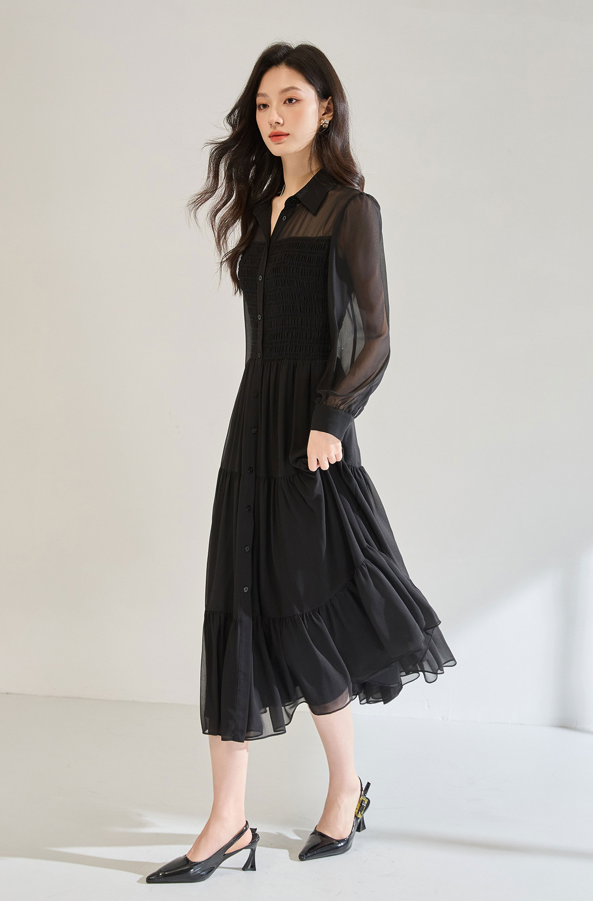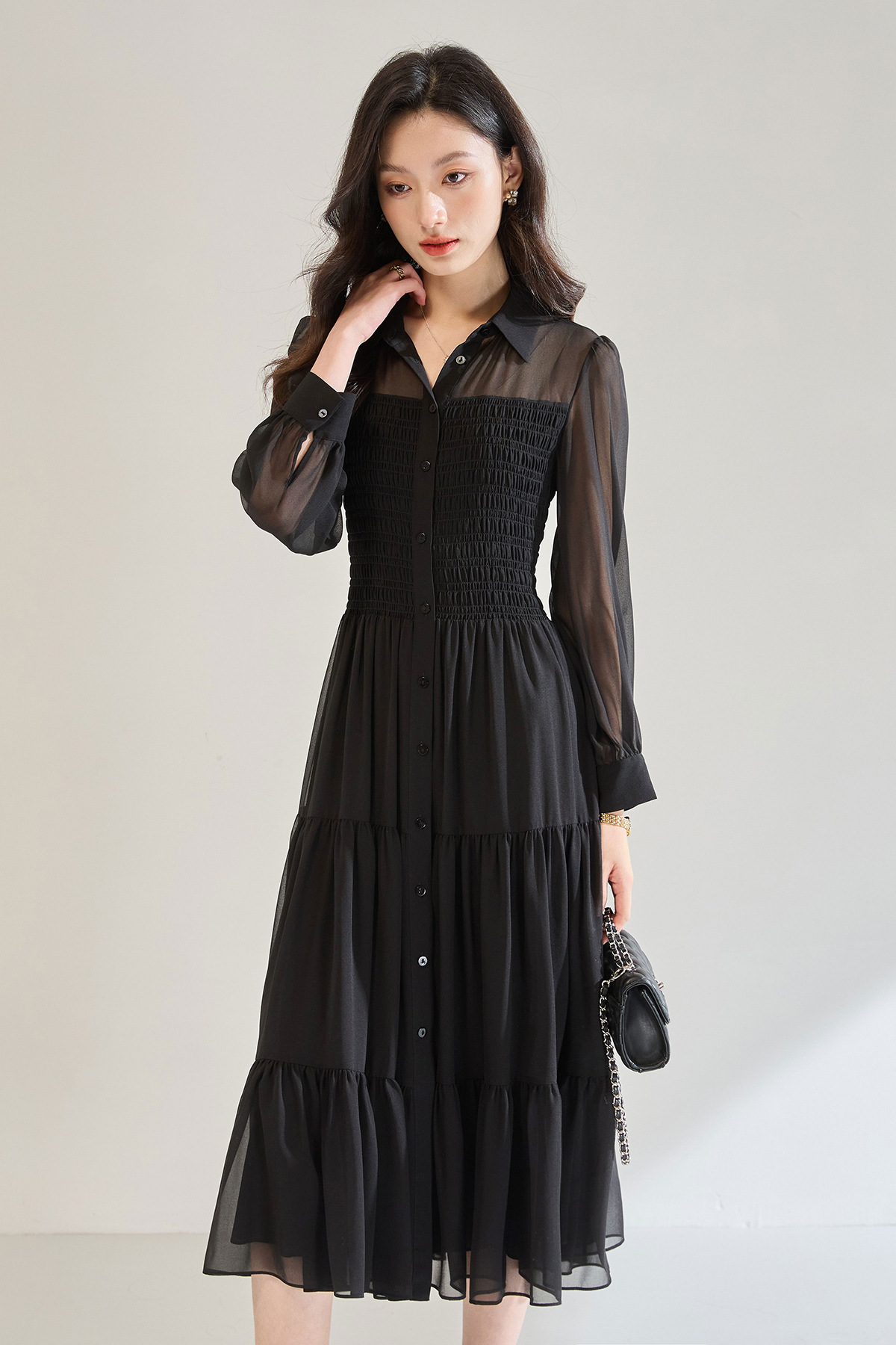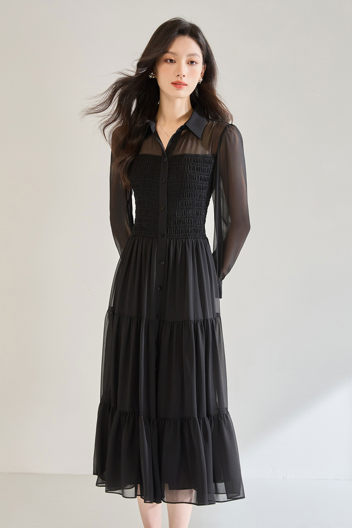 「高货sh」全新升级【铂金会员284/天猫379/差价95】(13914)洛诗琳秋季优雅气质收腰抽褶灯笼袖黑色雪纺长款连衣裙女sh13914