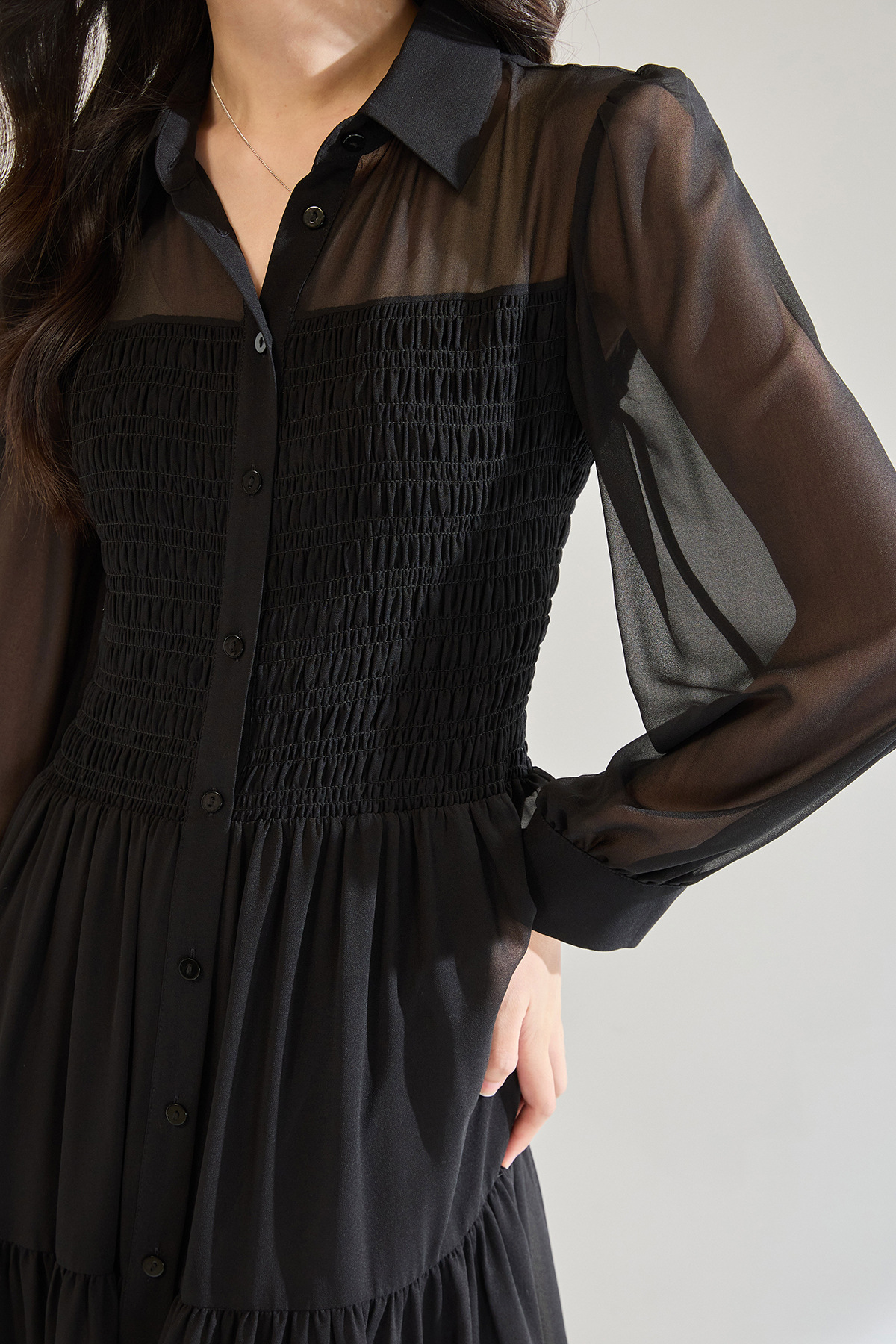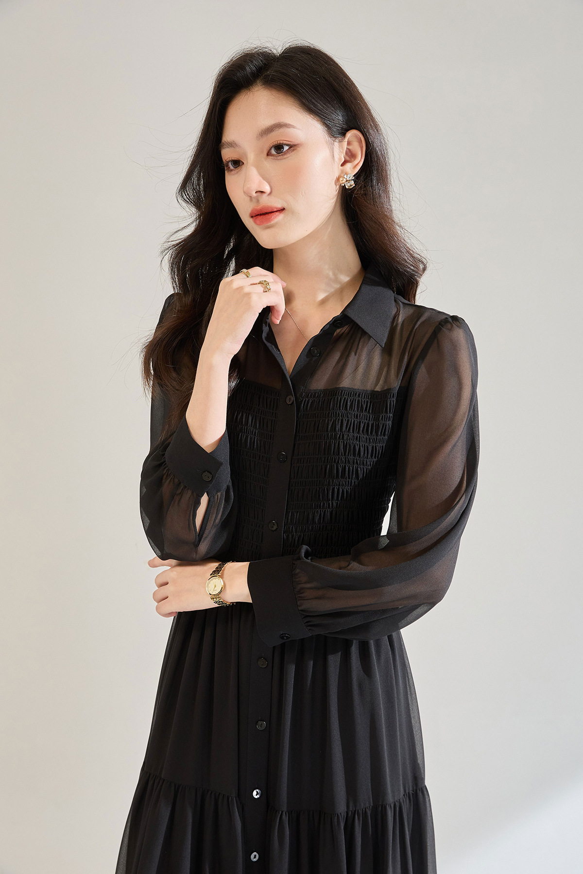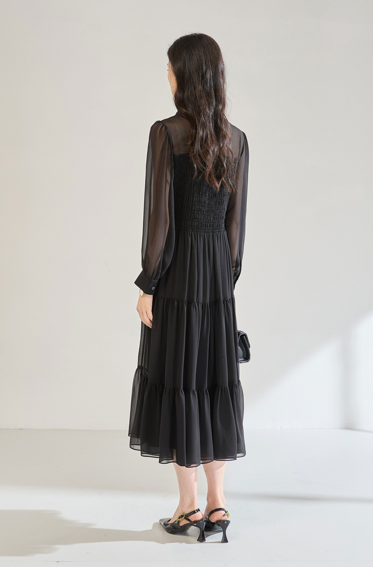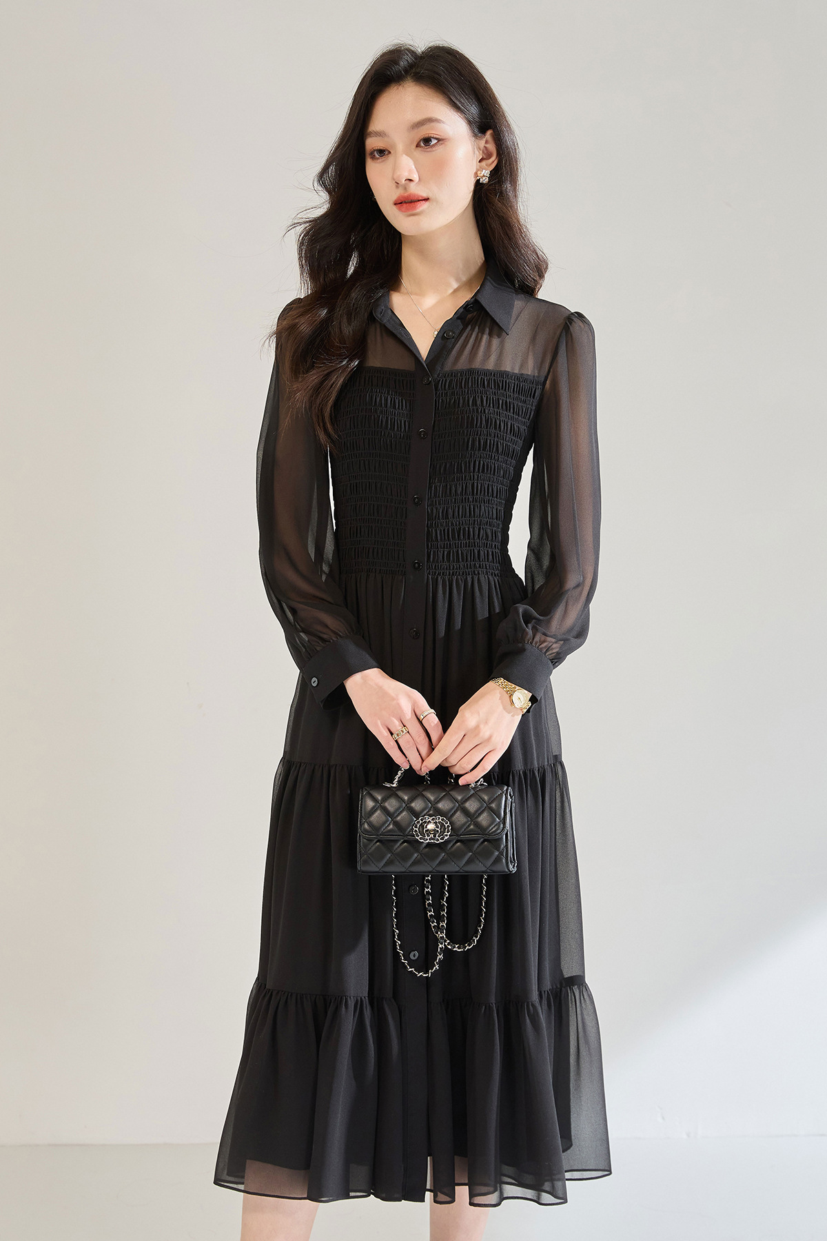 「高货sh」全新升级【铂金会员284/天猫379/差价95】(13914)洛诗琳秋季优雅气质收腰抽褶灯笼袖黑色雪纺长款连衣裙女sh13914
