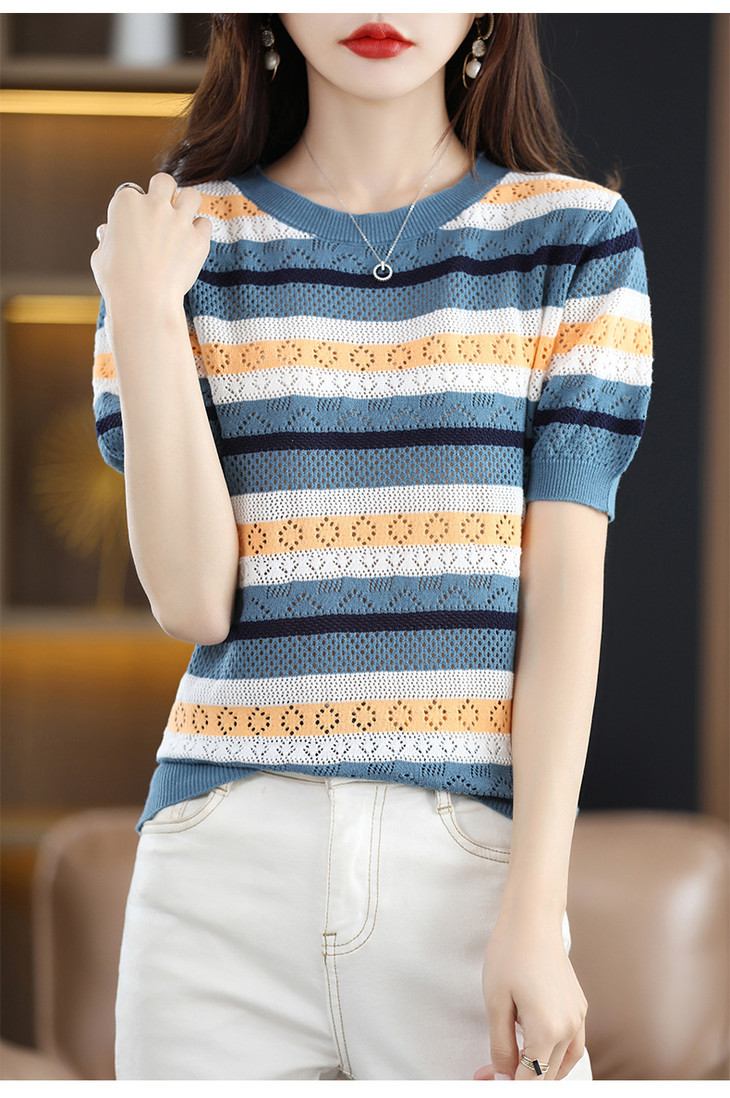 QHJY-JY1027-100棉线条纹镂空钩花短袖针织衫女春夏款圆领宽松半袖上衣打底衫
