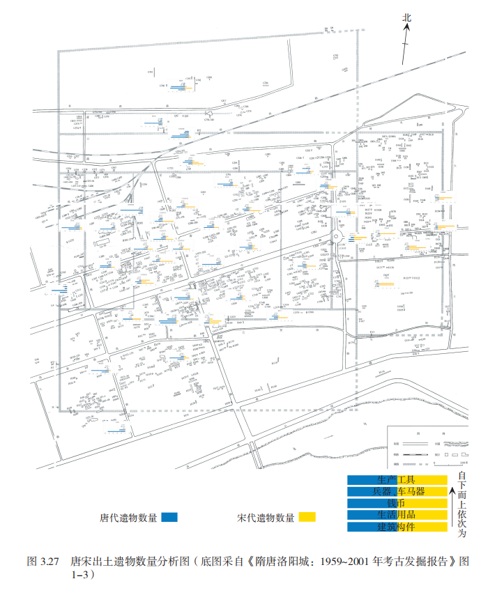 分析宫城、皇城、东城位置和范围,发现东周王城和唐宫城之间的小夹城应属于北宋皇城范围;确定了唐宋时期宫城大内重要参考系——“五纵四横”,即南北方向的五条主要轴线,和由东西方向横街或墙体构成的四重分隔,北宋时期除上述横街分隔形成的条形空间外,还出现了由双重隔门分隔形成的环形空间。值得注意的是,文中以西京洛阳宫城中出土的遗迹和遗物为基础数据,采用大数据的分析方法,发现北宋时期东城超越大内成为宫皇城区域中活动最为频繁的区域。(图3.18或3.27)