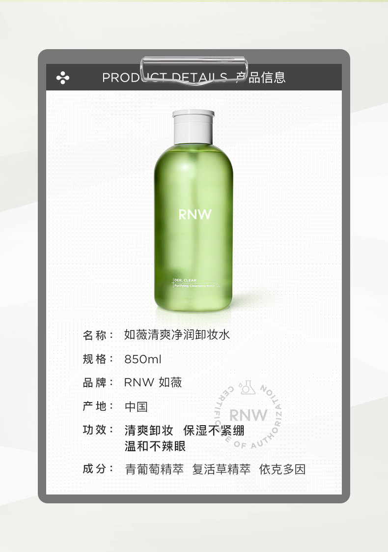 [买大送小] RNW卸妆水850ML 眼唇脸三合一液油按压式敏感肌肤