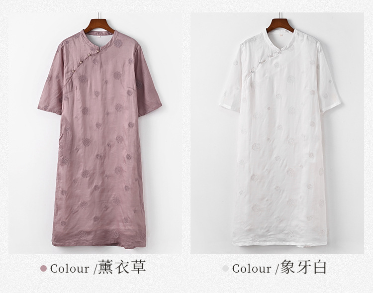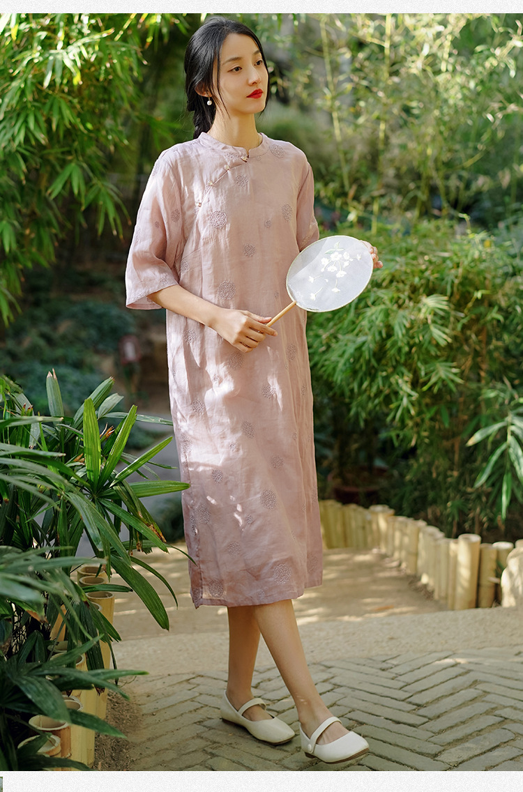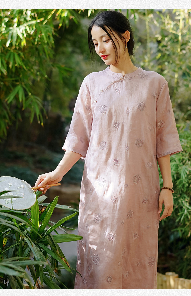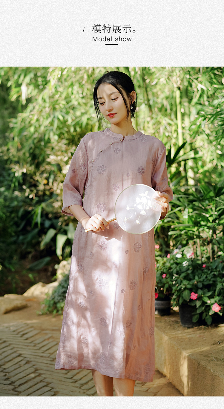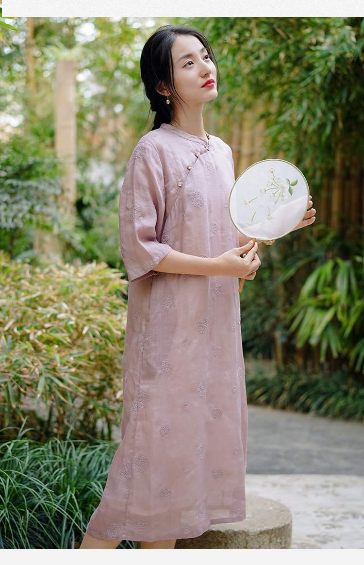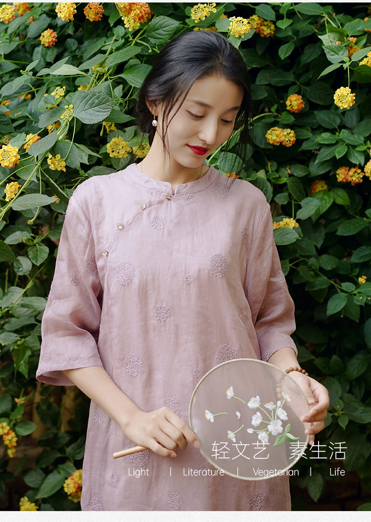 新中式改良旗袍连衣裙,中国风苎麻复古刺绣茶服QM-6231