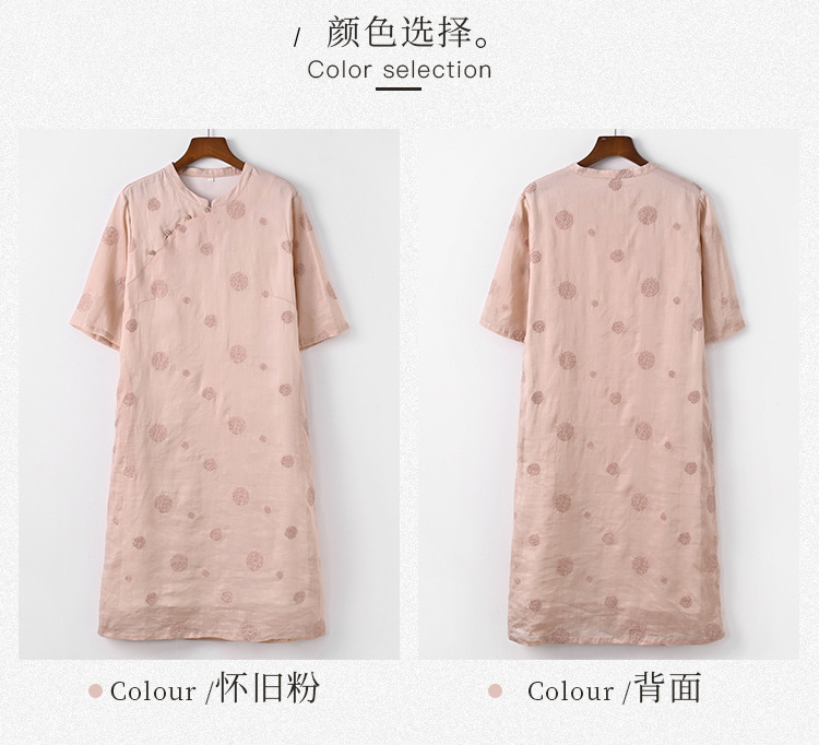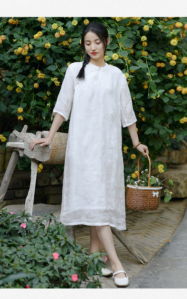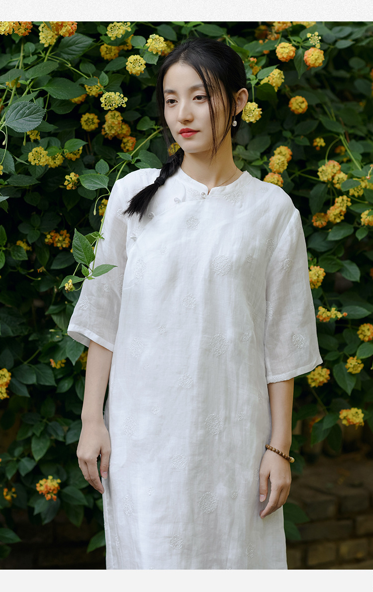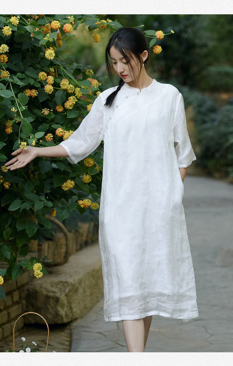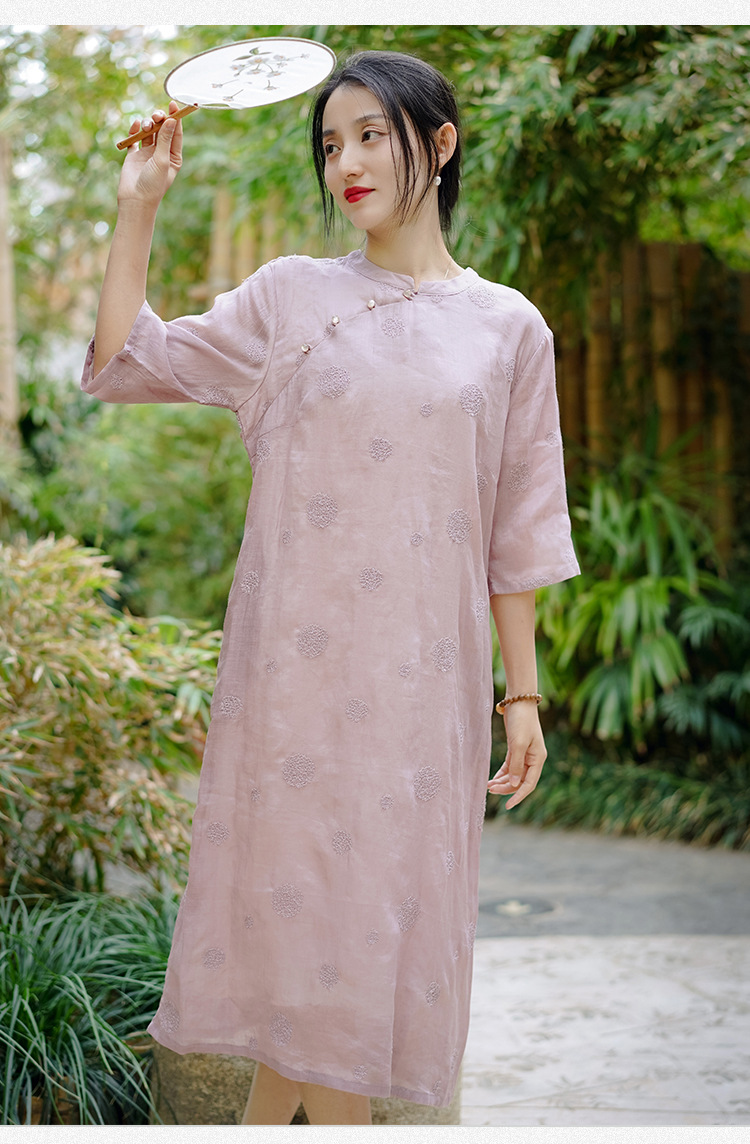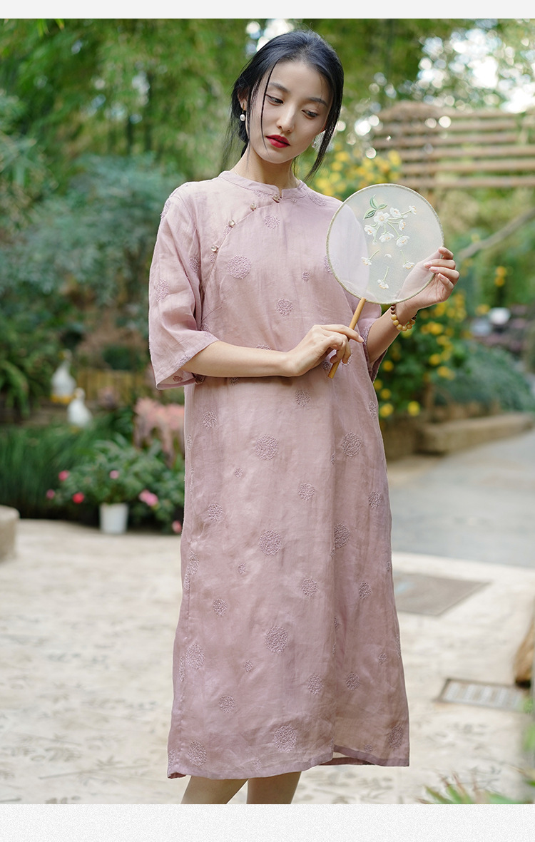 新中式改良旗袍连衣裙,中国风苎麻复古刺绣茶服QM-6231