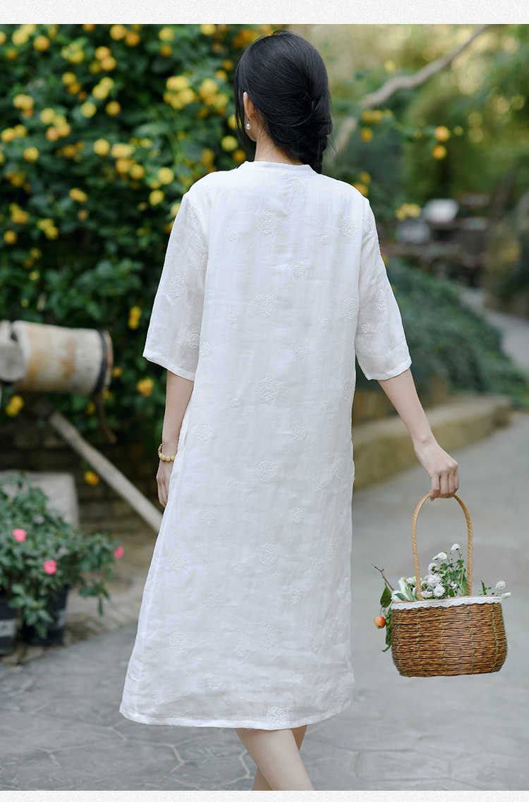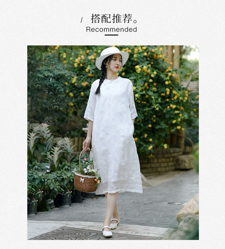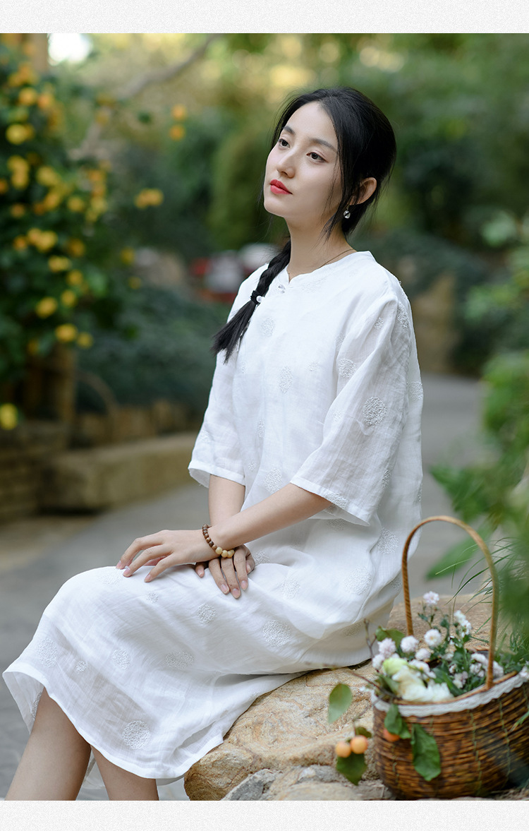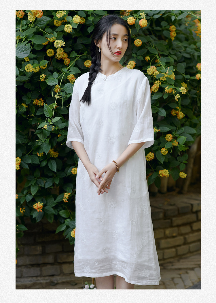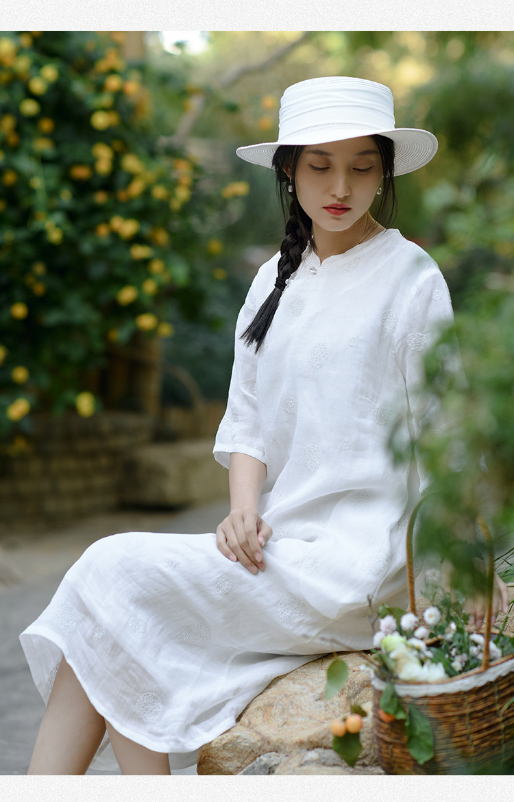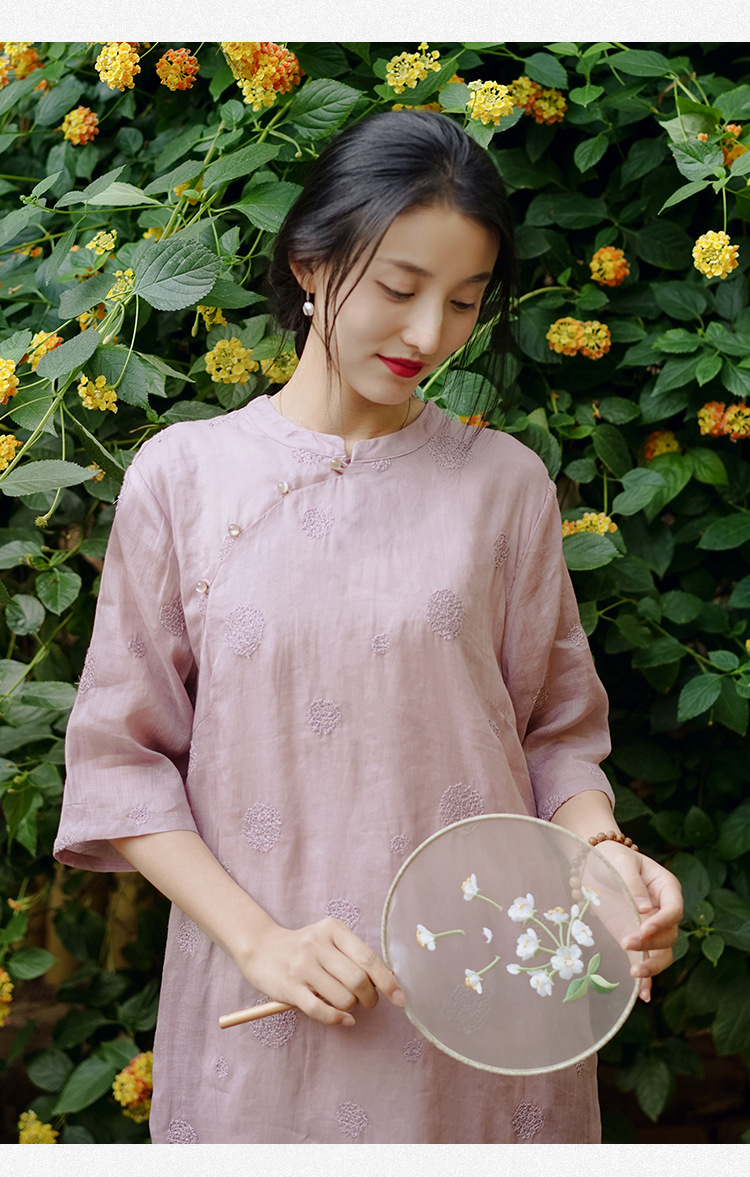 新中式改良旗袍连衣裙,中国风苎麻复古刺绣茶服QM-6231