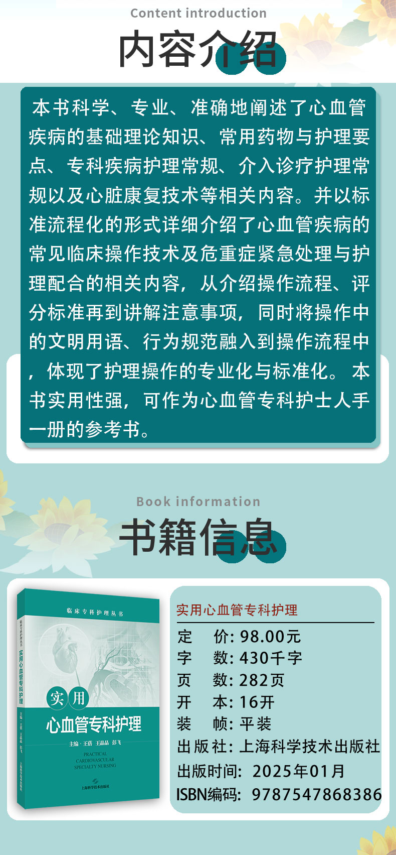 实用心血管专科护理 临床专科护理丛书 王蓓 王晶晶 彭飞 主编 心血管系统常用药物及护理要点 9787547868386 上海科学技术出版社