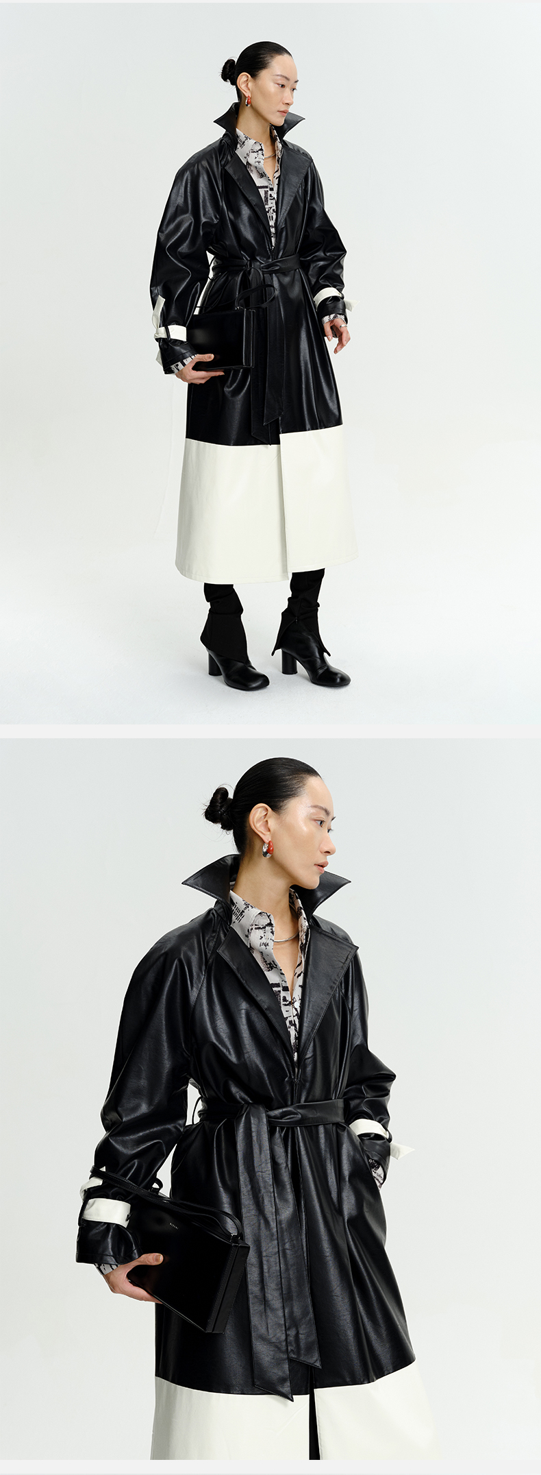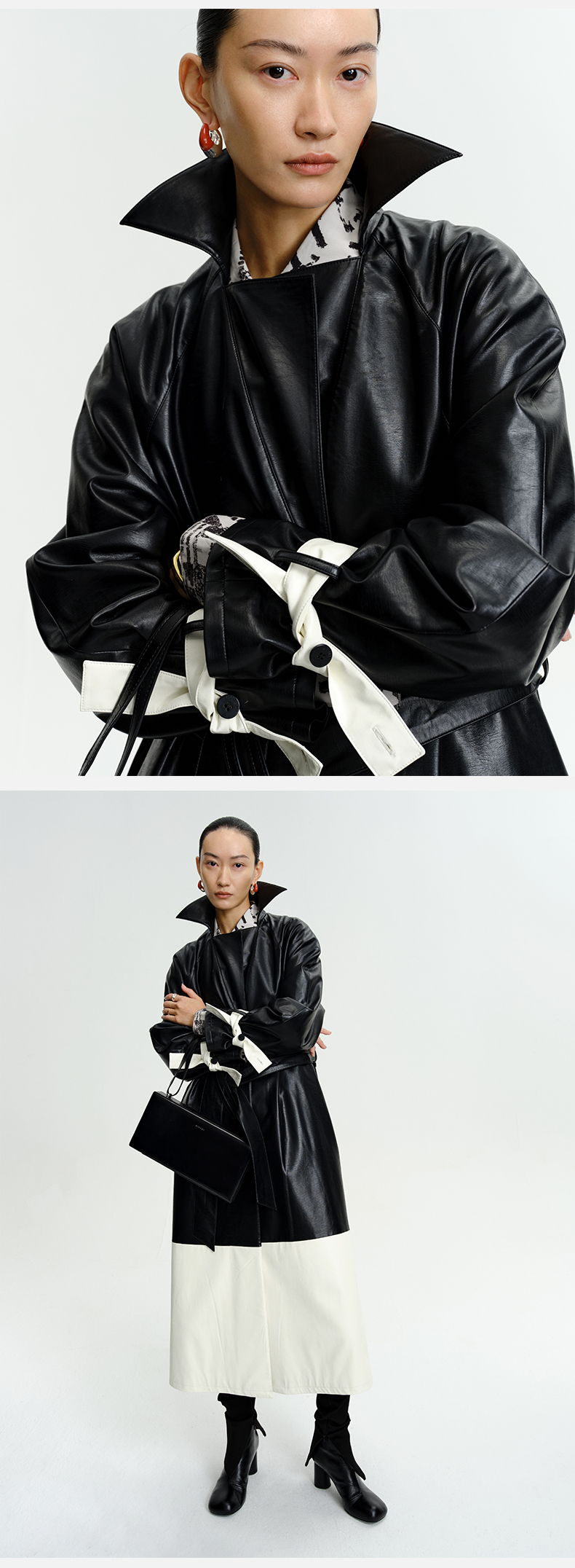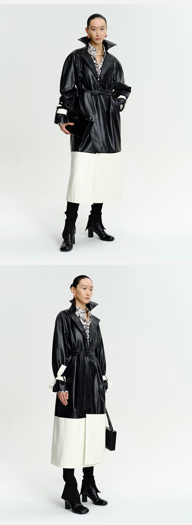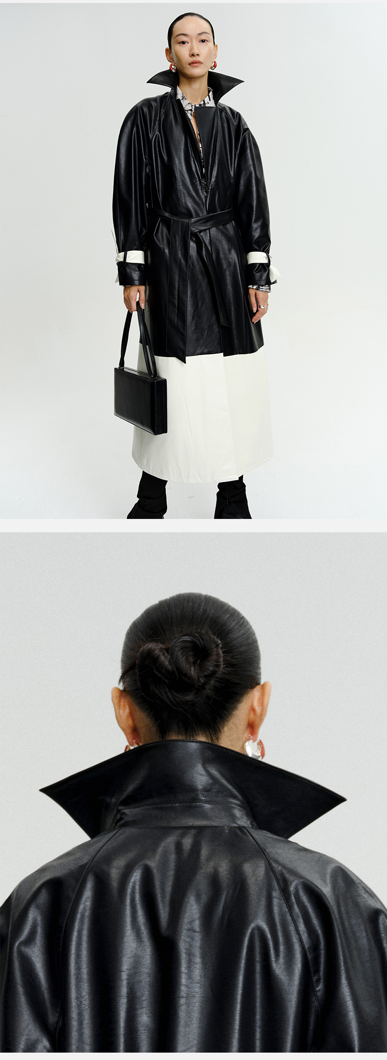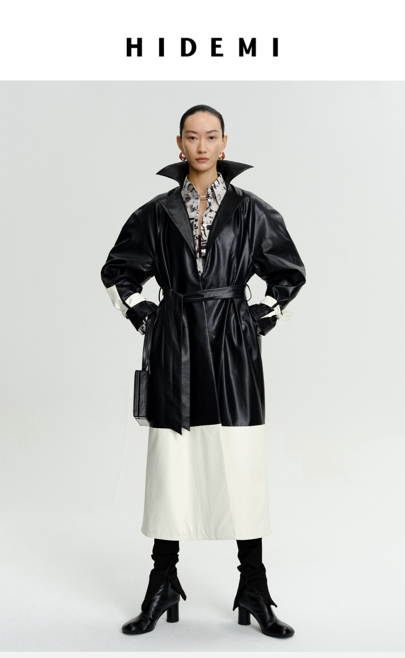 HIDEMI 黑白拼接极简之感长款环保皮风衣皮衣