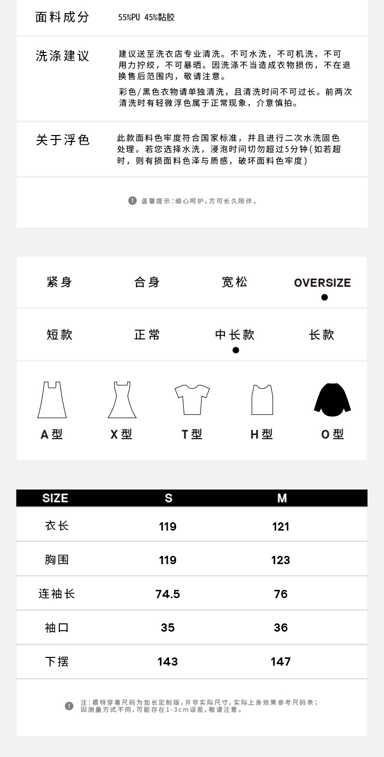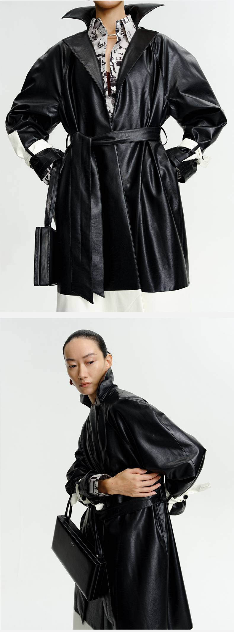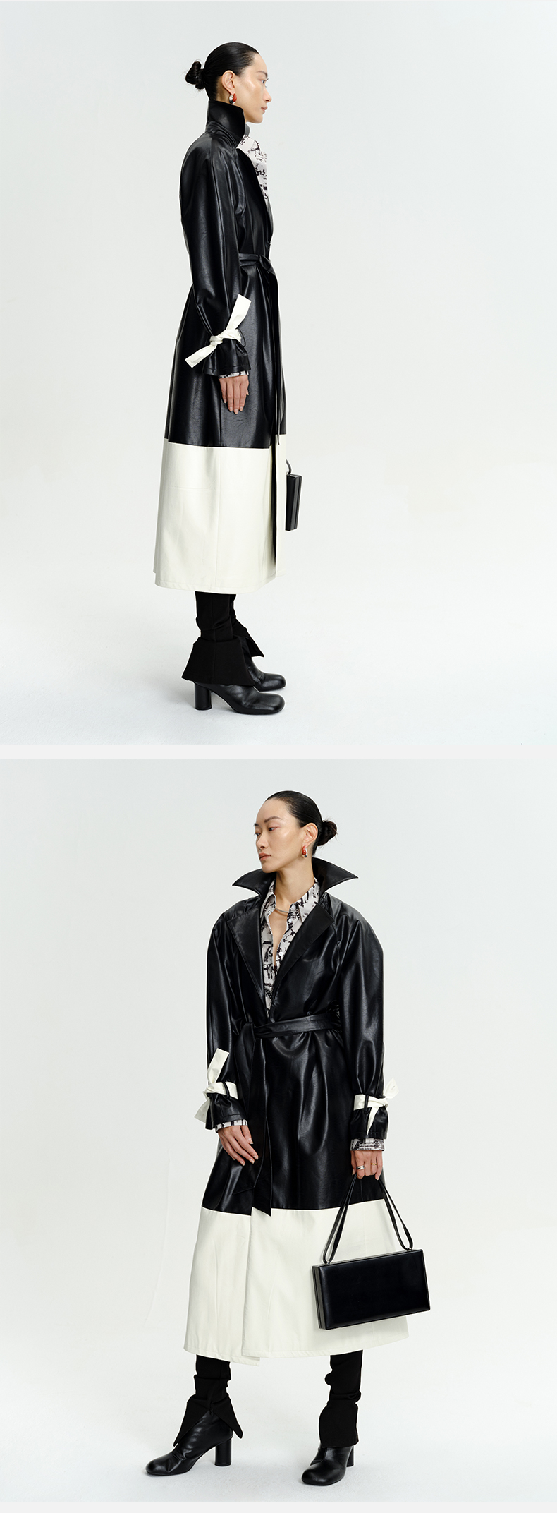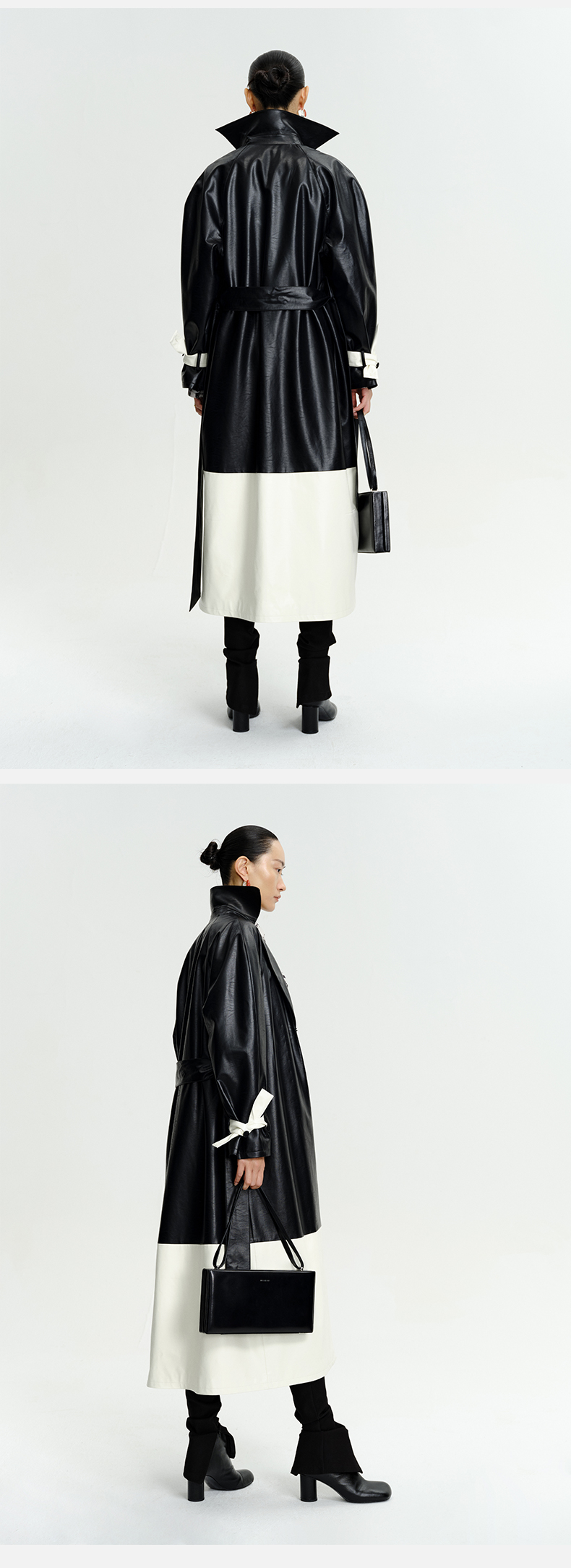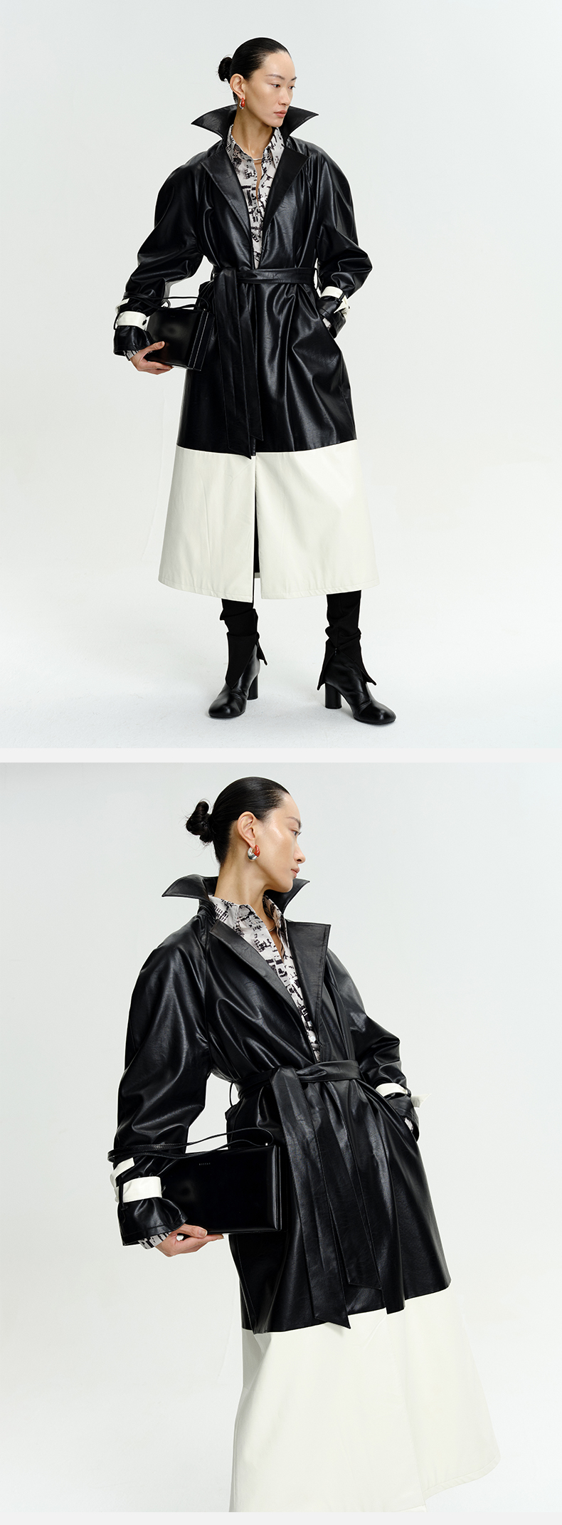 HIDEMI 黑白拼接极简之感长款环保皮风衣皮衣