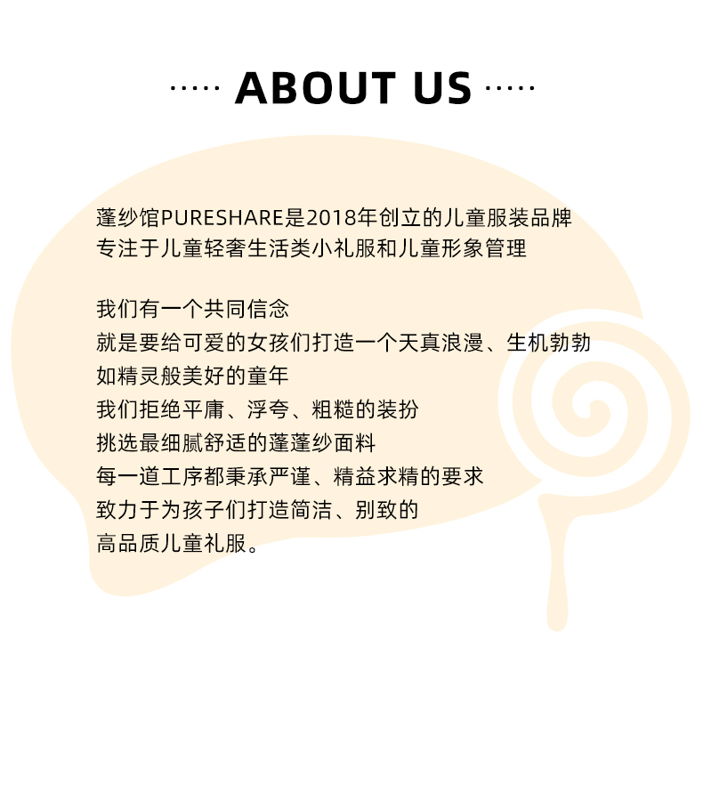 - PureShare蓬纱馆,2018年创立的儿童服装品牌,专注于儿童轻奢生活类小礼服,主张“让孩子做最独特的自己”的品牌理念,为孩子们提供时尚简洁、优雅而又不失童真的生活类礼服。