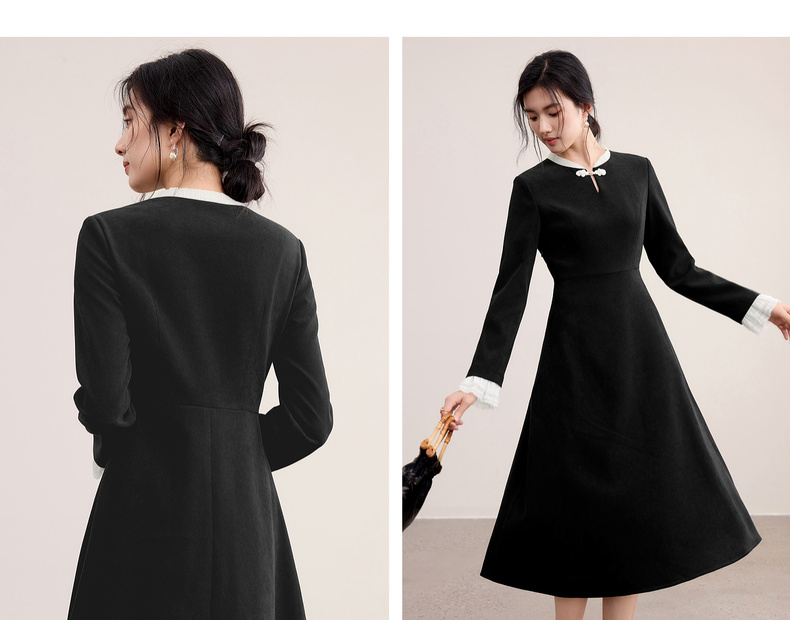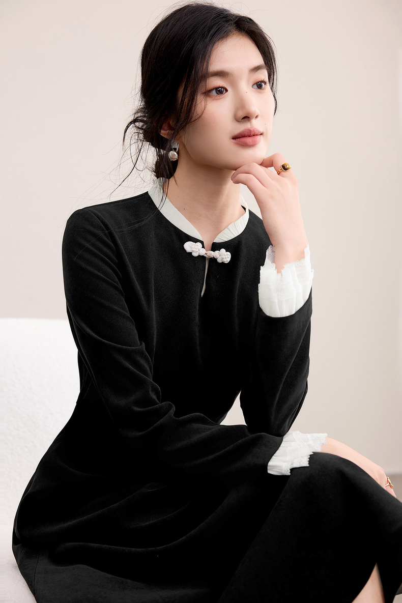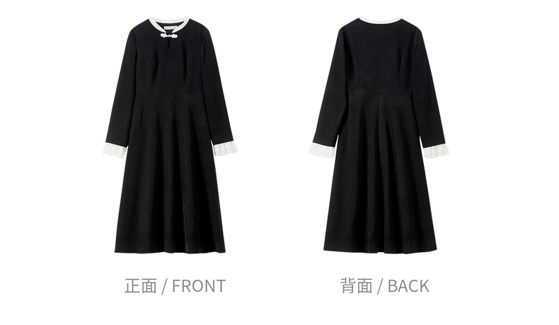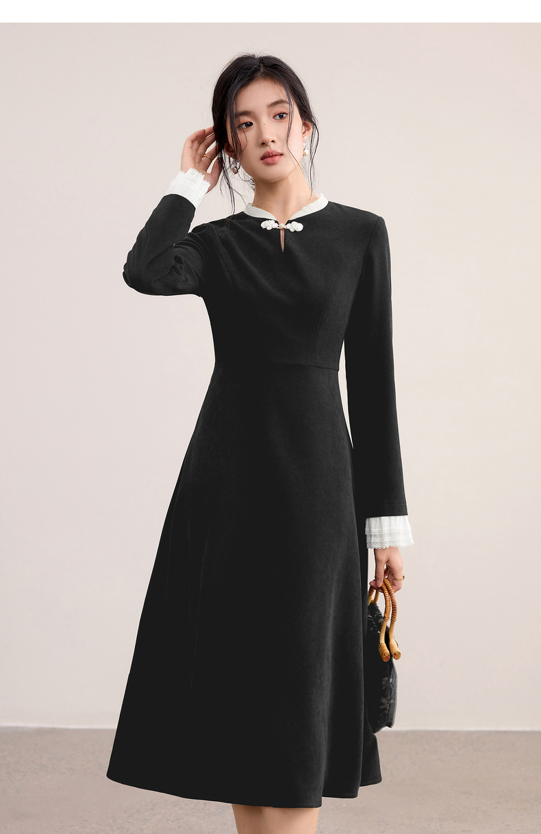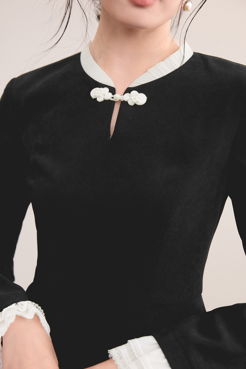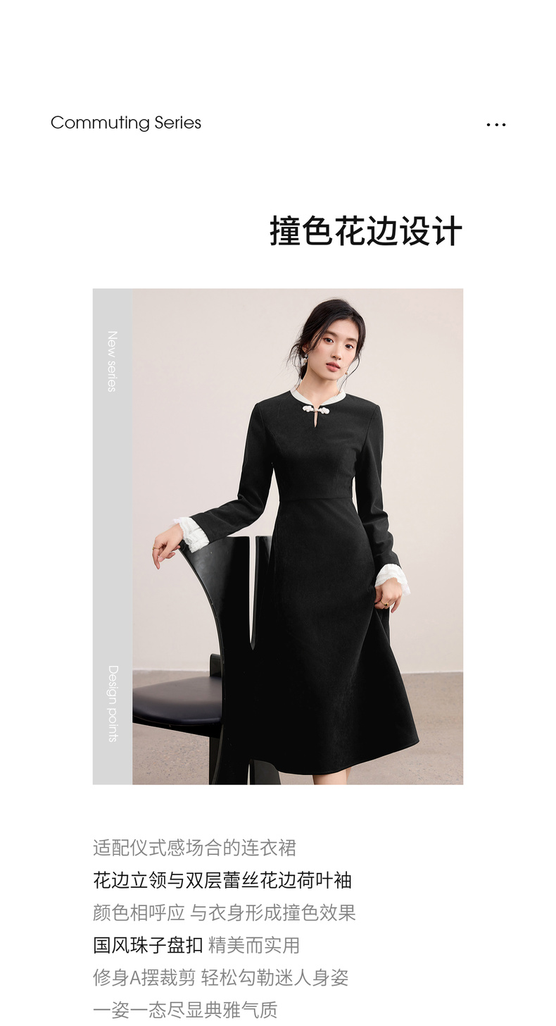 【内购】【国风裙】撞色花边立领拼接双层蕾丝花边荷叶袖收腰显瘦连衣裙-153LI2768