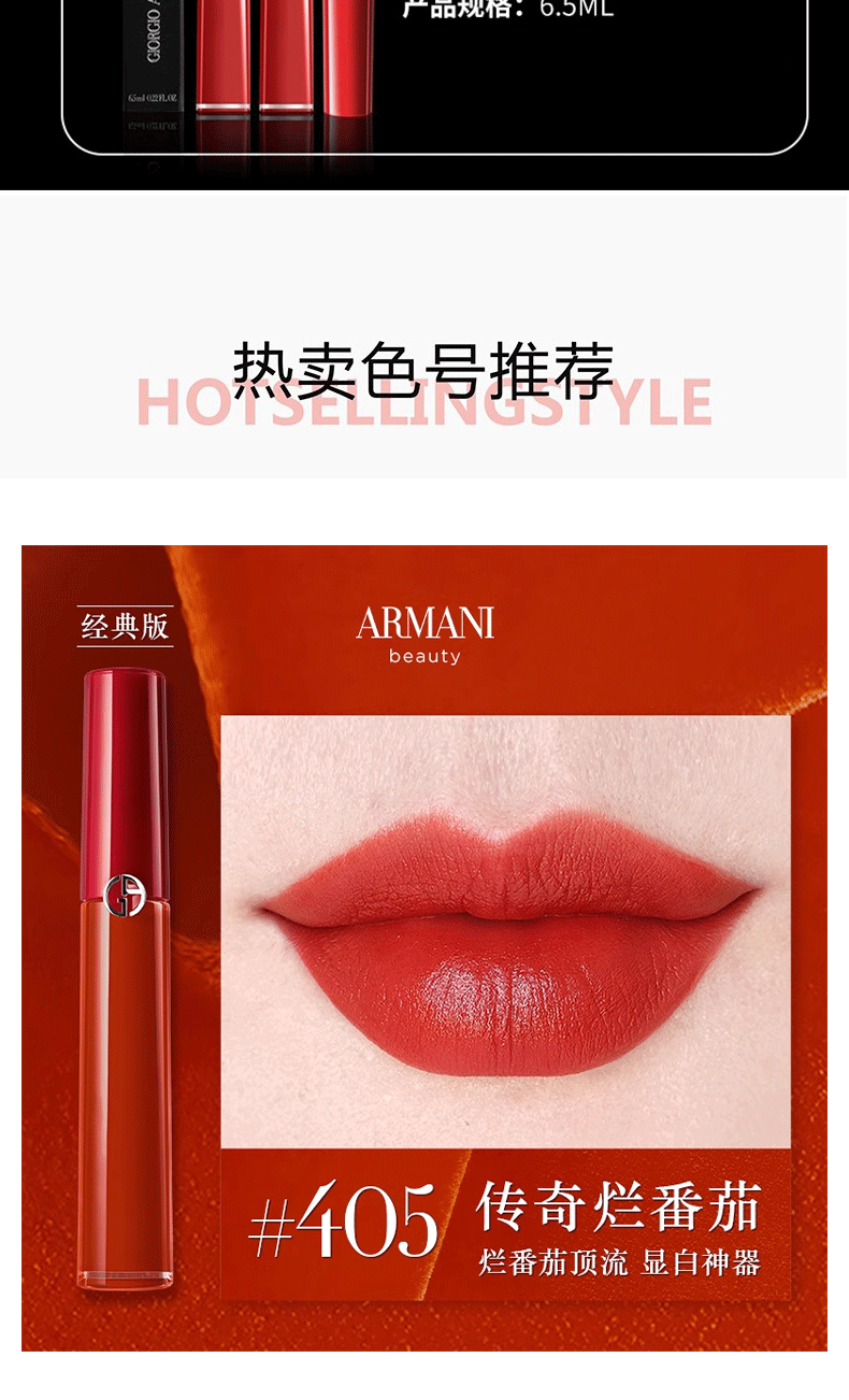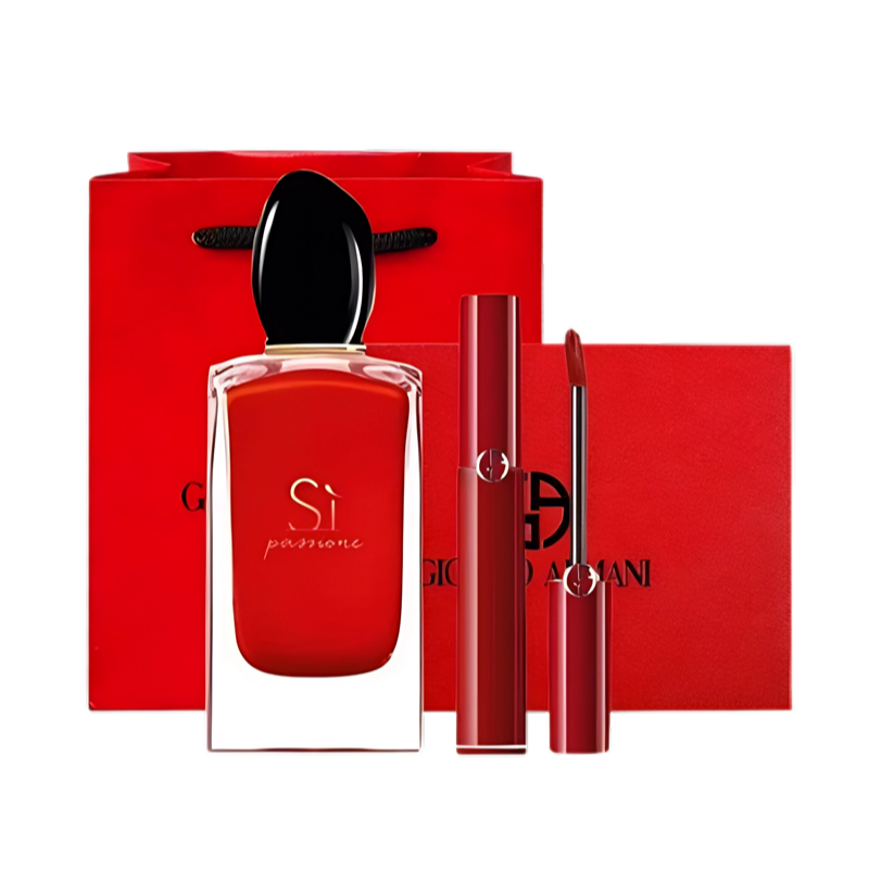:阿玛尼浓香挚爱香水100ML搭配红管405#烂番茄,经典香气组合散发迷人魅力。礼盒礼袋包装精致,适合自用或送礼。