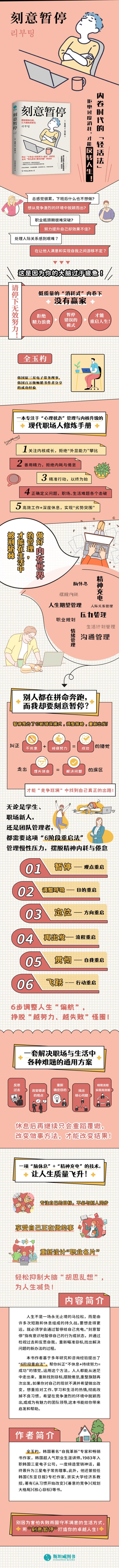 人生不是一场永无止境的马拉松,而是由许多次短跑和休息组成的持久战。要想走得更远,就必须学会通过暂停给自己充电。“刻意暂停”指有意识地暂停自己的行为或状态,并通过检视过去和反思自我,重新瞄准目标,找出解决问题的新办法的过程。本书作者基于多年研究和咨询经验提出了“6阶段重启法”,帮你纠正“不休息+持续努力=成功”的错觉。运用这个方法,人人都能从迷茫中走出来,重新找到目标,摆脱倦怠,重整旗鼓再次出发。如果你对自己的现状不满并希望做出改变,想重拾对工作、学习和生活的热情,改掉不良习惯,希望在竞争激烈的环境中脱颖而出,或成为有魅力的团队领导,这本书都能给你带来启发和帮助。