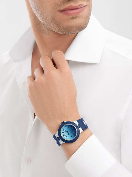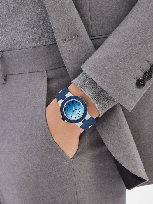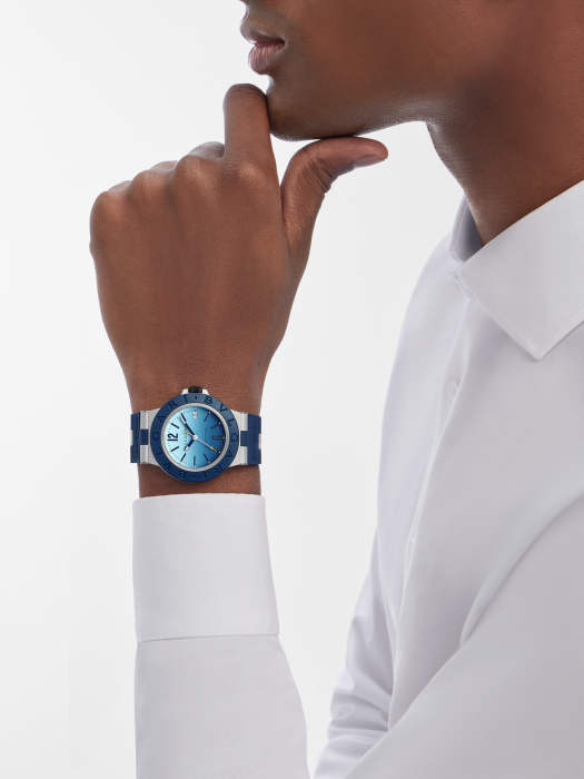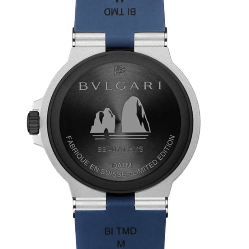 镜面 材质 | 蓝宝石水晶玻璃 | 表盘 | 铝金属表壳 蓝色橡胶表圈镌刻双logo标志,蓝色表盘,深蓝色和白色夜光时标,深蓝色夜光时针和分针,DLC高耐磨涂层钛金属表背饰以定制的卡普里奇岩镌刻图案 |
