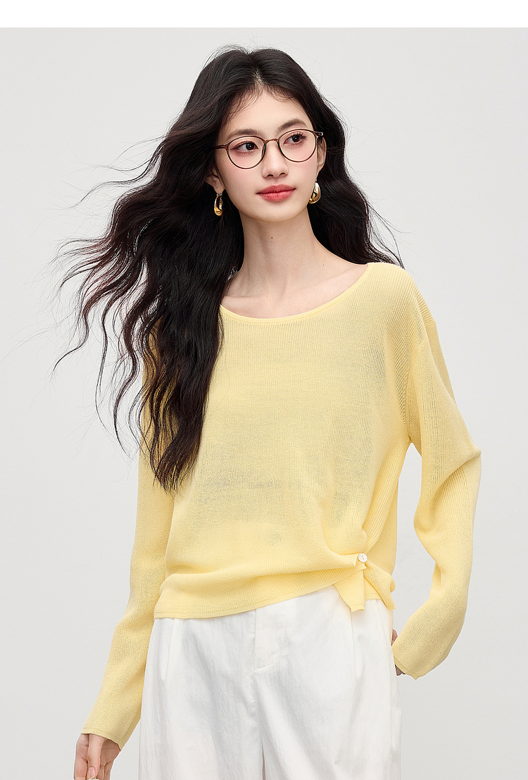 【08/12新品】熙世界亚麻微透圆领针织罩衫女夏秋款气质长袖薄款防晒上衣搭裙子