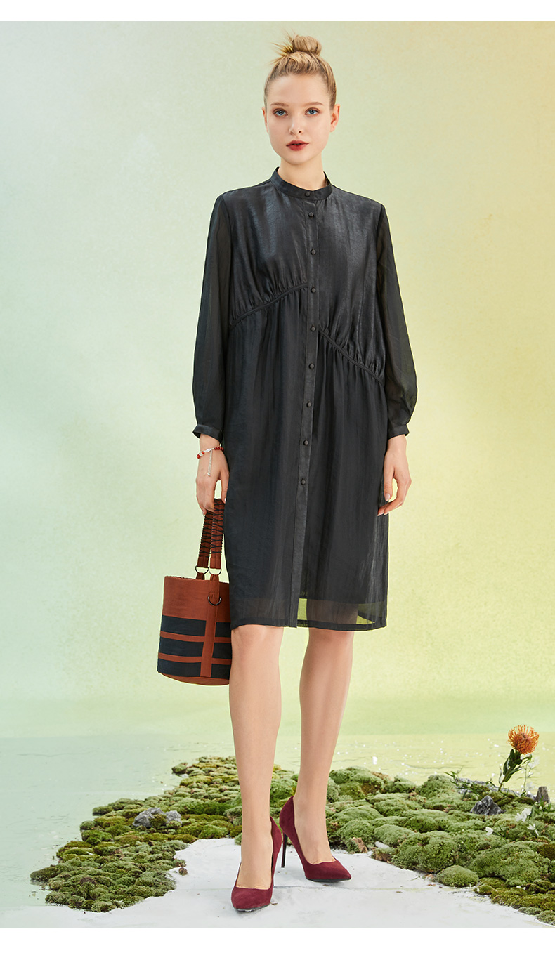 TANGY Collection/天意精品2022年春夏新品国捏褶立领长款莨绸连衣裙 商品图0