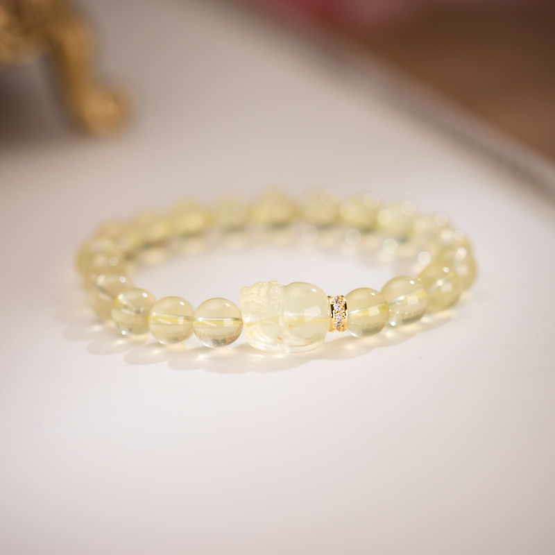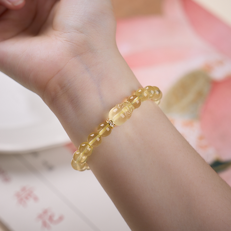 我们精选通透纯净的黄水晶,搭配寓意只进不出的萌趣小貔貅,希望能为你带去财富~