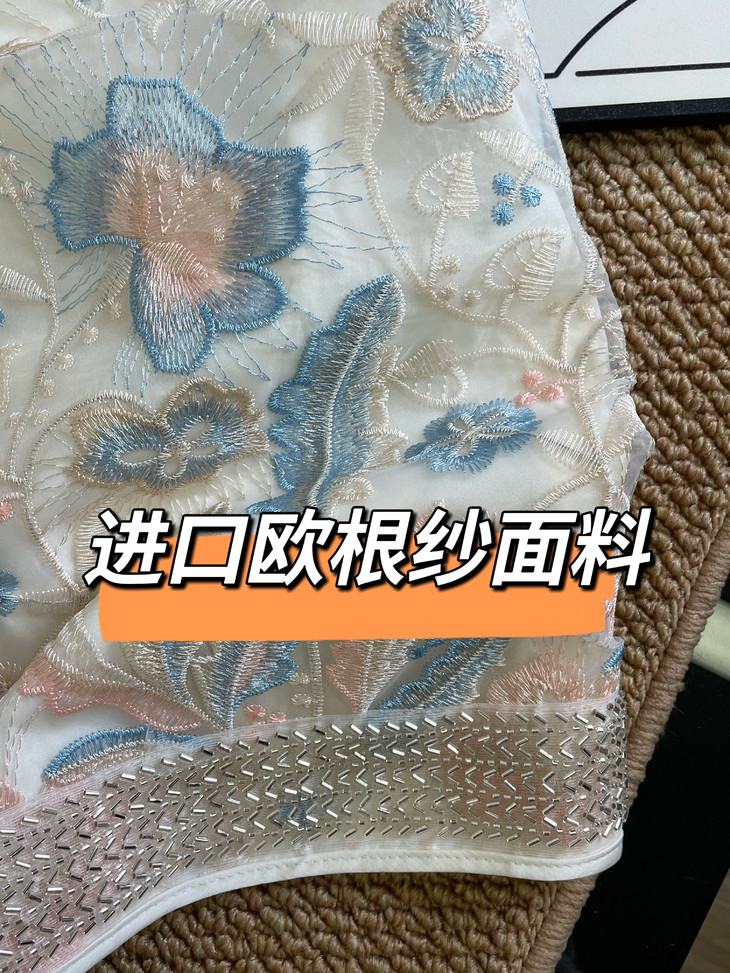 在薄如蝉翼的欧根纱上再做刺绣工艺
