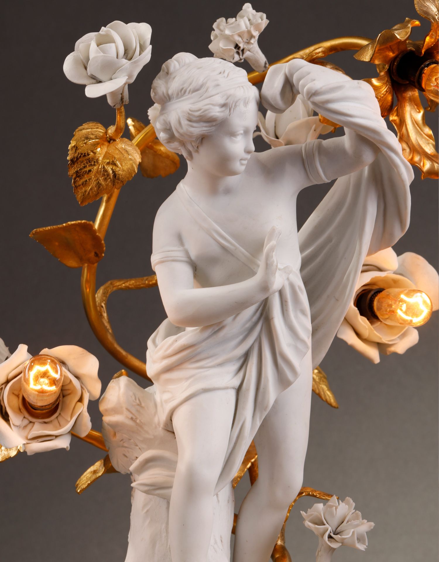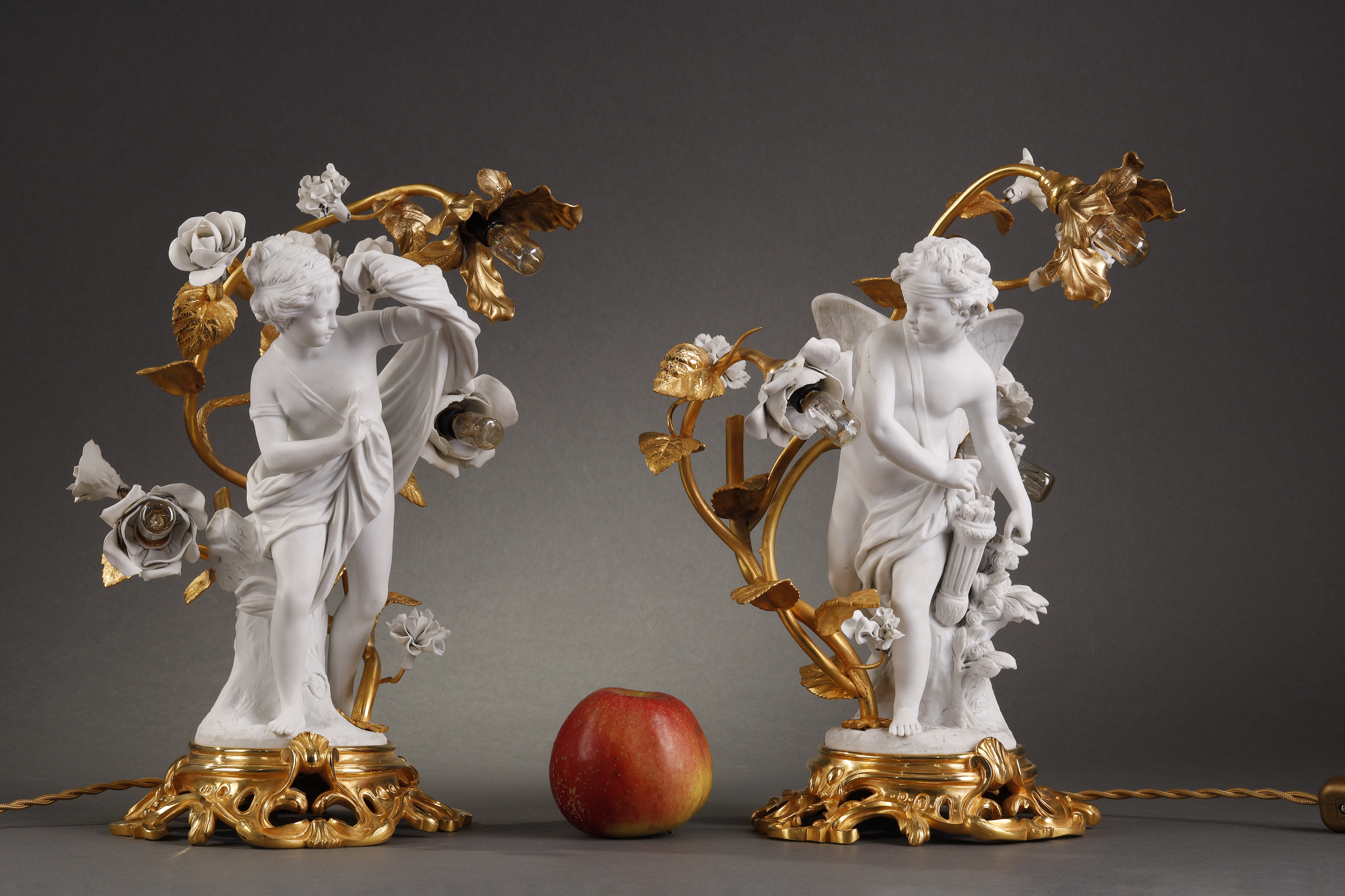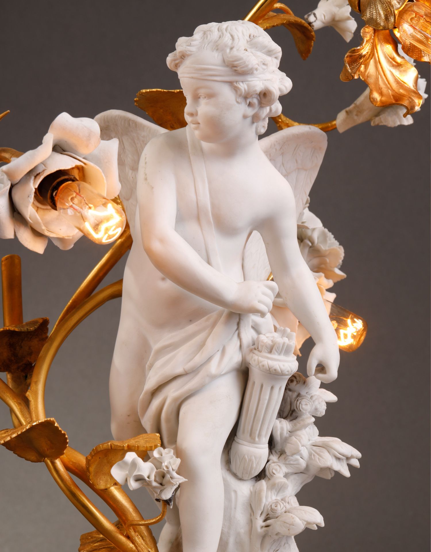 独角鹿西洋古董1880年代法国出品天使主题铜鎏金素胎瓷台灯一对