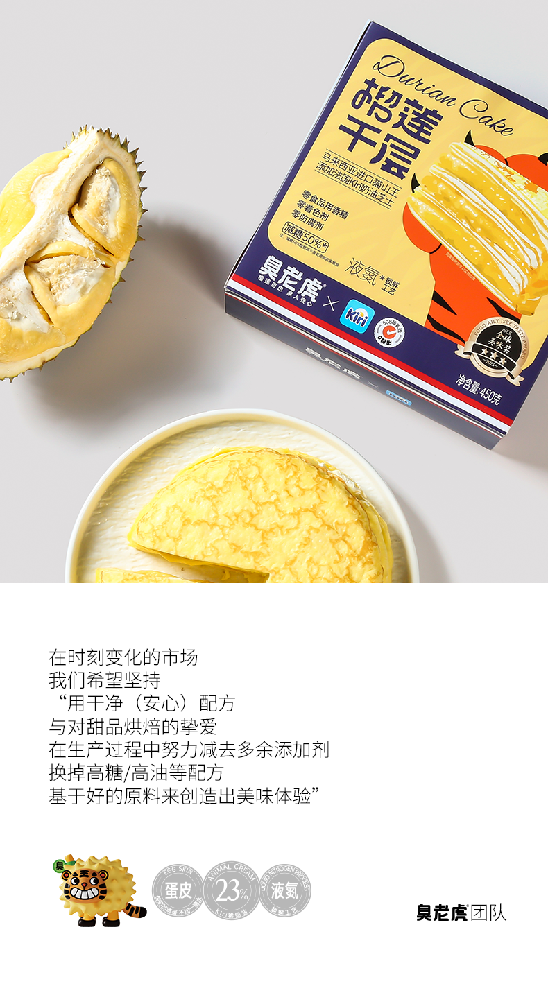 【配料】猫山王榴莲果肉(45%)、kiri稀奶油(23%)、稀奶油、灭菌乳、冰全蛋、小麦粉、黄油、全脂乳粉、乳清粉、葡萄糖浆、奶酪、食用盐。