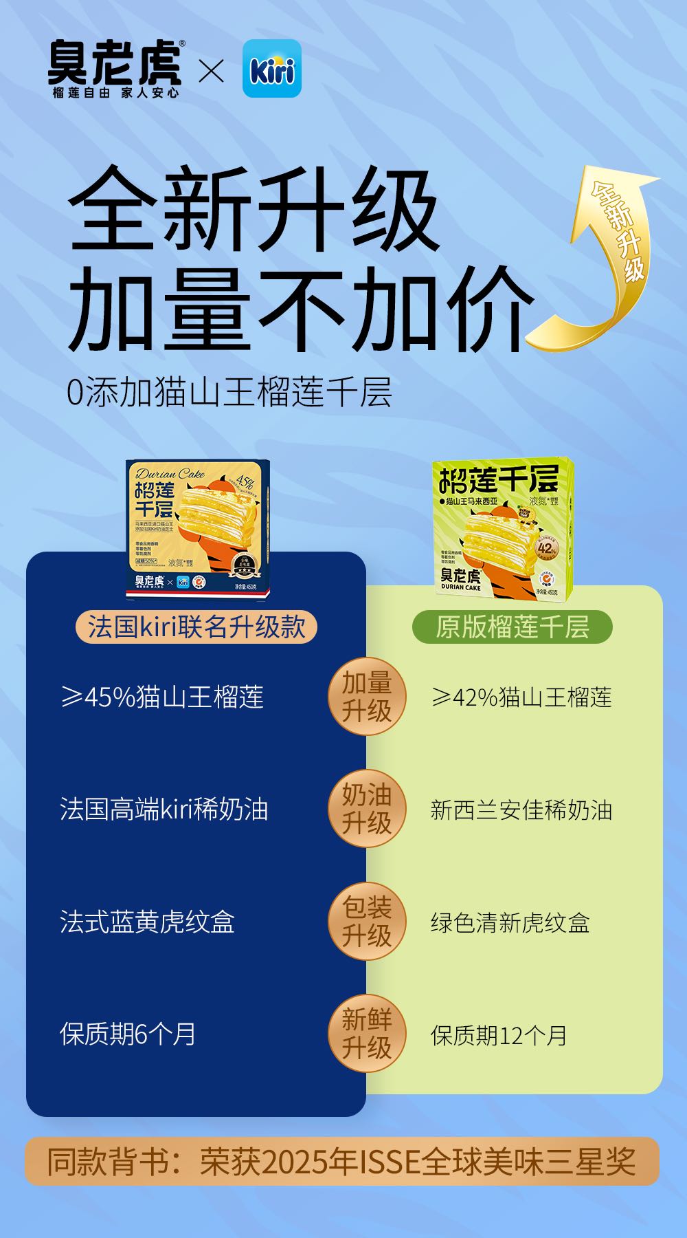 猫山王榴莲肉含量从42%增加为45%,现发货均为蓝宝石包装新款千层~