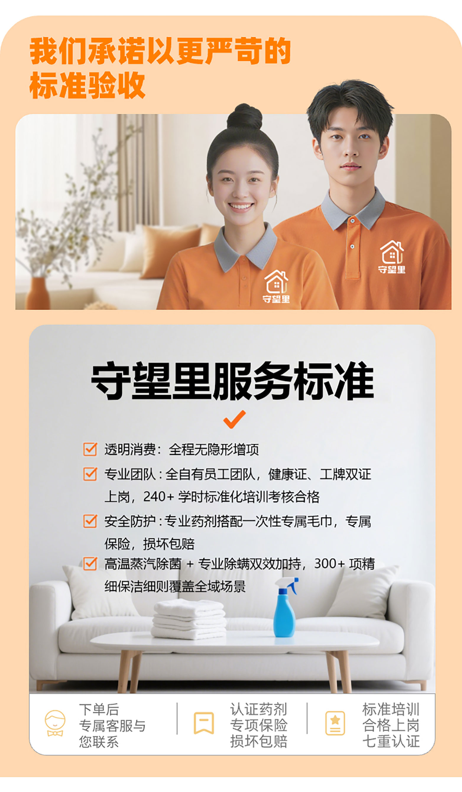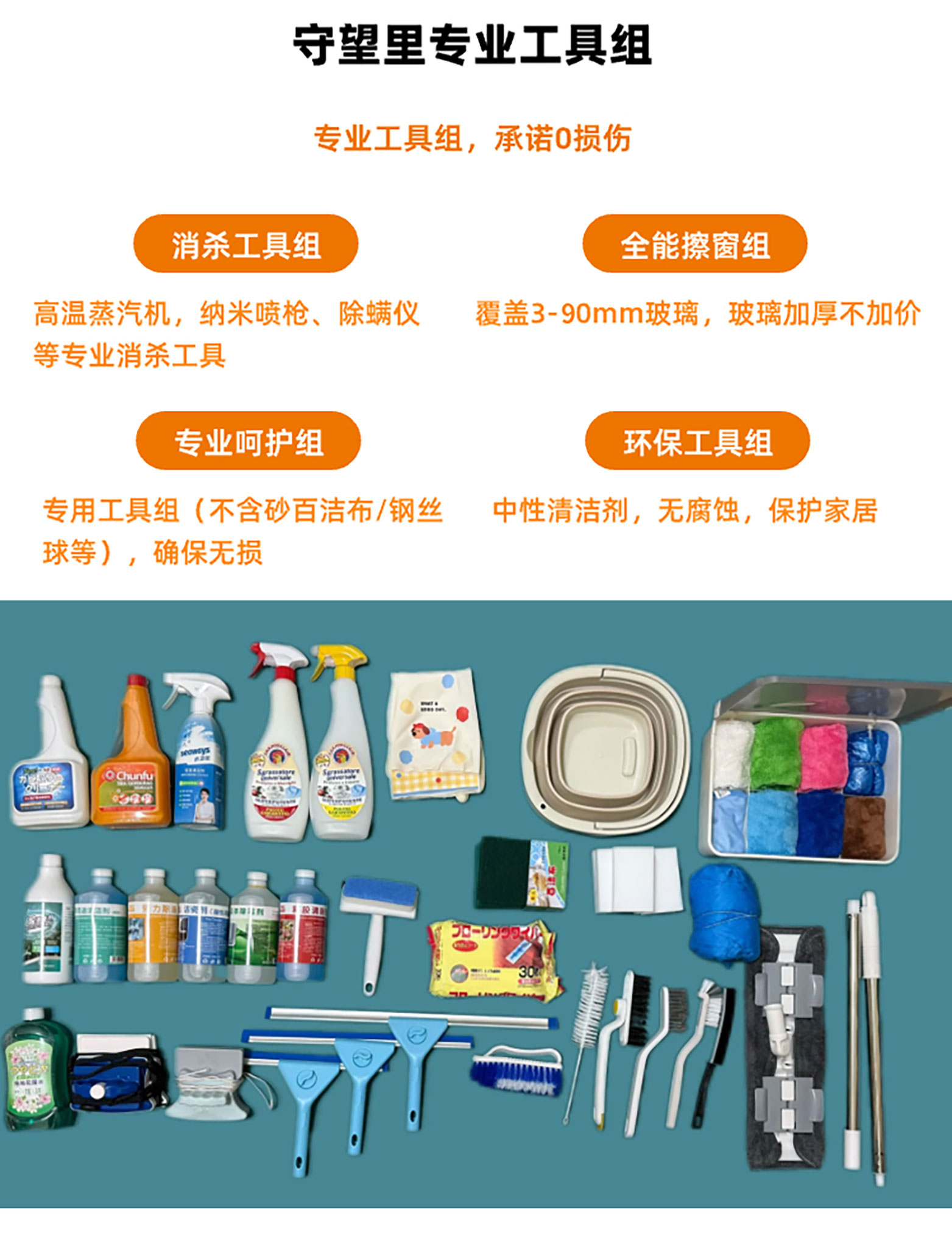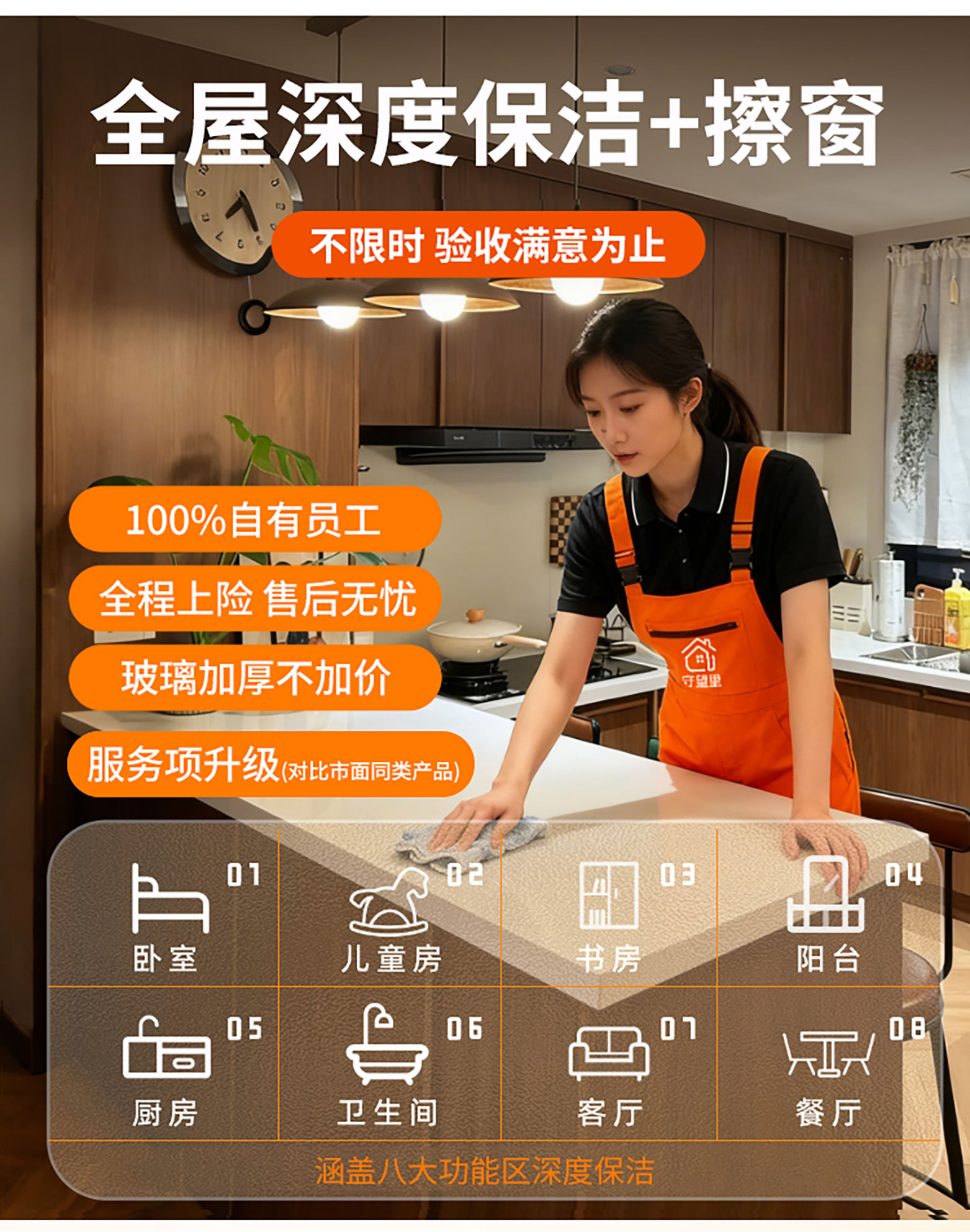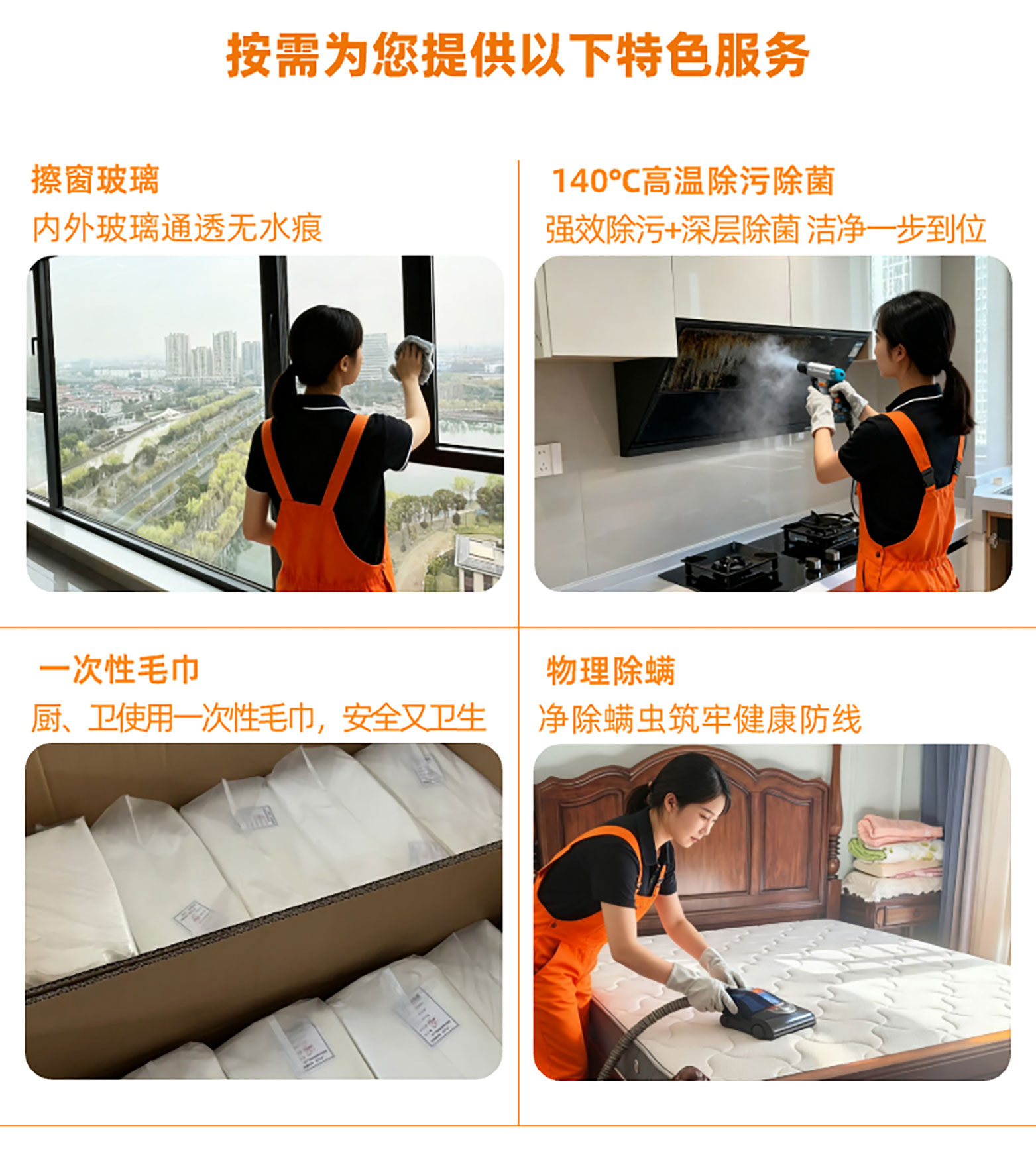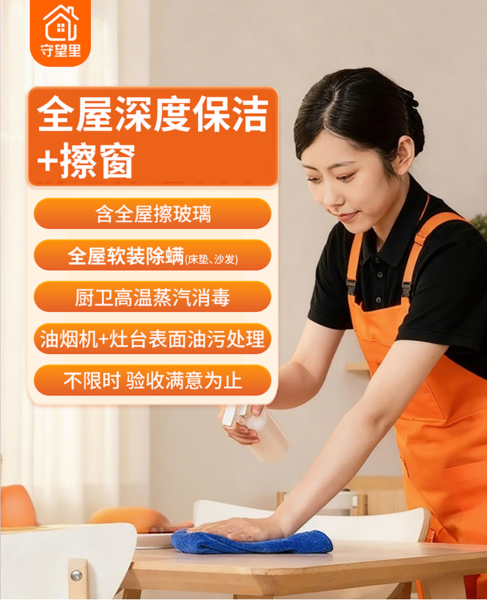 2、含全屋擦玻璃:内外窗、窗框窗槽、纱窗清洁(纱窗要拧螺丝的不拆,可擦内部表面)、内饰门玻璃。