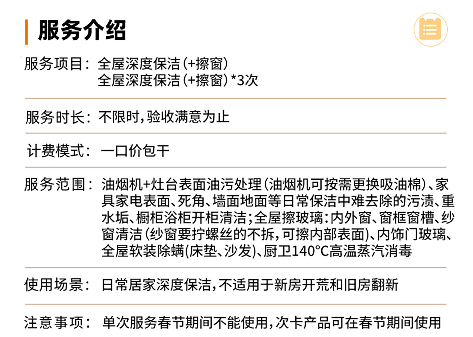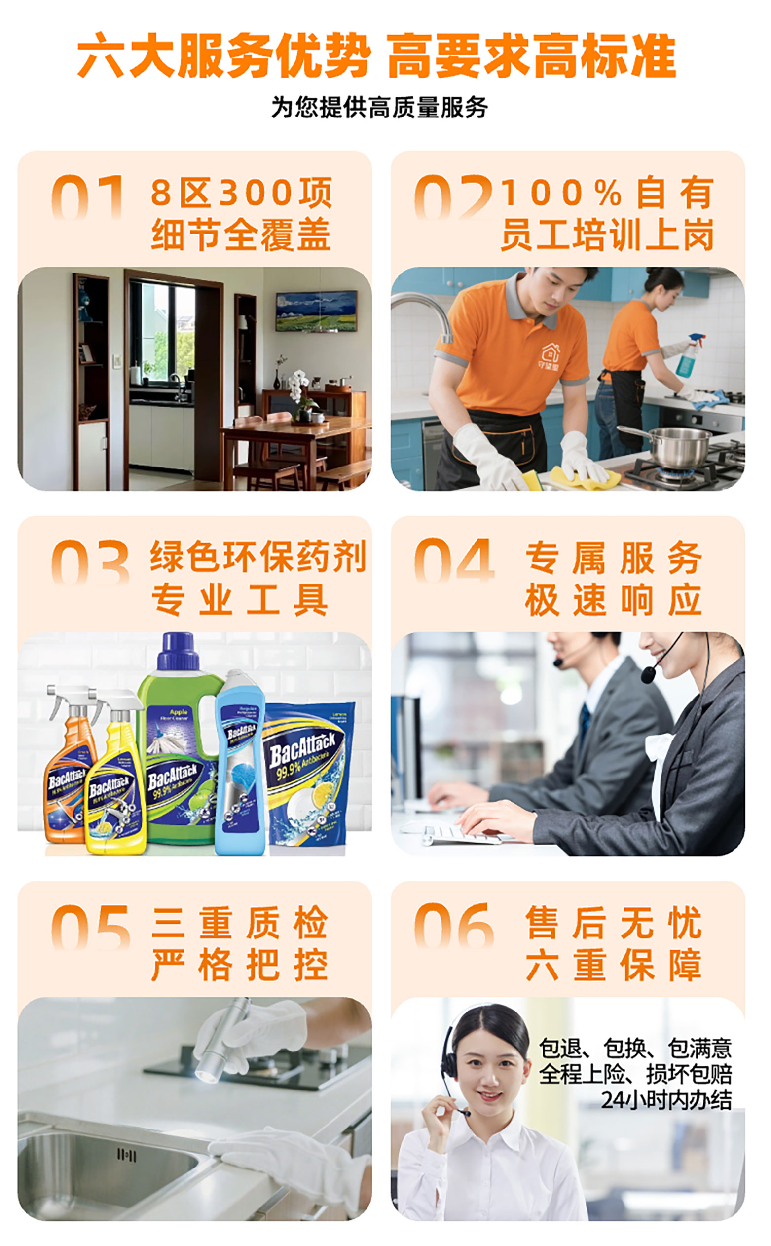 1、油烟机+灶台表面油污处理(油烟机可按需更换吸油棉)、家具家电表面、死角、墙面地面等日常保洁中难去除的污渍、重水垢、橱柜浴柜开柜清洁。