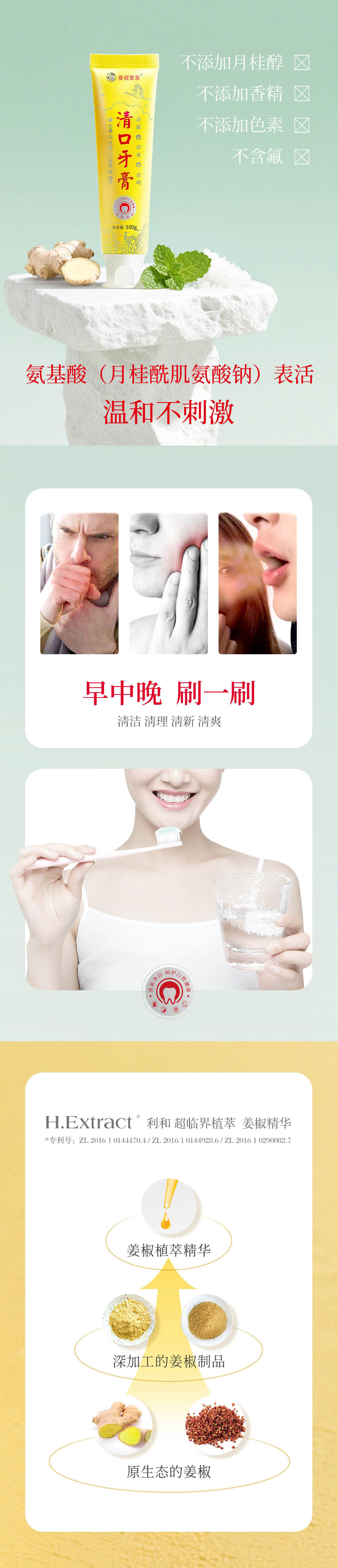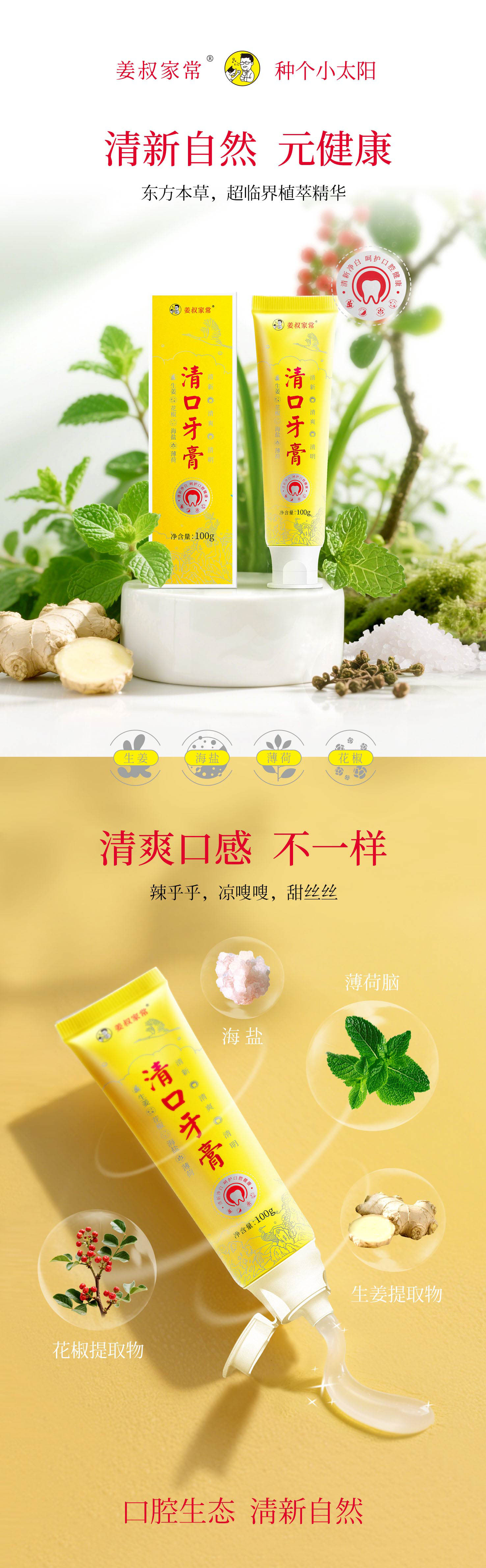 姜叔家常清口牙膏清新口气古老本草植萃生姜花椒精华薄荷海盐无氟