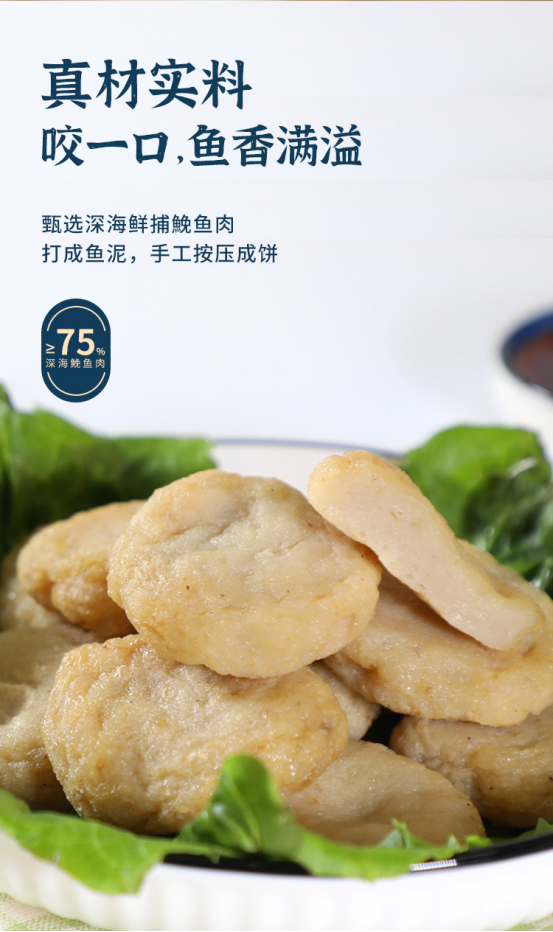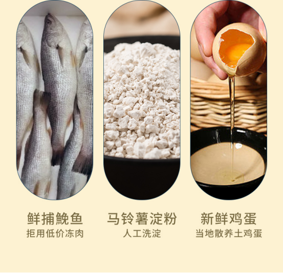 ✅ 好原料造就好口感 市面上的鱼饼千万种,如果去温州菜市场转一圈,鱼饼可以从四五块一斤卖到几百元一斤,先不说口味 光形态制作工艺都天差地别,可以死鱼烂鱼加大量添加剂做,也可以大量用粉添加极少的鱼肉做,甚至用鸡肉去替代。 日根结底,就是原材料的差别。 鱼饼毫无腥味,是因为鱼肉新鲜。选用深海新鲜度相当高的鮸鱼,鱼肉紧致,一点都不腥肉质丝丝甜